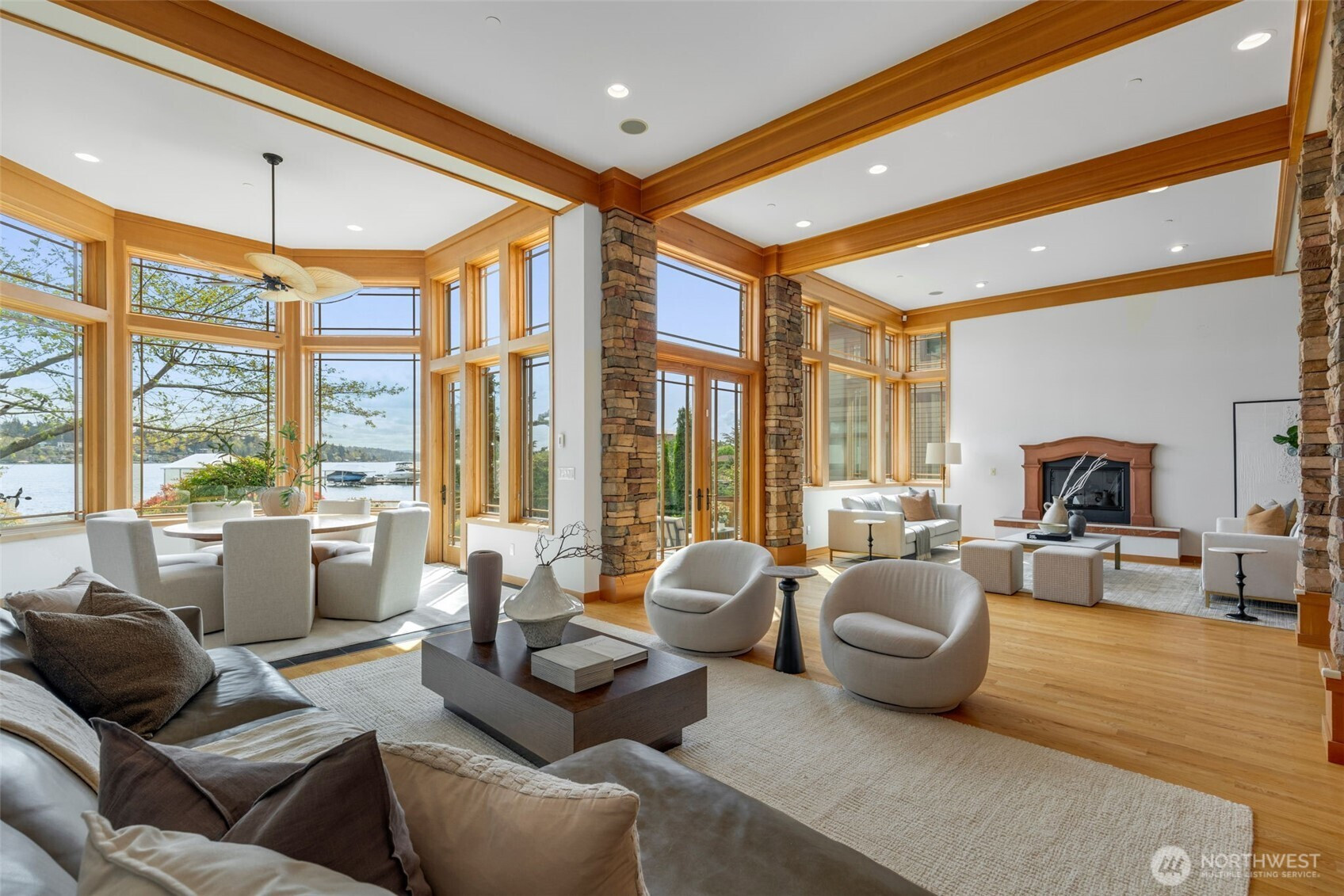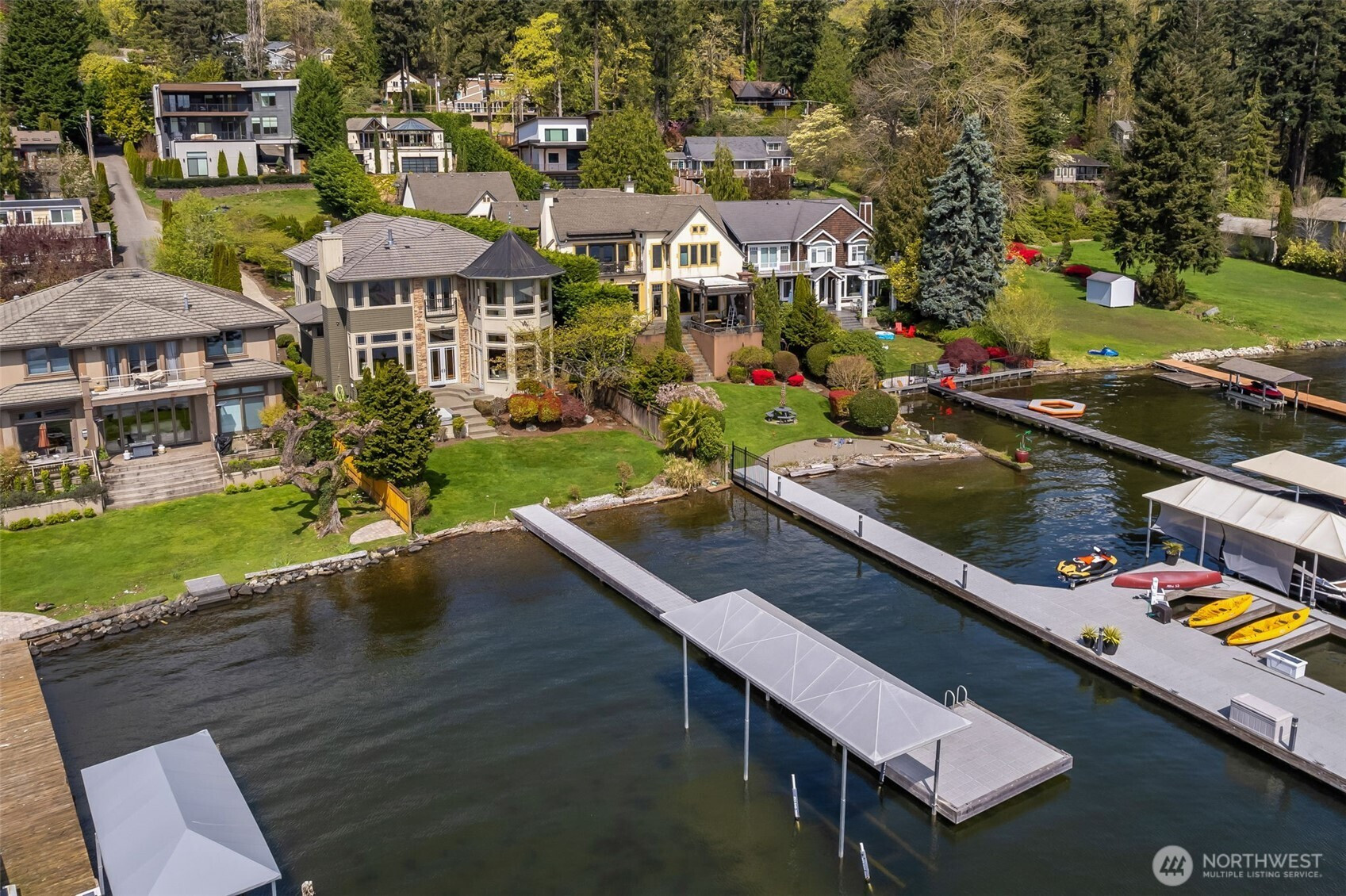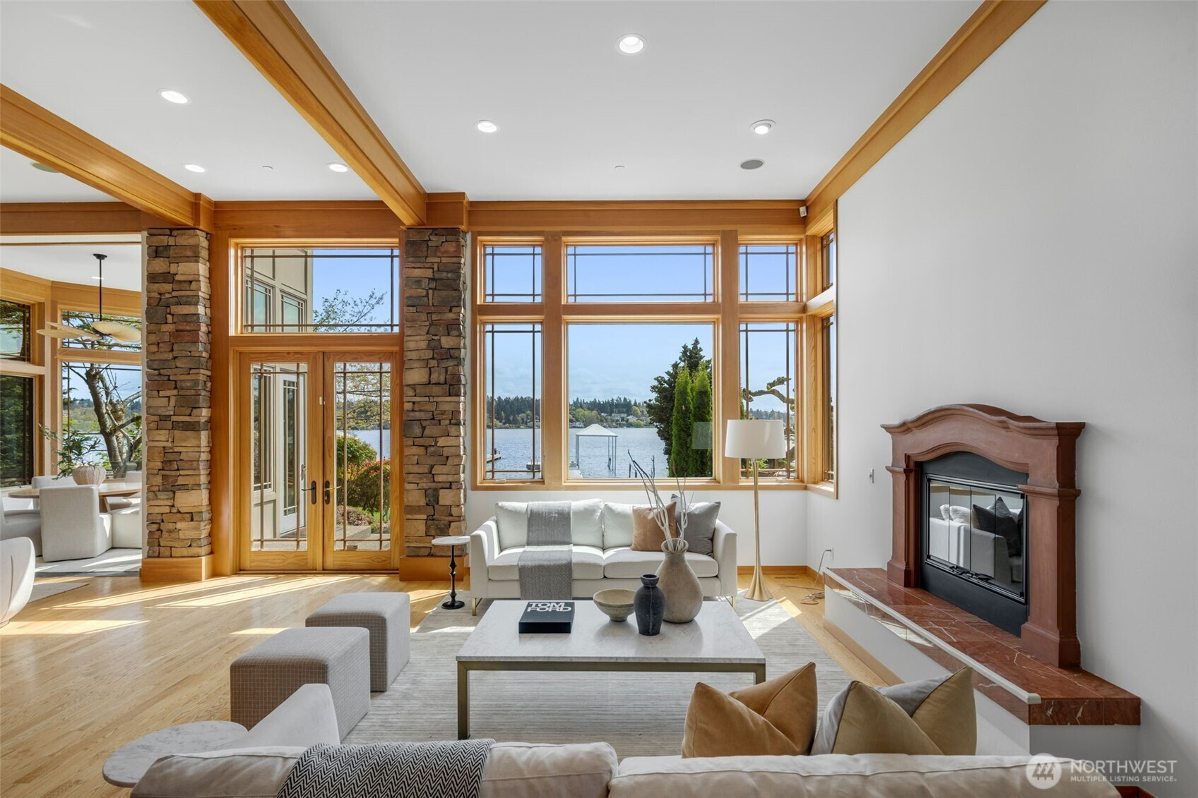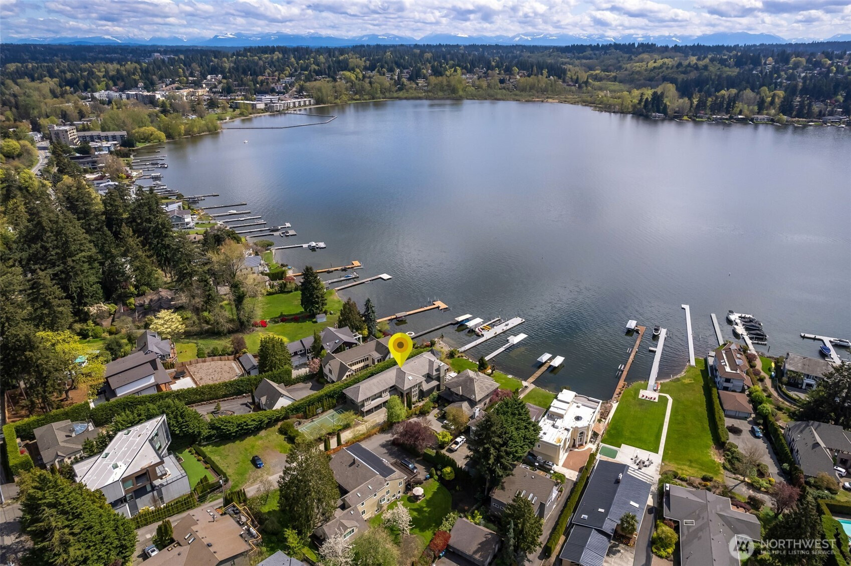 Experience the pinnacle of beachfront living in this architectural masterpiece. Designed to harmonize with the serene tranquility of Juanita Bay, this home offers a front-row seat to spectacular, unobstructed views of Mt. Rainier. Massive walls of windows flood the living spaces with natural light, blurring the line between the indoors and the shimmering lake. high-end culinary suite designed to inspire the most discerning chefs. Rich, substantial finishes and a palette of warm camel hues create an atmosphere of effortless, natural elegance. The space over the garage includes two guest bedrooms and a kitchen with a dedicated dining area. New A/C replaced in 2020. Dock resurfaced in 2022 with permit. Installed Golden lift with 48" of range and new canopy in 2022. Whole room new painting in 2026. This isn't just a home; it's a private resort. Every detail has been curated for a lifestyle of leisure and convenience: