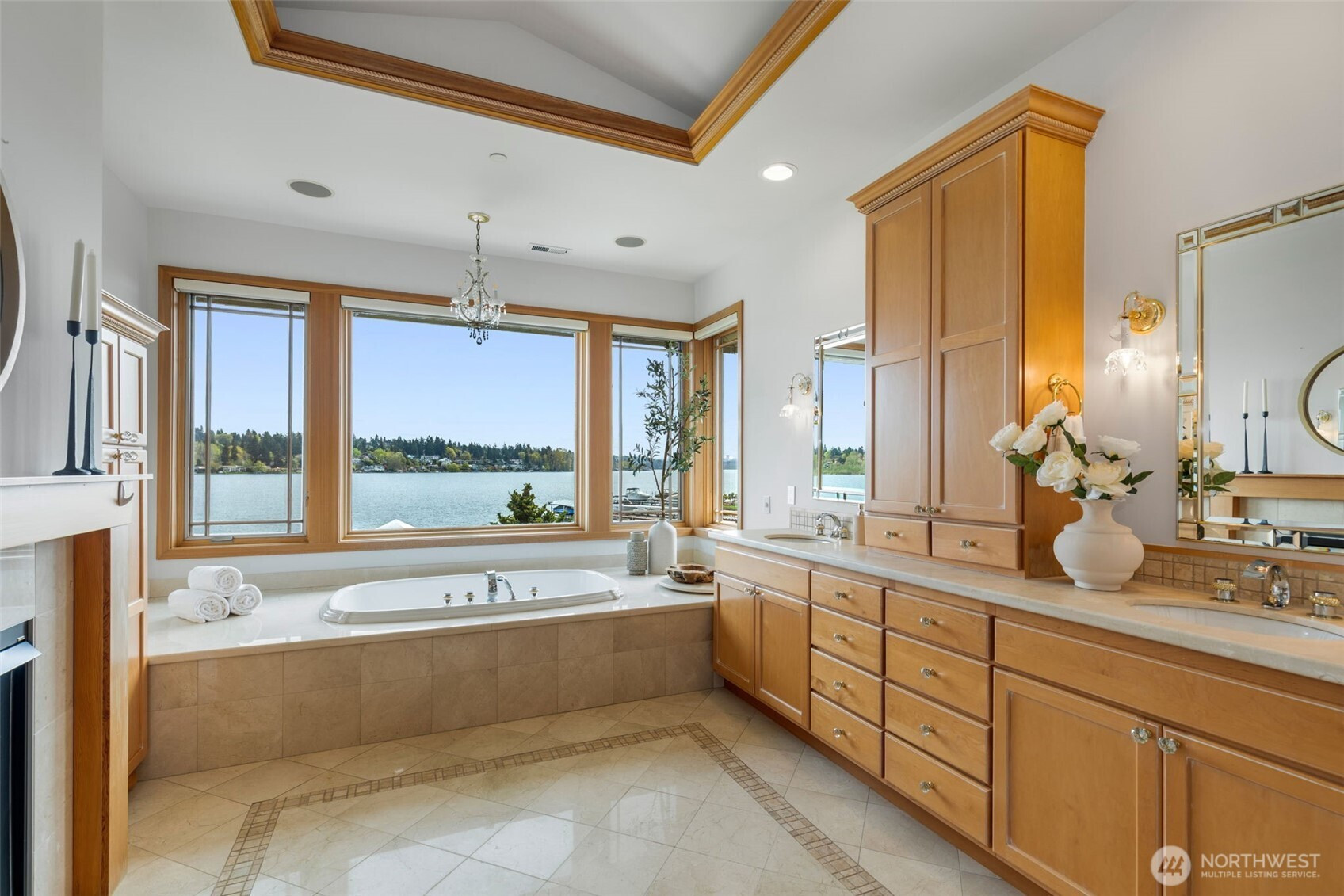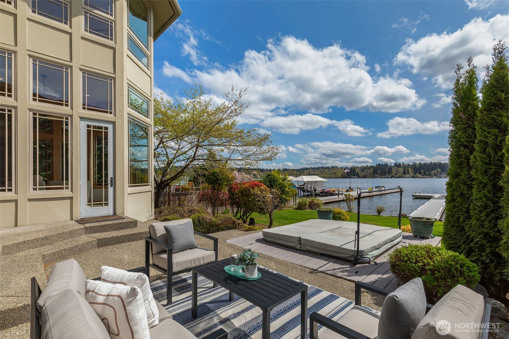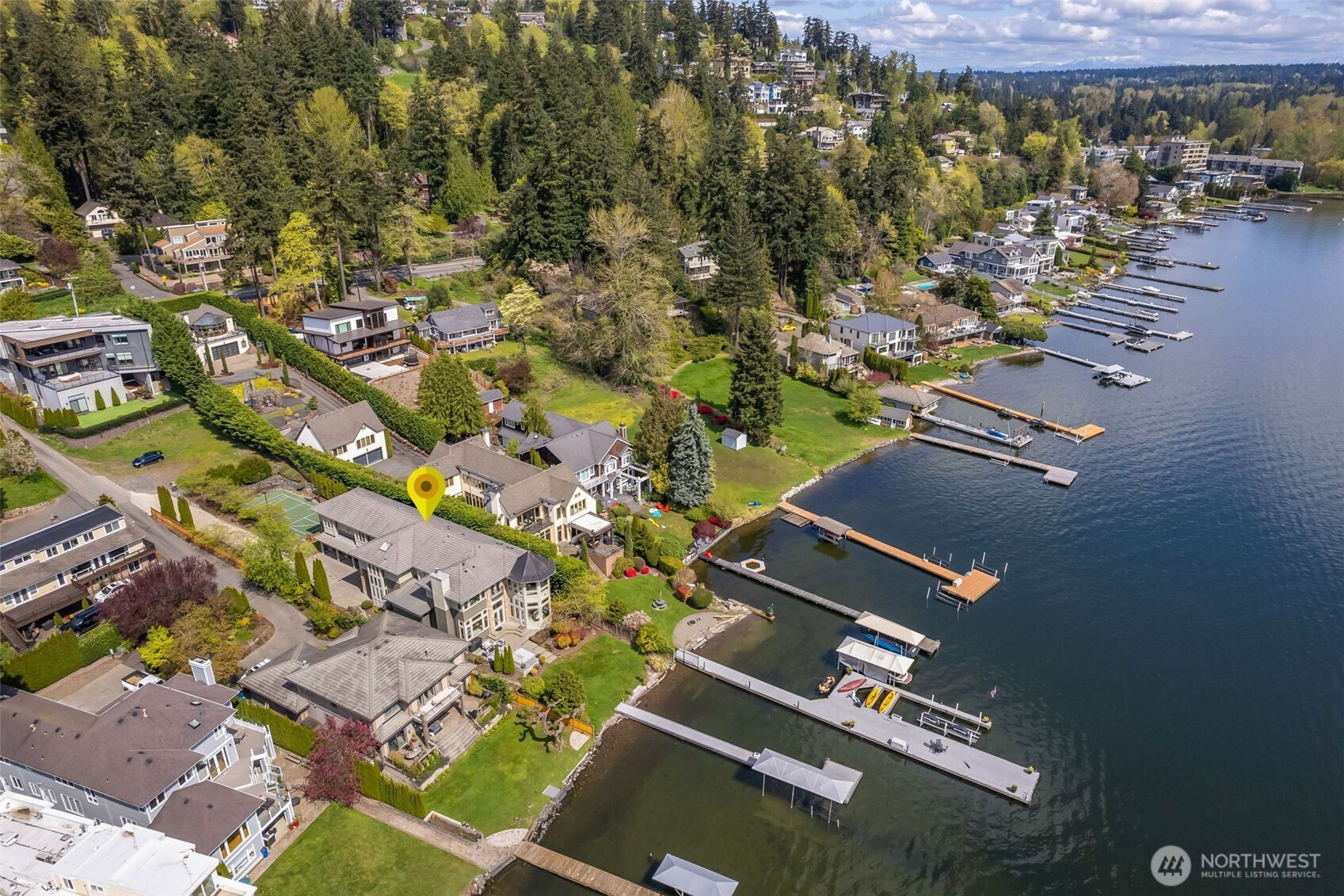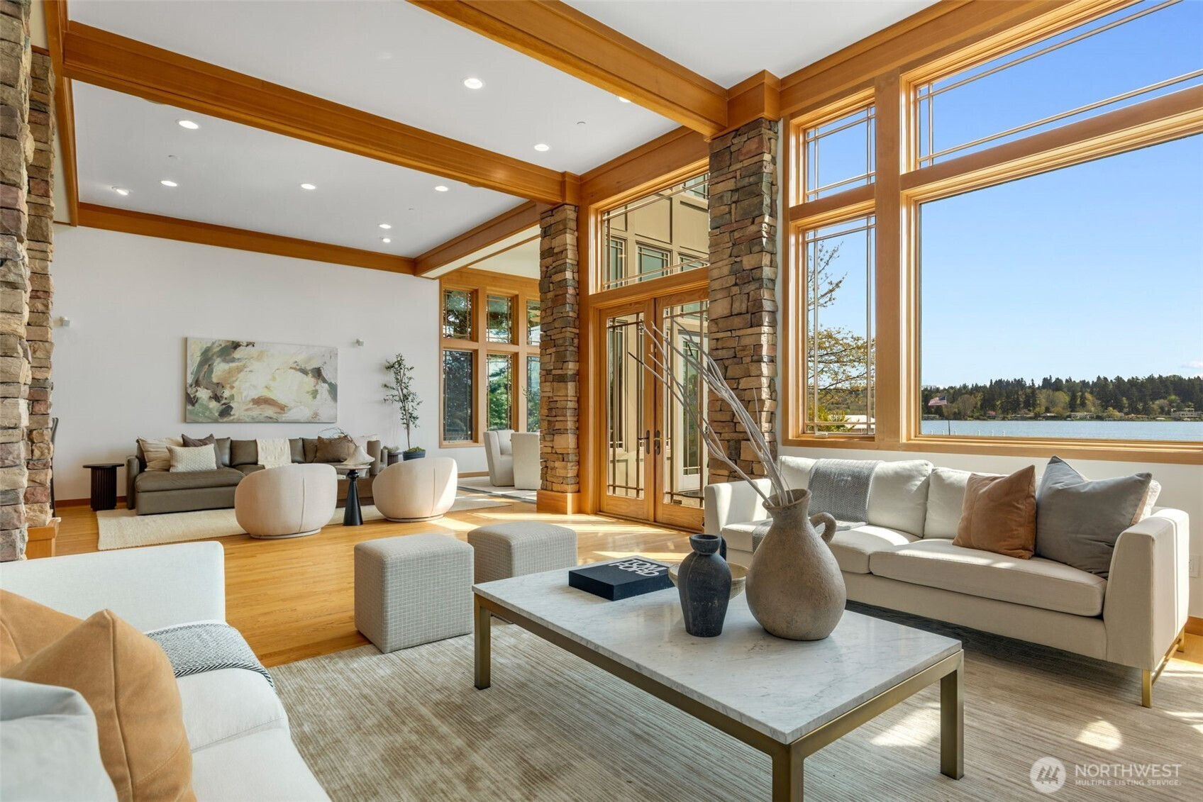 Experience the pinnacle of beachfront living in this architectural masterpiece. Designed to harmonize with the serene tranquility of Juanita Bay, this home offers a front-row seat to spectacular, unobstructed views of Mt. Rainier. Massive walls of windows flood the living spaces with natural light, blurring the line between the indoors and the shimmering lake. high-end culinary suite designed to inspire the most discerning chefs. Rich, substantial finishes and a palette of warm camel hues create an atmosphere of effortless, natural elegance. The space over the garage includes two guest bedrooms and a kitchen with a dedicated dining area. New A/C replaced in 2020. Dock resurfaced in 2022 with permit. Installed Golden lift with 48" of range and new canopy in 2022. Whole room new painting in 2026. This isn't just a home; it's a private resort. Every detail has been curated for a lifestyle of leisure and convenience: