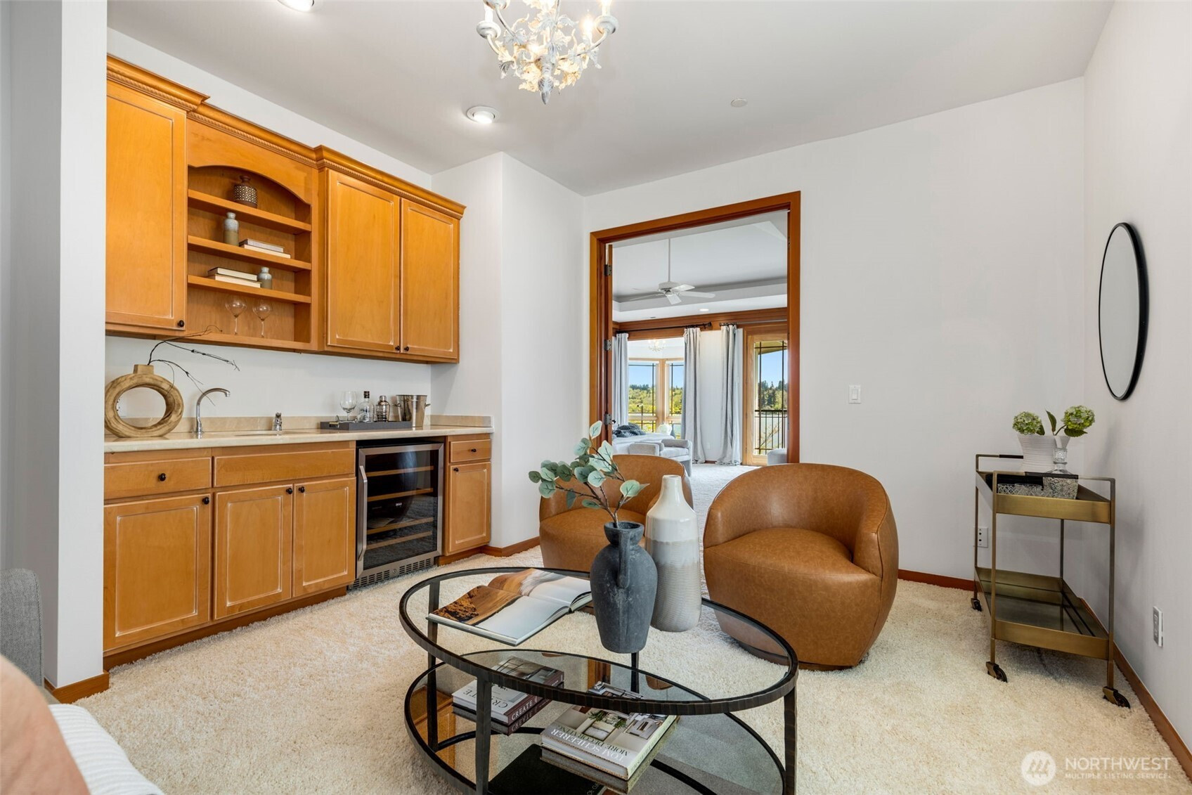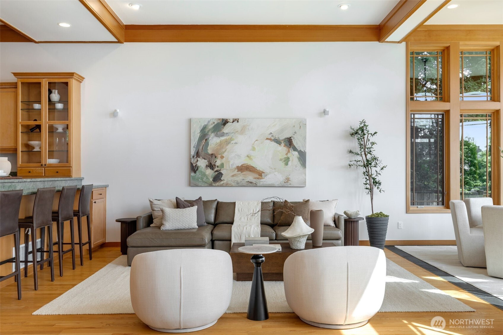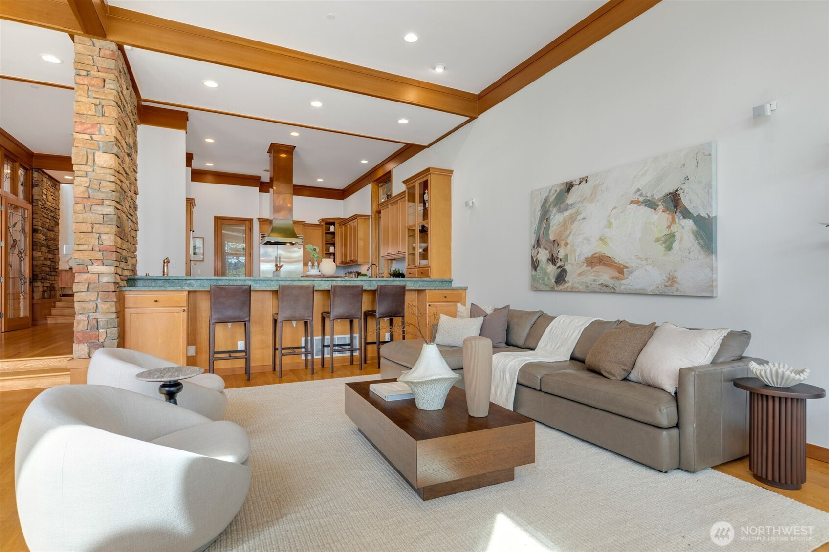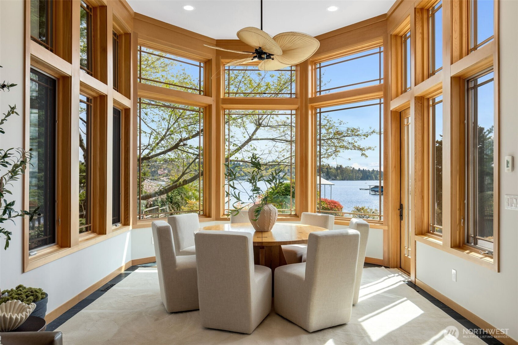 Experience the pinnacle of beachfront living in this architectural masterpiece. Designed to harmonize with the serene tranquility of Juanita Bay, this home offers a front-row seat to spectacular, unobstructed views of Mt. Rainier. Massive walls of windows flood the living spaces with natural light, blurring the line between the indoors and the shimmering lake. high-end culinary suite designed to inspire the most discerning chefs. Rich, substantial finishes and a palette of warm camel hues create an atmosphere of effortless, natural elegance. The space over the garage includes two guest bedrooms and a kitchen with a dedicated dining area. New A/C replaced in 2020. Dock resurfaced in 2022 with permit. Installed Golden lift with 48" of range and new canopy in 2022. Whole room new painting in 2026. This isn't just a home; it's a private resort. Every detail has been curated for a lifestyle of leisure and convenience: