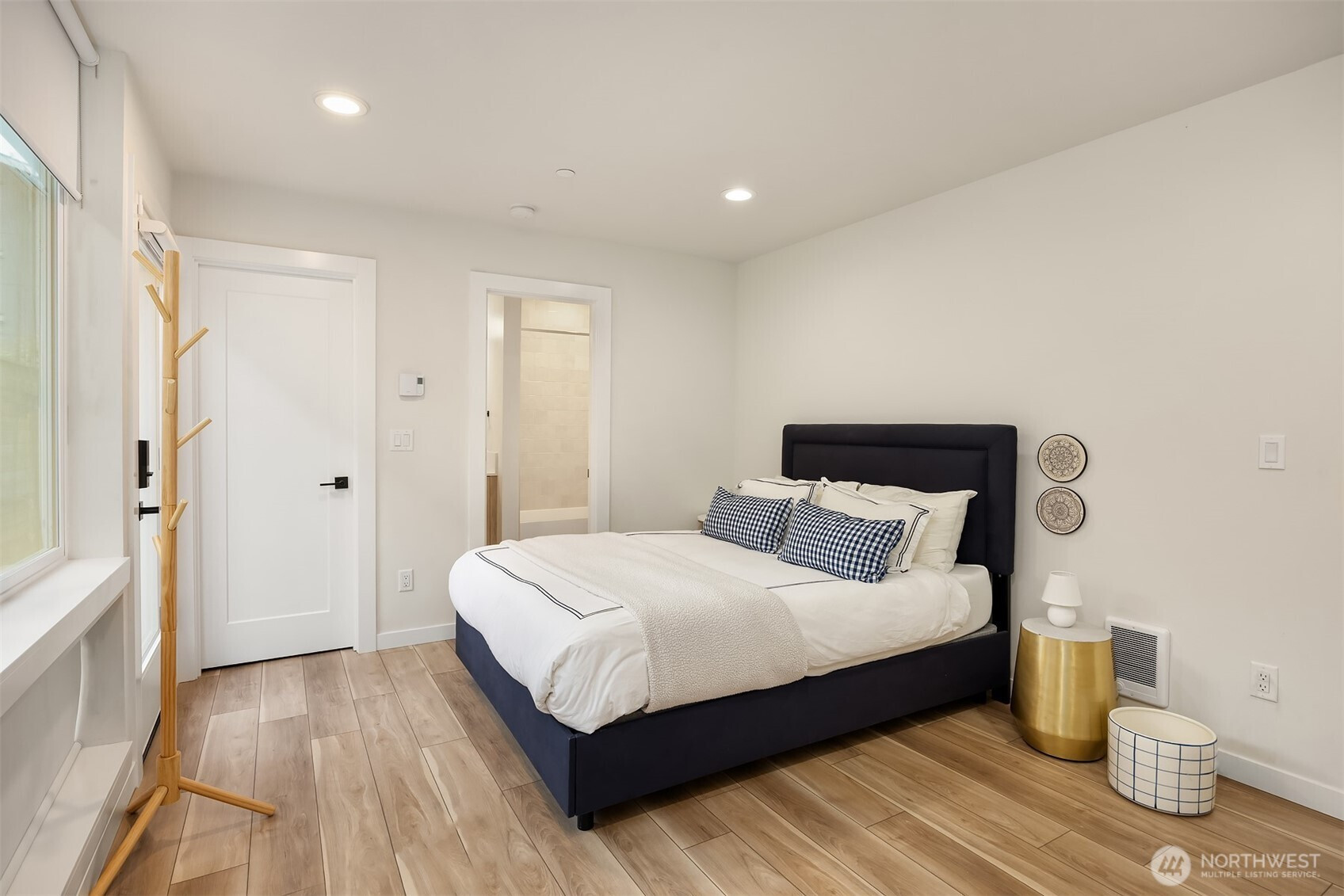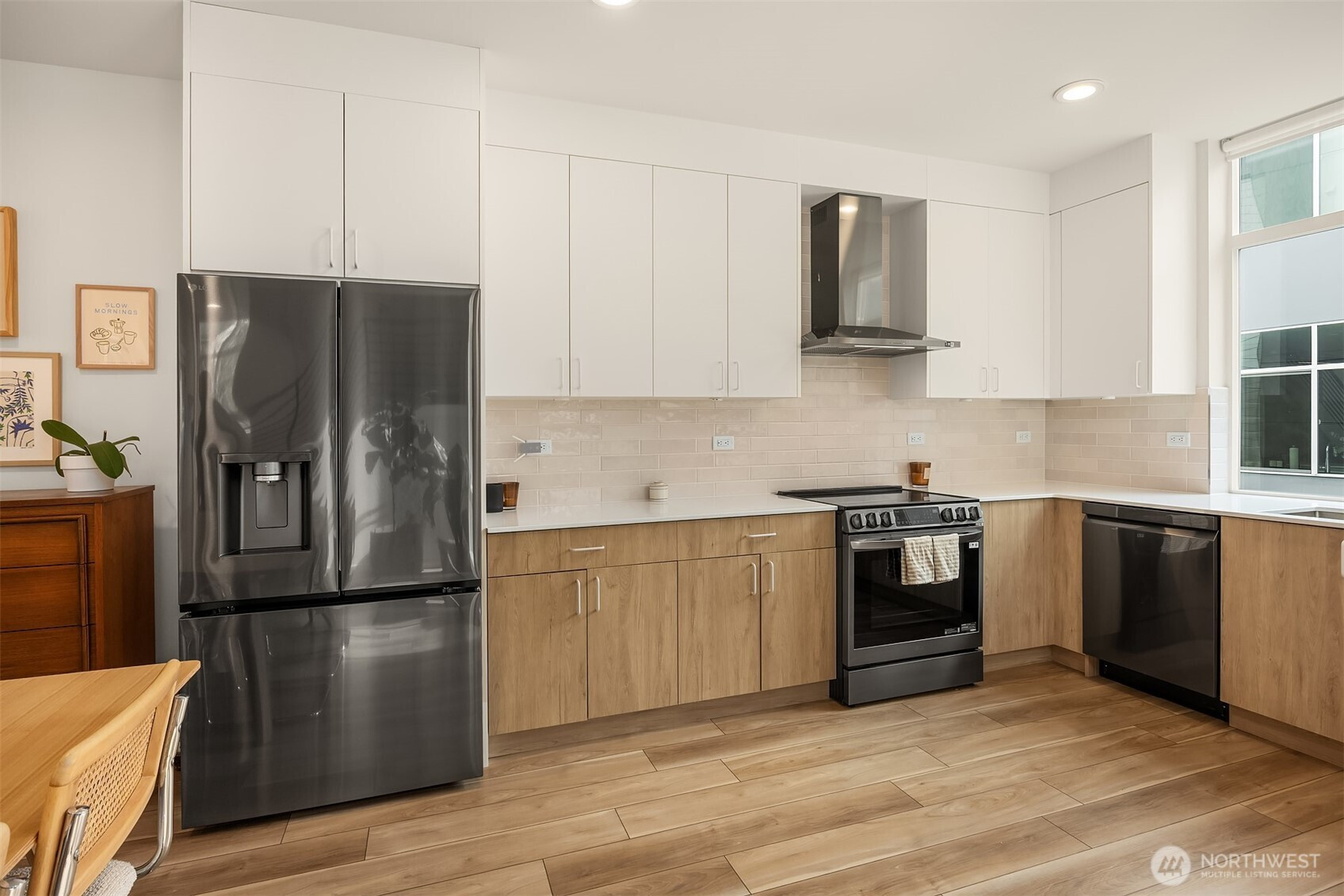 Like new and barely lived in, this Greencity-built modern abode offers 3 bedrooms and 3 bathrooms in a boutique community. Ideally located in the heart of Greenwood, this light-filled home features a private-entry ADU on the lower level with a full bath, kitchen, and separate entrance. No HOA and no rental cap. Enjoy the huge rooftop deck with Mt. Rainier and Green Lake views, a spacious front patio, and an attached garage with an EV charger. Oversized picture windows fill every room with natural light, complemented by a $12,000 upgrade in premium Hunter Douglas shades throughout. The distinctive epicurean kitchen features high-end stainless-steel appliances, polished quartz countertops, and generous storage. Excellent location near Greenwood Park, Green Lake, PCC Market, Monkey Grind Espresso, neighborhood dining, and just minutes to Ballard.