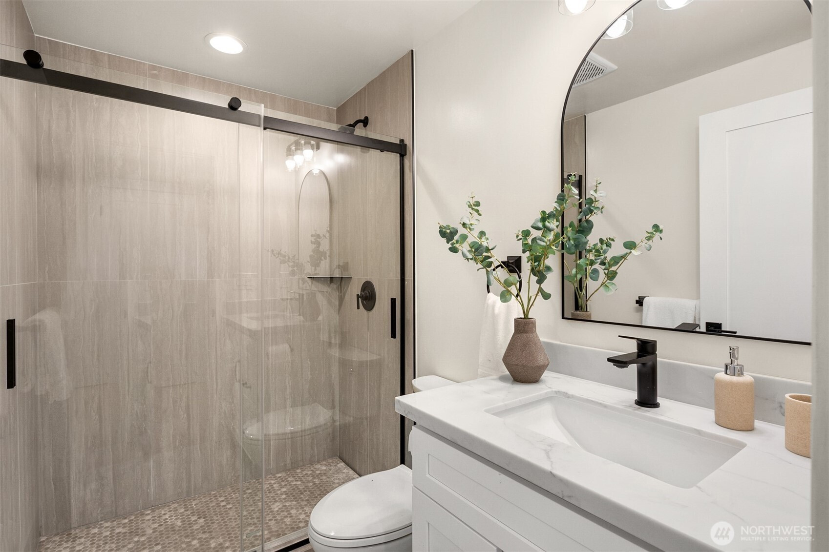 Stunning, like new with effective year built 2026, offering effortless one-level living in the heart of Finn Hill. This beautifully updated rambler features a bright, open layout filled with natural light. Engineered hardwood floors run throughout, creating a seamless and modern feel. All living spaces are conveniently situated on one level for comfort and functionality. The spacious living areas flow effortlessly for everyday living and entertaining. The primary suite features a thoughtfully updated bath, while the kitchen stands out with quartz countertops, an under-mount sink, and stainless steel appliances. Located within highly regarded Kirkland schools and just minutes to parks.