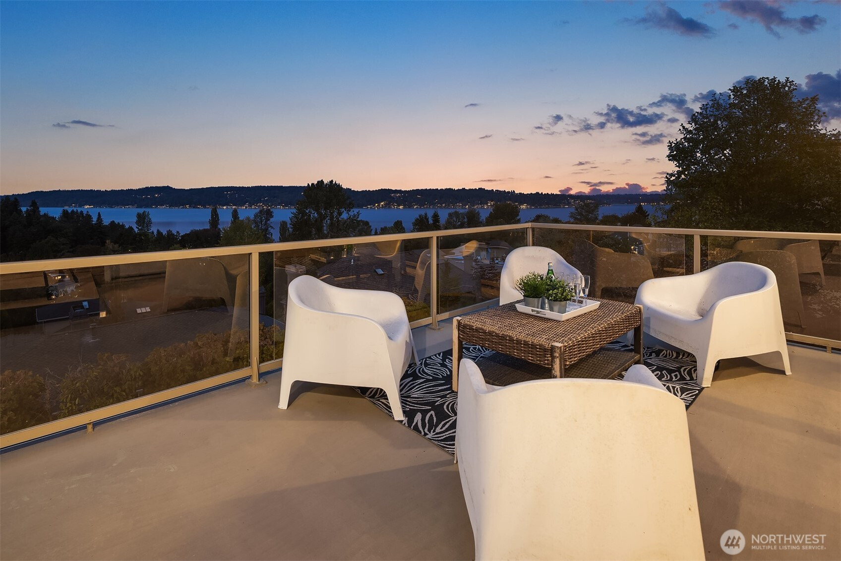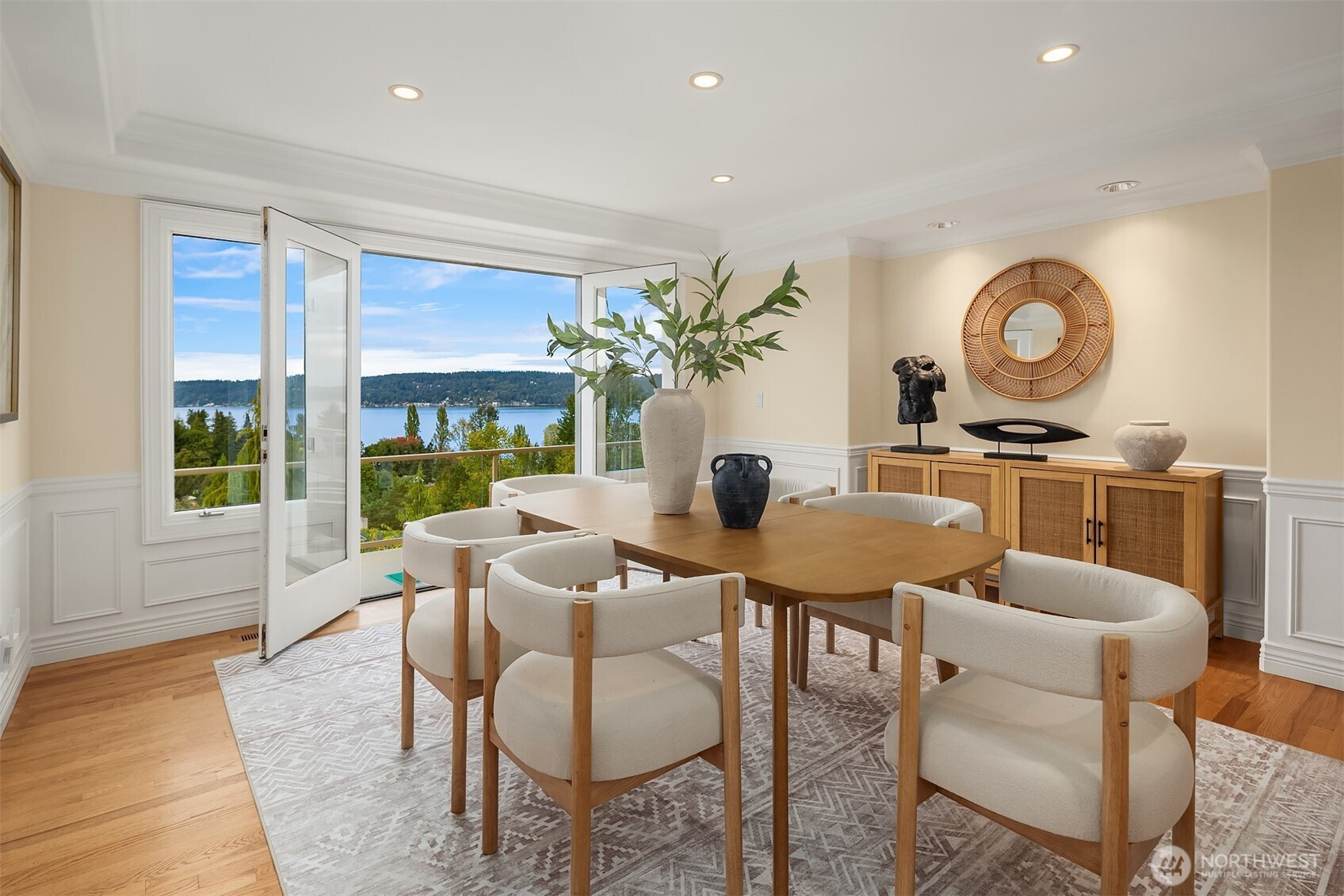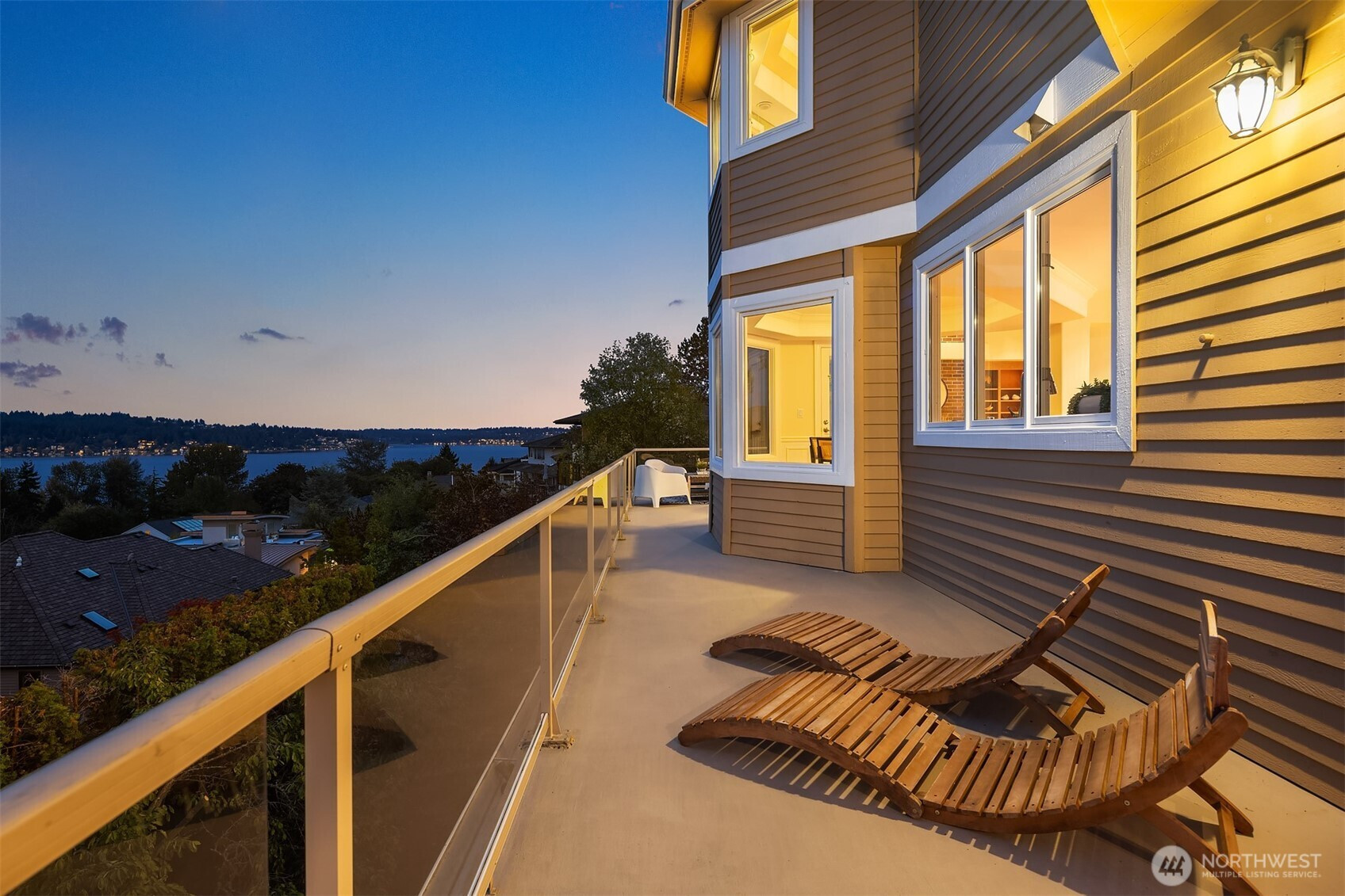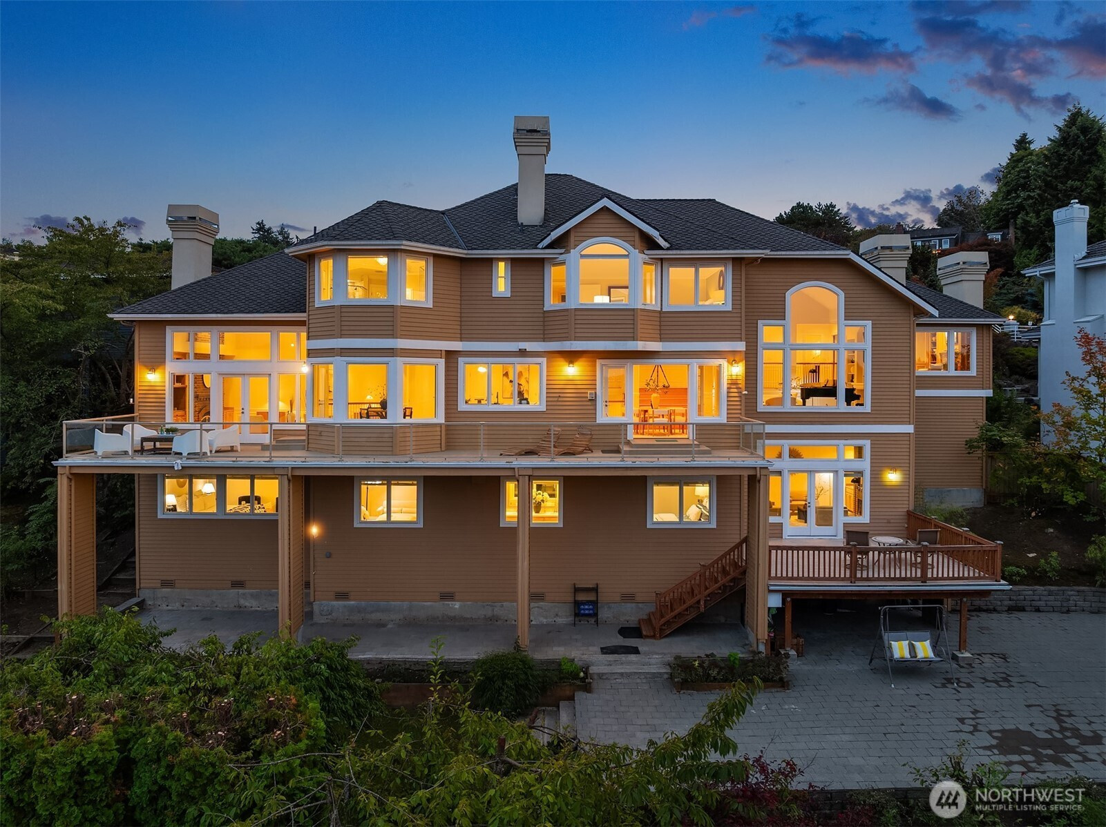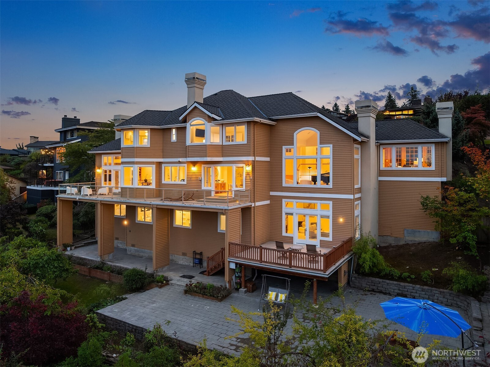 Perched above Lake Washington in highly desirable Inverness neighborhood, this NW contemporary residence showcases stunning panoramic views from nearly every room. Sunlight fills open-concept living spaces through expansive floor-to-ceiling windows & soaring ceilings. Timeless layout flows from elegant living room to formal dining room. Gourmet kitchen opens to spacious family room. Upstairs, luxurious primary suite & additional en-suite bedroom. Lower level offers generous bonus room, 3 view-filled bedrooms & 2 more baths. Extensive millwork & built-ins throughout. Enjoy expansive view decks & low-maintenance private backyard. Dual-zone HVAC, 5 gas fireplaces & 3-car garage. Close to B-G Trail, parks, Seattle Children’s, U Village & UW.