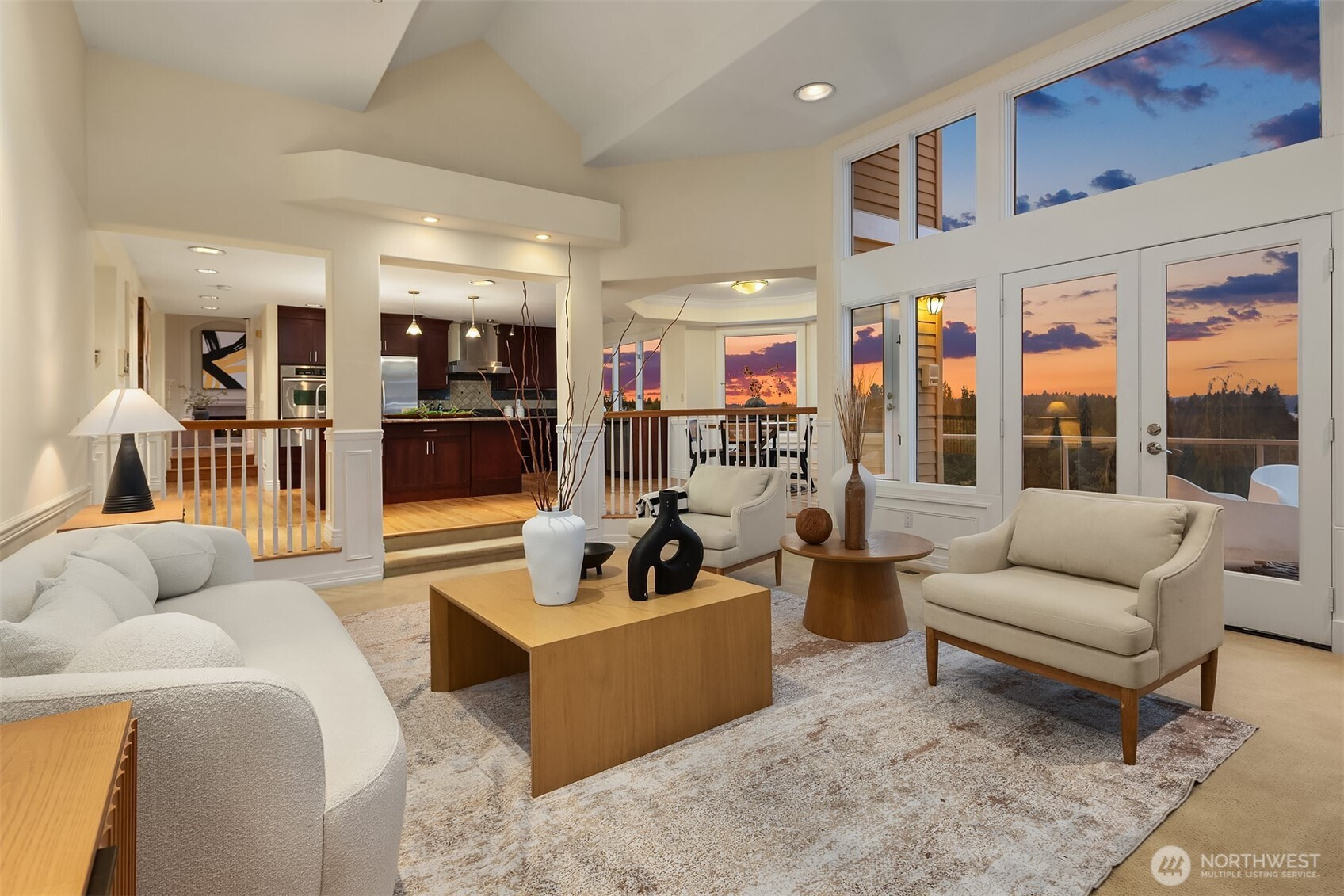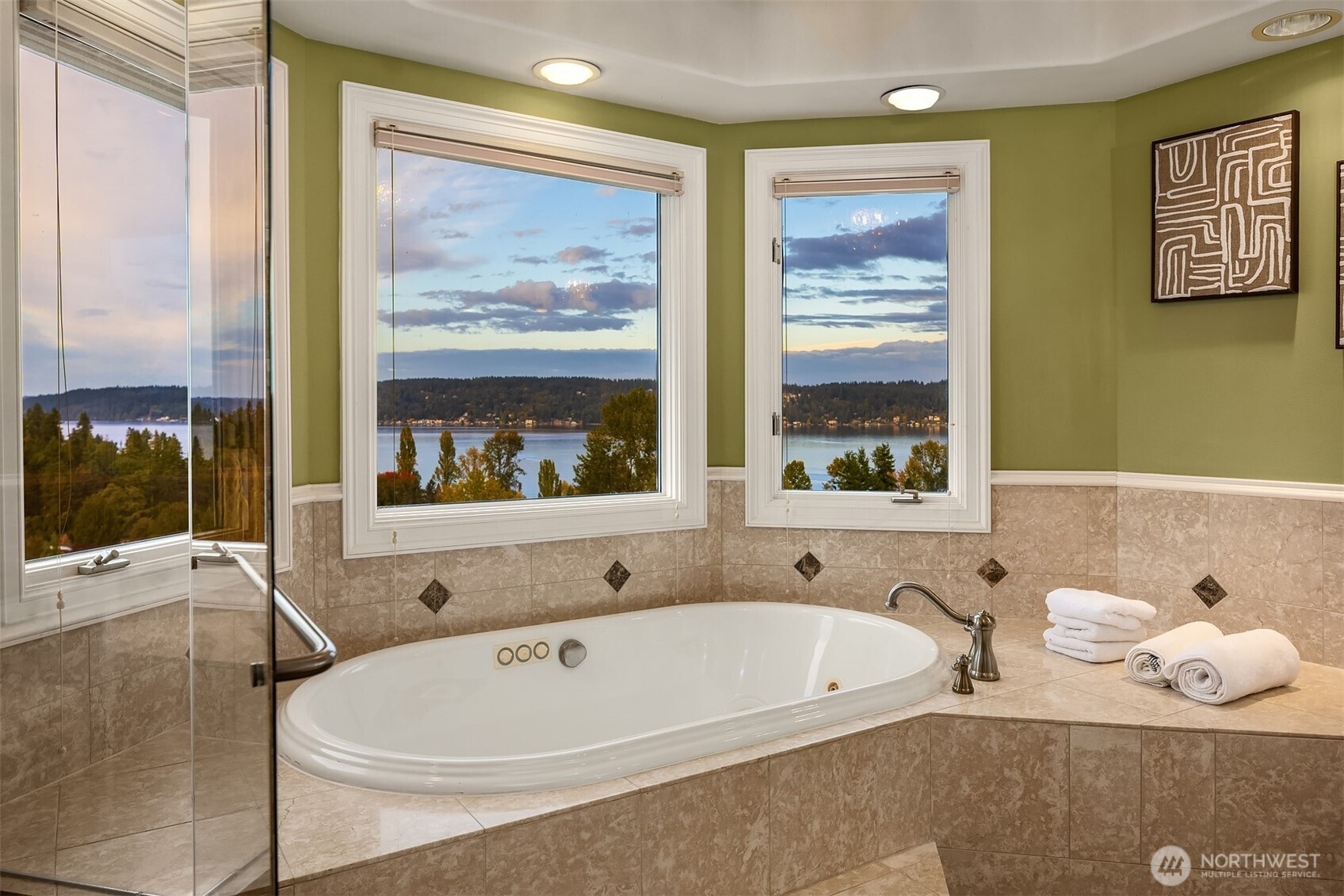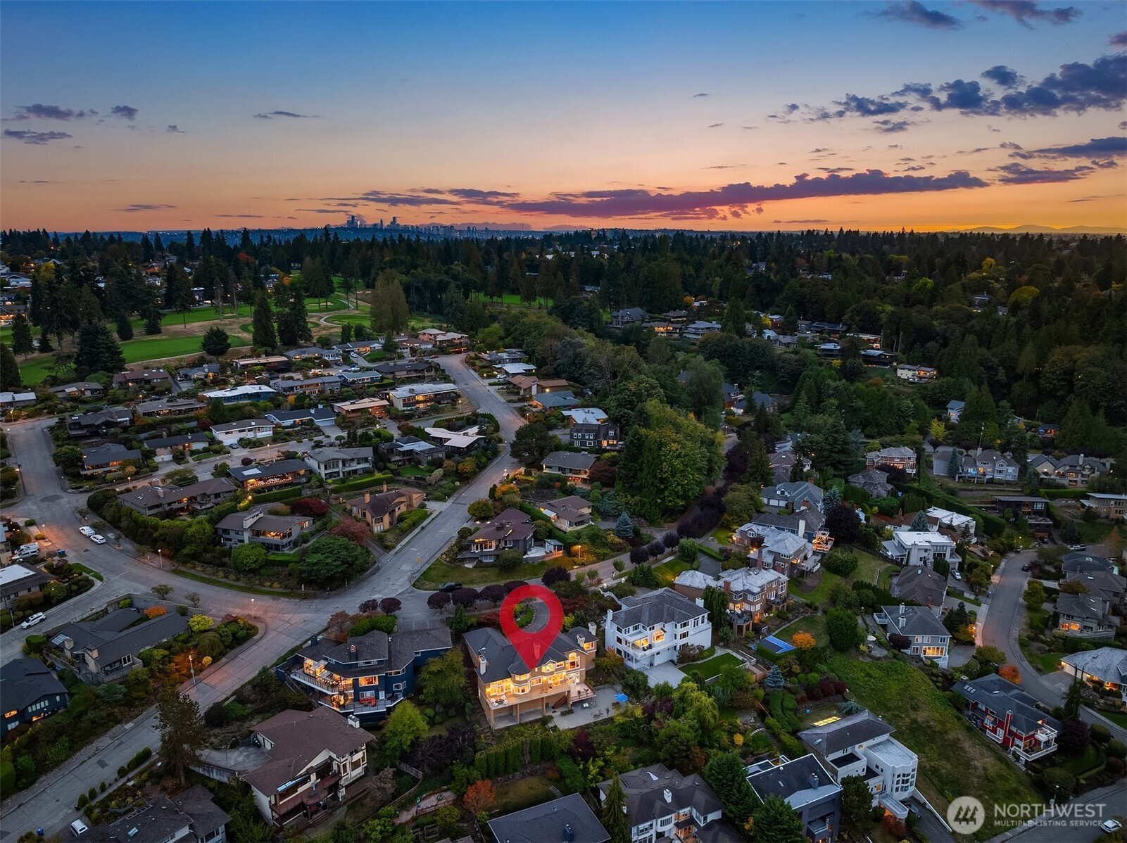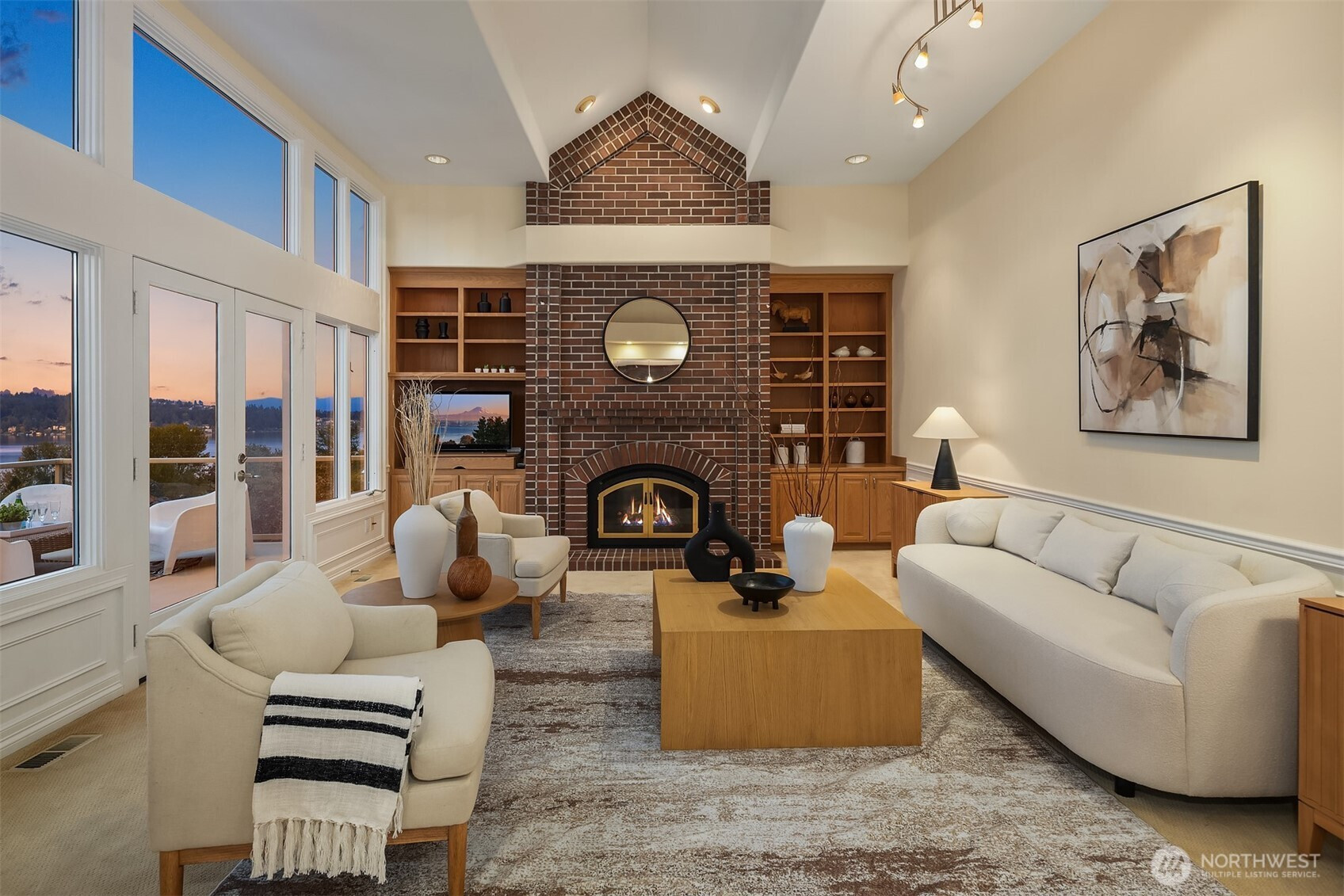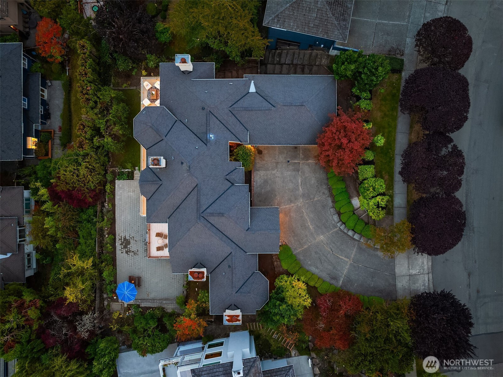 Perched above Lake Washington in highly desirable Inverness neighborhood, this NW contemporary residence showcases stunning panoramic views from nearly every room. Sunlight fills open-concept living spaces through expansive floor-to-ceiling windows & soaring ceilings. Timeless layout flows from elegant living room to formal dining room. Gourmet kitchen opens to spacious family room. Upstairs, luxurious primary suite & additional en-suite bedroom. Lower level offers generous bonus room, 3 view-filled bedrooms & 2 more baths. Extensive millwork & built-ins throughout. Enjoy expansive view decks & low-maintenance private backyard. Dual-zone HVAC, 5 gas fireplaces & 3-car garage. Close to B-G Trail, parks, Seattle Children’s, U Village & UW.