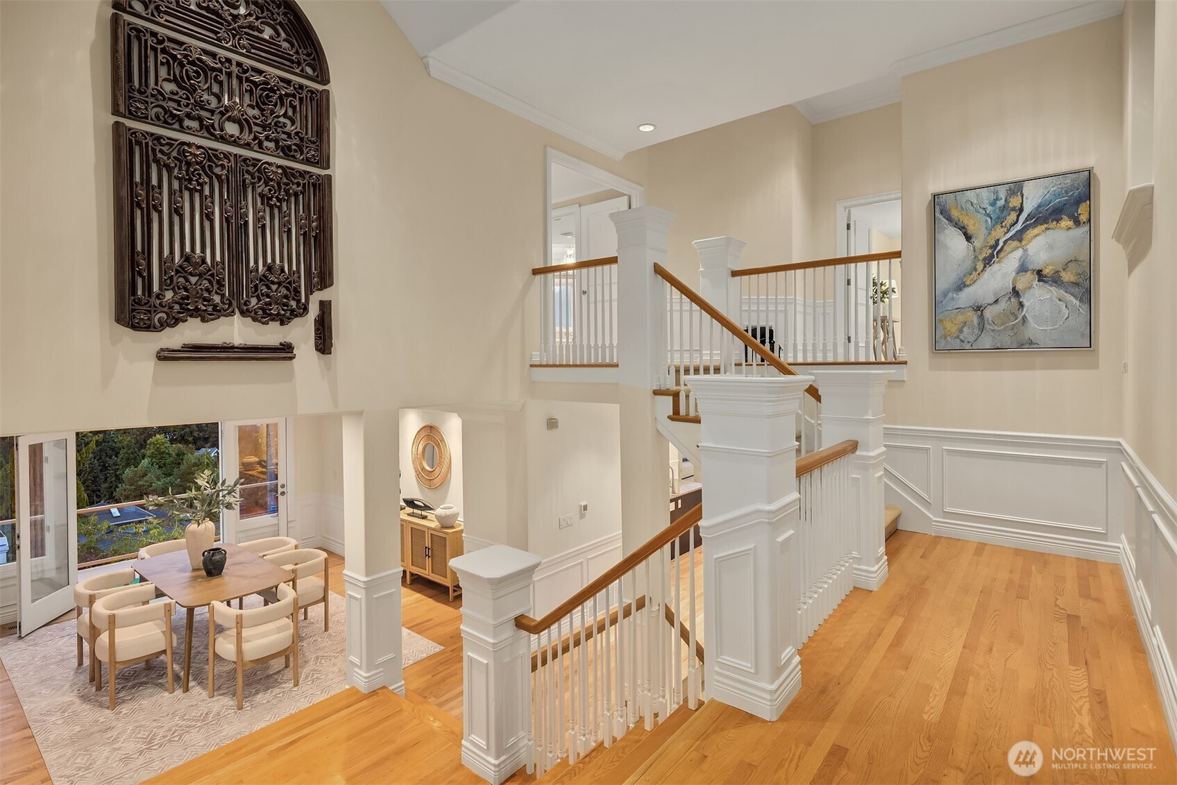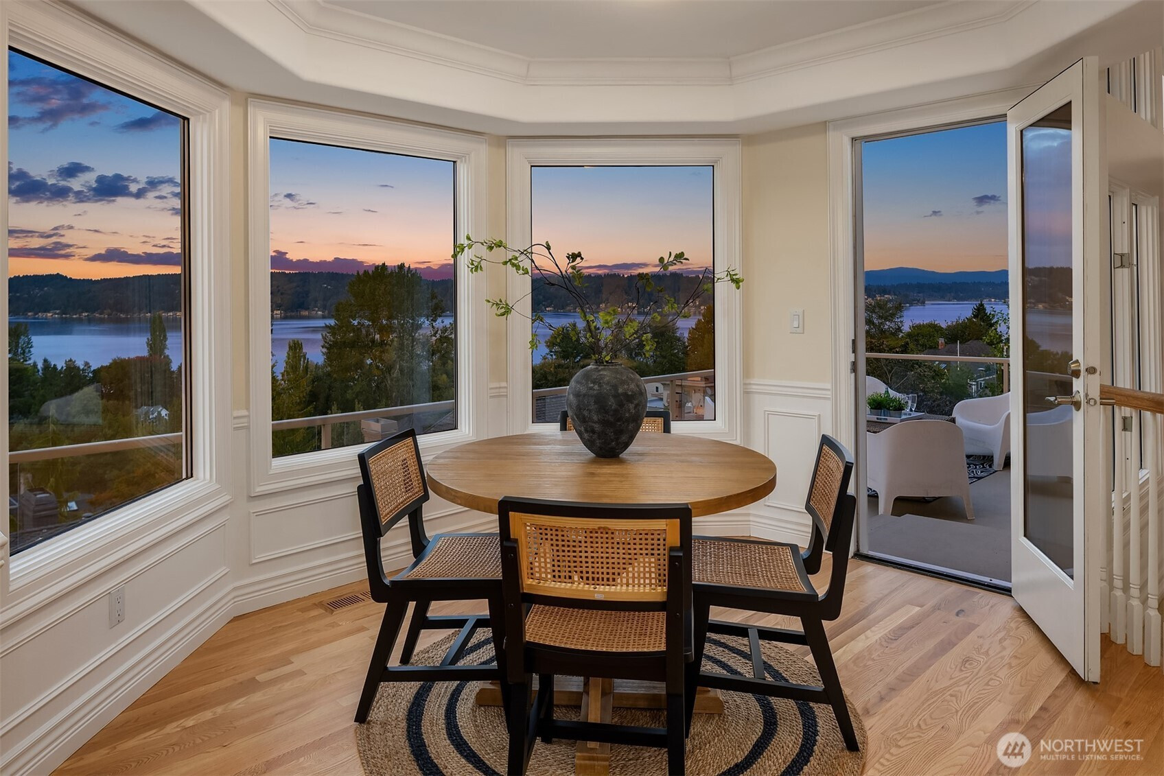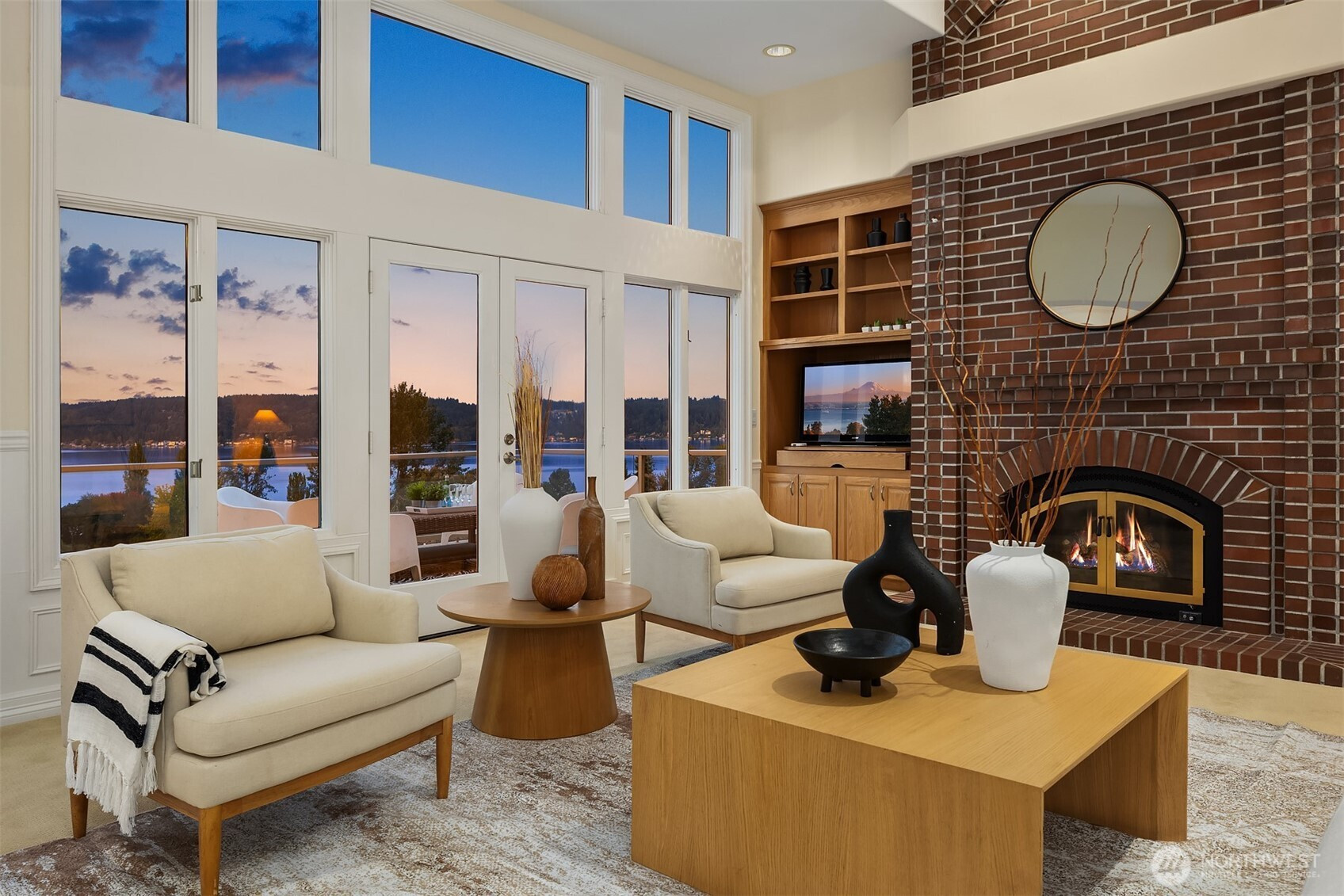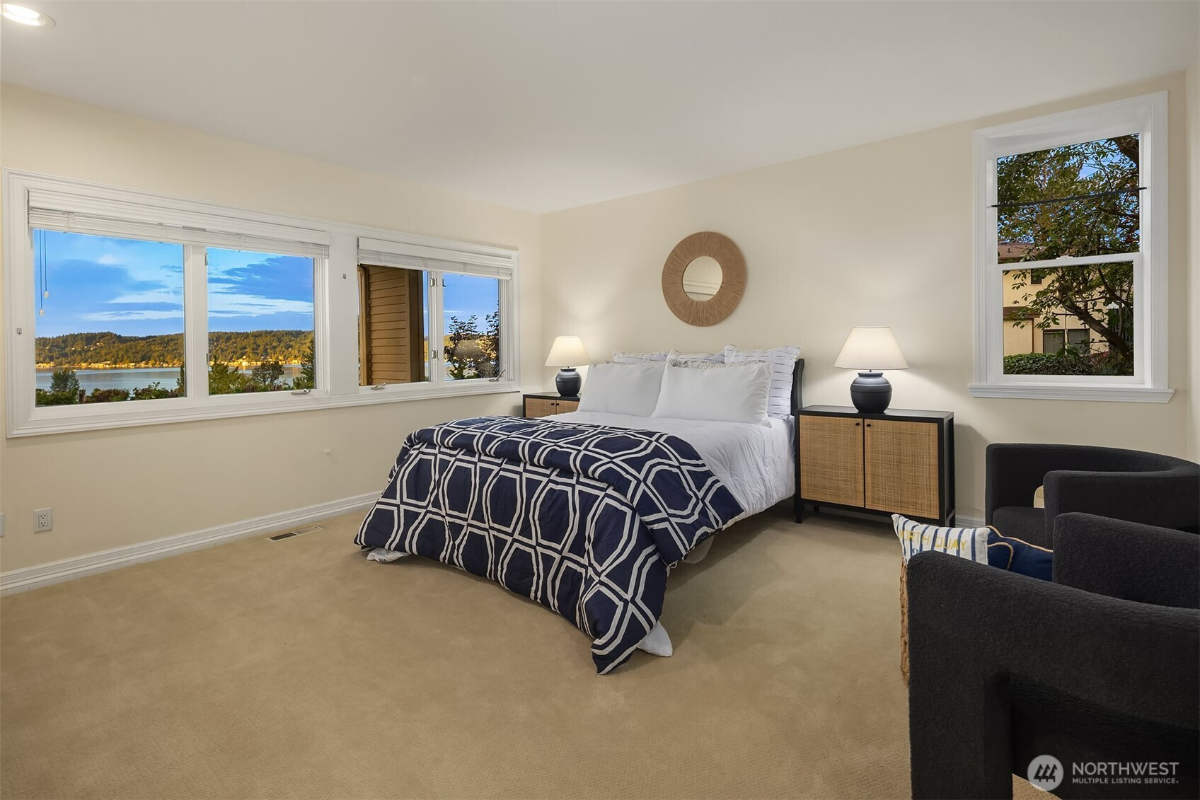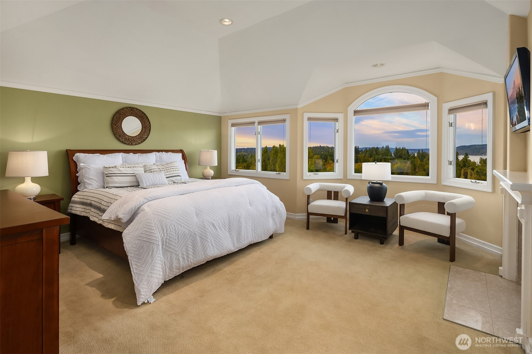 Perched above Lake Washington in highly desirable Inverness neighborhood, this NW contemporary residence showcases stunning panoramic views from nearly every room. Sunlight fills open-concept living spaces through expansive floor-to-ceiling windows & soaring ceilings. Timeless layout flows from elegant living room to formal dining room. Gourmet kitchen opens to spacious family room. Upstairs, luxurious primary suite & additional en-suite bedroom. Lower level offers generous bonus room, 3 view-filled bedrooms & 2 more baths. Extensive millwork & built-ins throughout. Enjoy expansive view decks & low-maintenance private backyard. Dual-zone HVAC, 5 gas fireplaces & 3-car garage. Close to B-G Trail, parks, Seattle Children’s, U Village & UW.