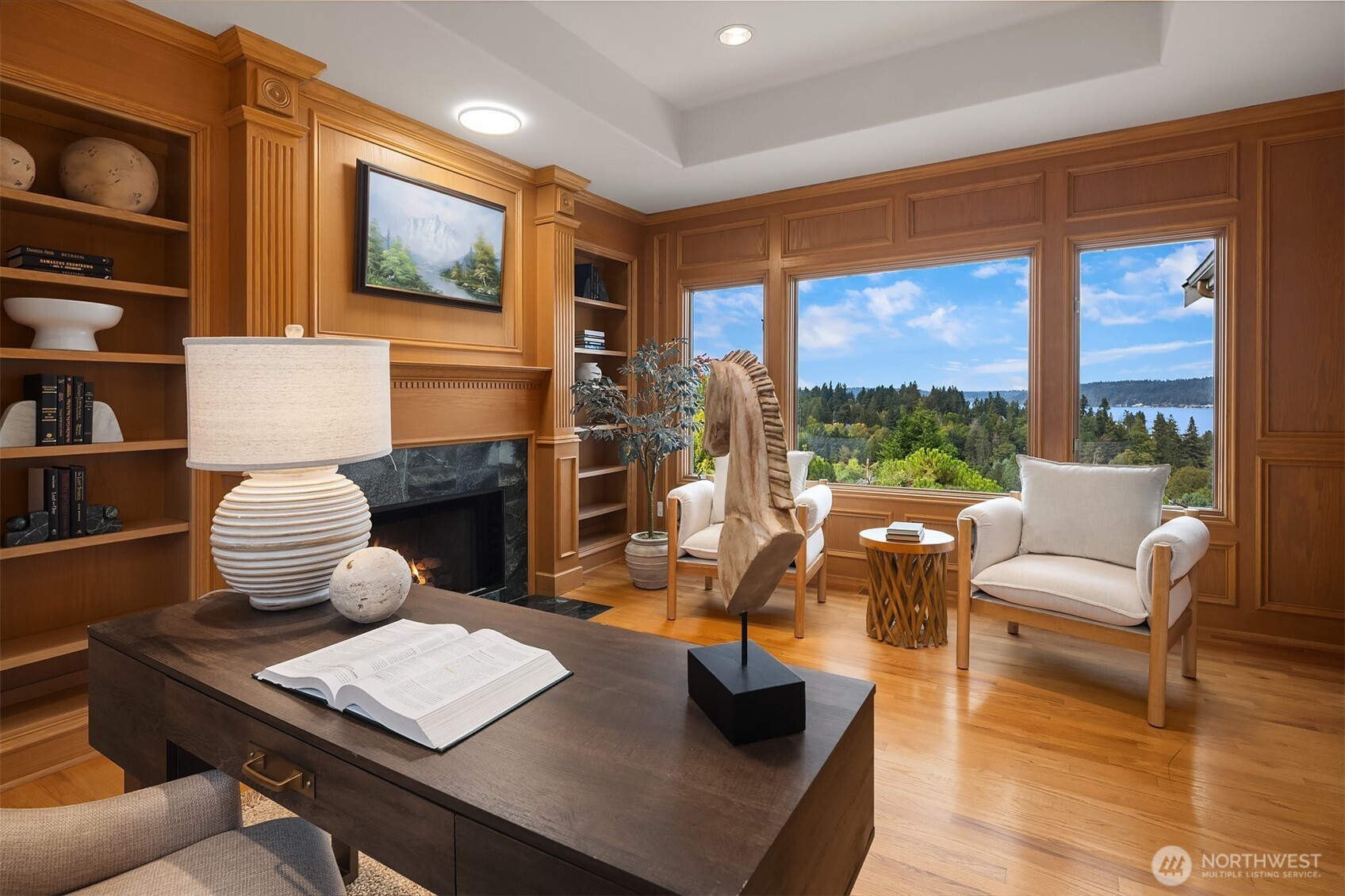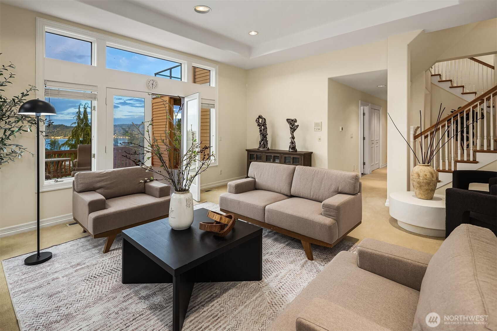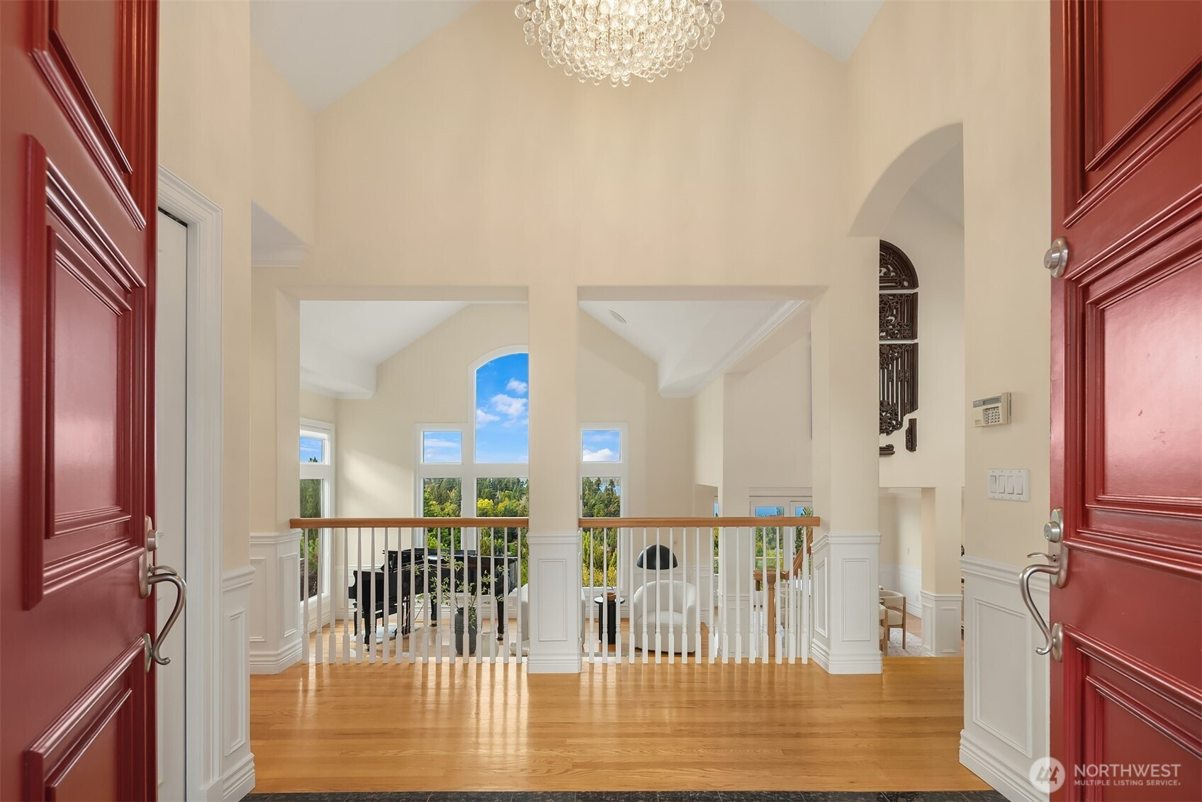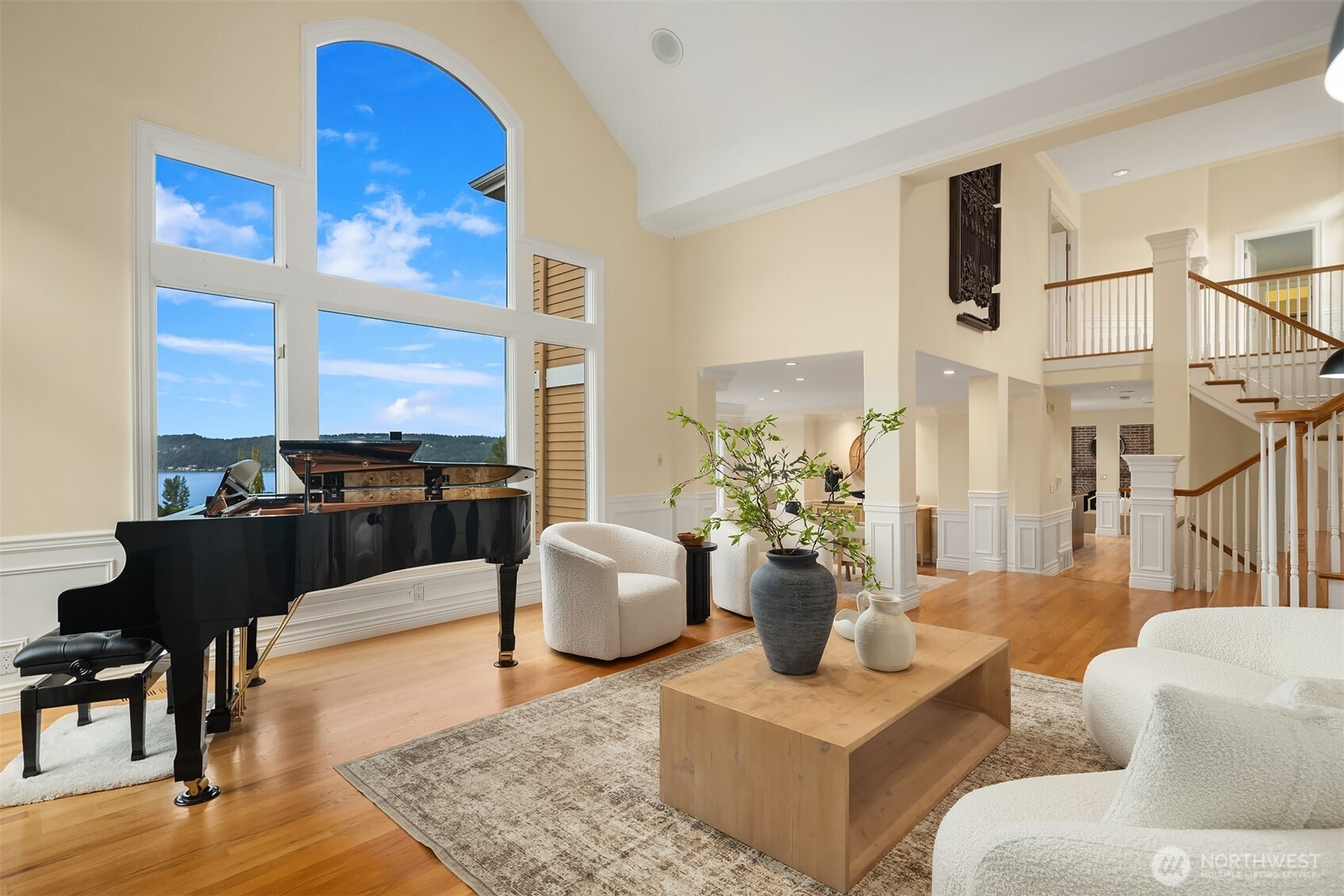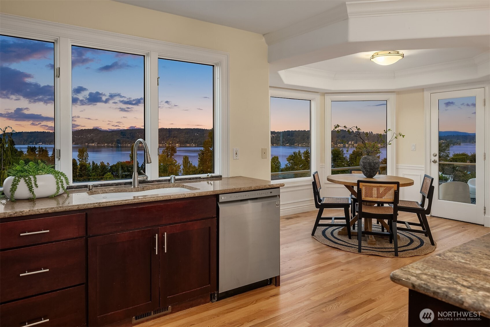 Perched above Lake Washington in highly desirable Inverness neighborhood, this NW contemporary residence showcases stunning panoramic views from nearly every room. Sunlight fills open-concept living spaces through expansive floor-to-ceiling windows & soaring ceilings. Timeless layout flows from elegant living room to formal dining room. Gourmet kitchen opens to spacious family room. Upstairs, luxurious primary suite & additional en-suite bedroom. Lower level offers generous bonus room, 3 view-filled bedrooms & 2 more baths. Extensive millwork & built-ins throughout. Enjoy expansive view decks & low-maintenance private backyard. Dual-zone HVAC, 5 gas fireplaces & 3-car garage. Close to B-G Trail, parks, Seattle Children’s, U Village & UW.
