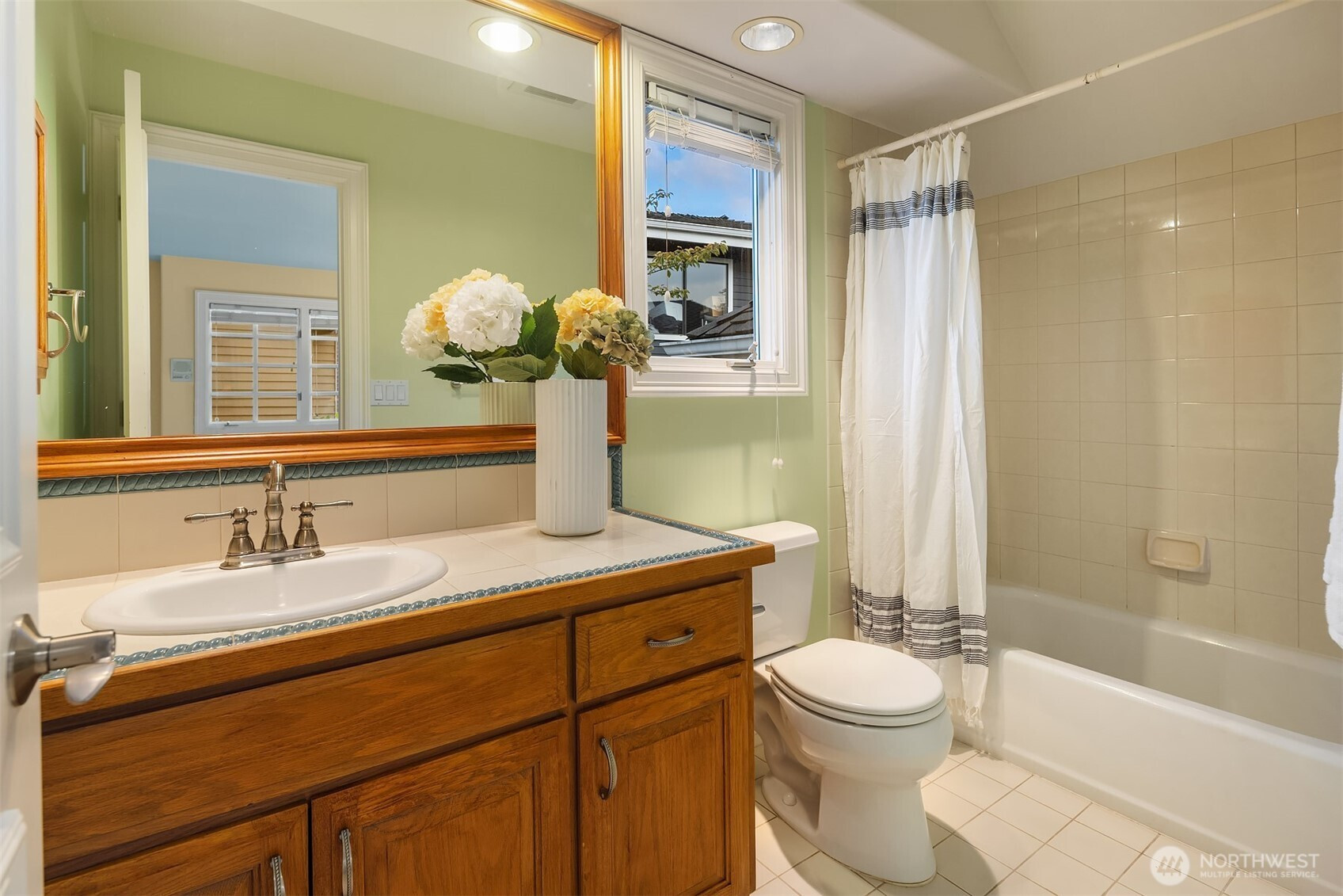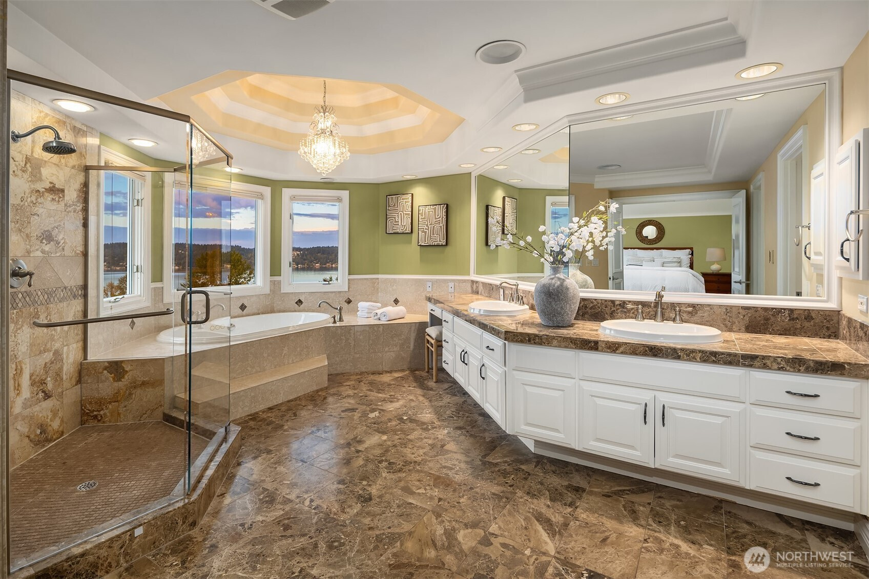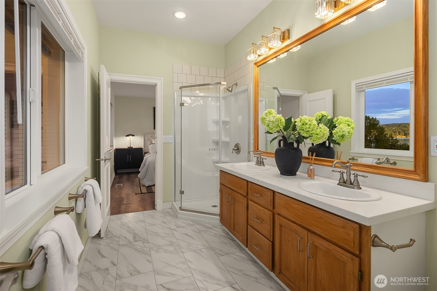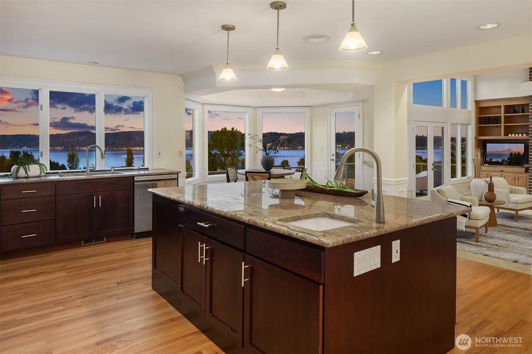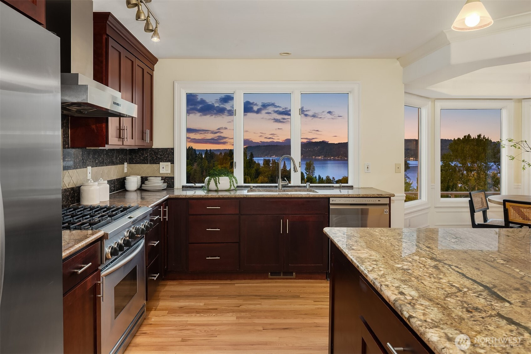 Perched above Lake Washington in highly desirable Inverness neighborhood, this NW contemporary residence showcases stunning panoramic views from nearly every room. Sunlight fills open-concept living spaces through expansive floor-to-ceiling windows & soaring ceilings. Timeless layout flows from elegant living room to formal dining room. Gourmet kitchen opens to spacious family room. Upstairs, luxurious primary suite & additional en-suite bedroom. Lower level offers generous bonus room, 3 view-filled bedrooms & 2 more baths. Extensive millwork & built-ins throughout. Enjoy expansive view decks & low-maintenance private backyard. Dual-zone HVAC, 5 gas fireplaces & 3-car garage. Close to B-G Trail, parks, Seattle Children’s, U Village & UW.