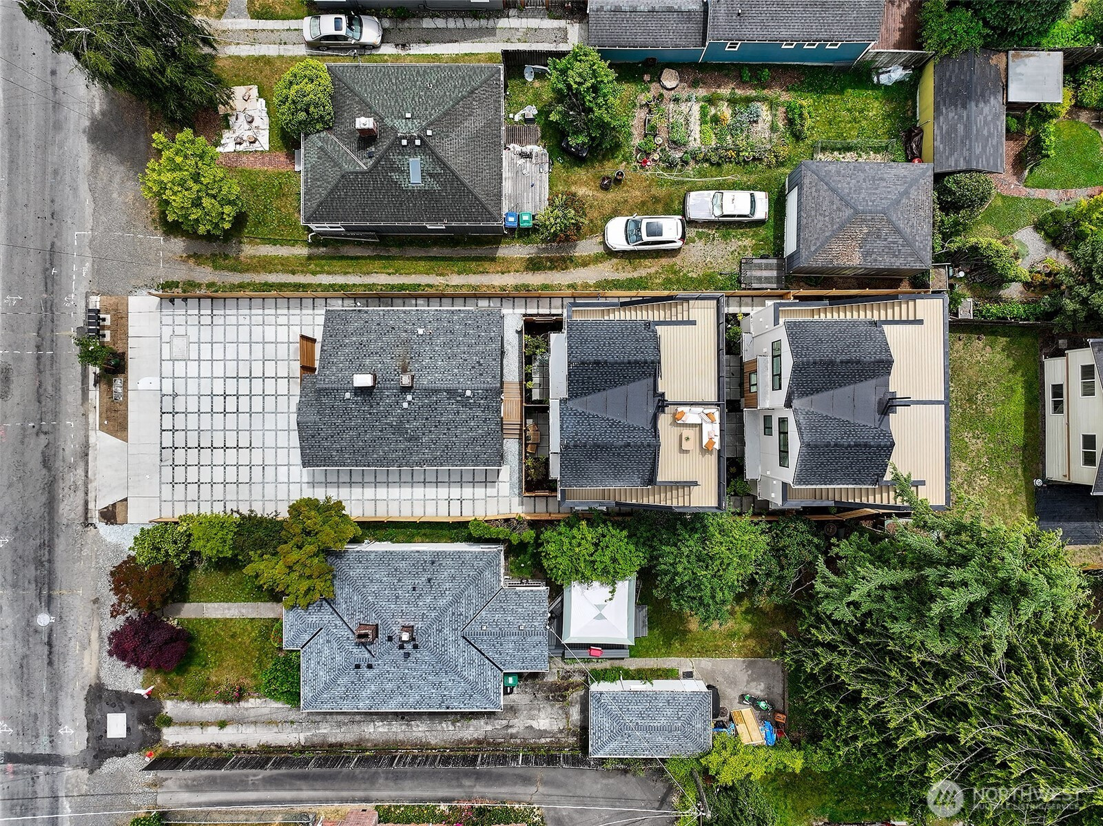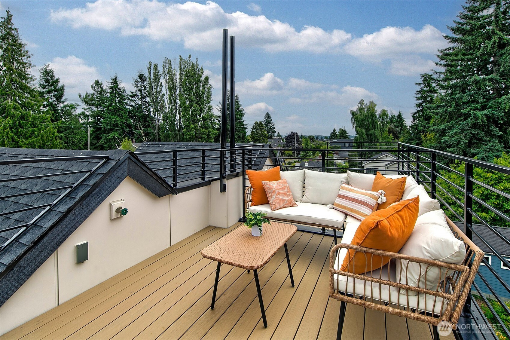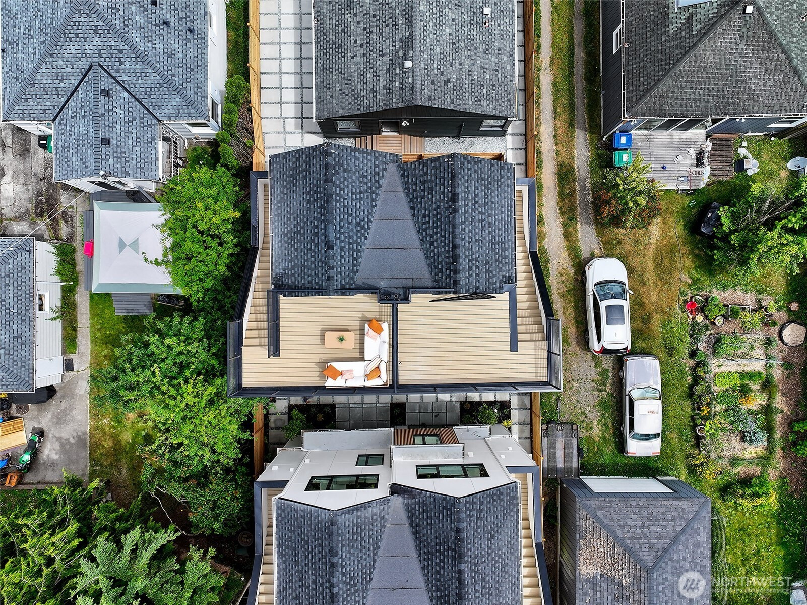 New construction modern Crown Hill townhouse with a private rooftop deck, sweeping city views, and designer finishes throughout, located just minutes from Ballard, Greenwood, and Golden Gardens. This beautifully designed 2-bedroom, 2.5-bath home offers approximately 1,100 sq ft of bright, functional living space with an open-concept main level featuring hardwood floors, vaulted ceilings, and a chef-inspired kitchen with quartz countertops, sleek modern cabinetry, and a premium 6-burner gas range, plus a convenient powder room for guests. Each bedroom occupies its own private level and includes an en-suite bathroom, offering ideal privacy and flexibility for guests, roommates, or a home office. Energy-efficient mini-split systems provide heating and A/C on every floor for year-round comfort. Enjoy both a private patio and a stunning rooftop deck with expansive Seattle skyline views—perfect for entertaining or relaxing. Quality craftsmanship and modern finishes throughout. Ideally located near neighborhood cafés, restaurants, breweries, parks, and transit with quick access to Ballard, downtown Seattle, and major commuter routes. Two homes remain available.