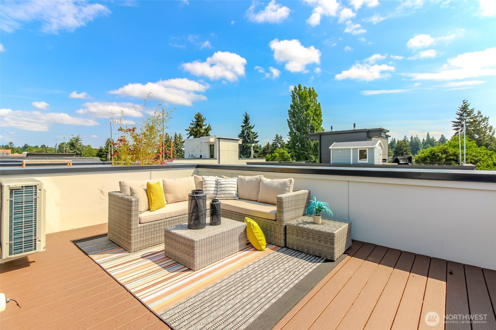 Modern townhome in vibrant North Green Lake. This 3-bed, 2-bath home by Ashworth Homes offers hickory hardwoods, high-efficiency mini-split units for heating and cooling, and open-concept living. Enjoy stunning views of downtown Seattle, the Space Needle, and the Olympics from your private rooftop deck. Top-level primary suite with custom bath. Close to Green Lake, transit, and top-rated schools—just a block from Robert Eagle Staff Middle. High Walk Score of 72 and Bike Score of 77. Built Green. No HOA dues!