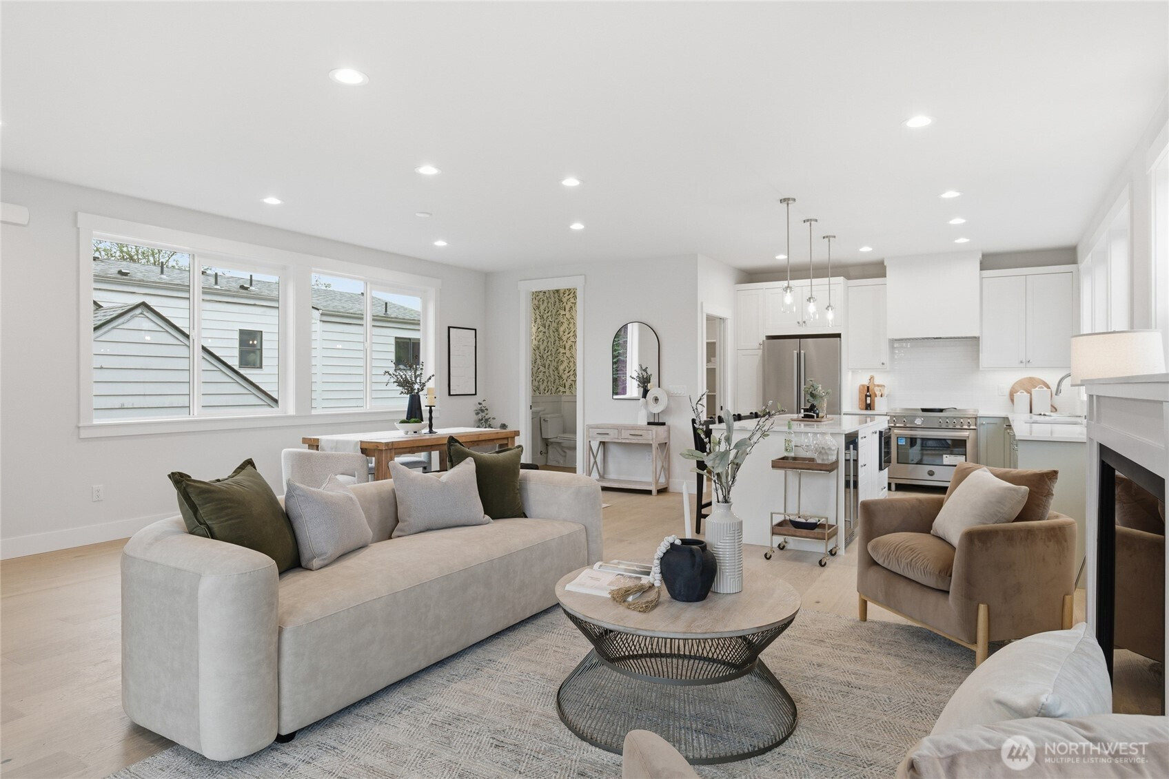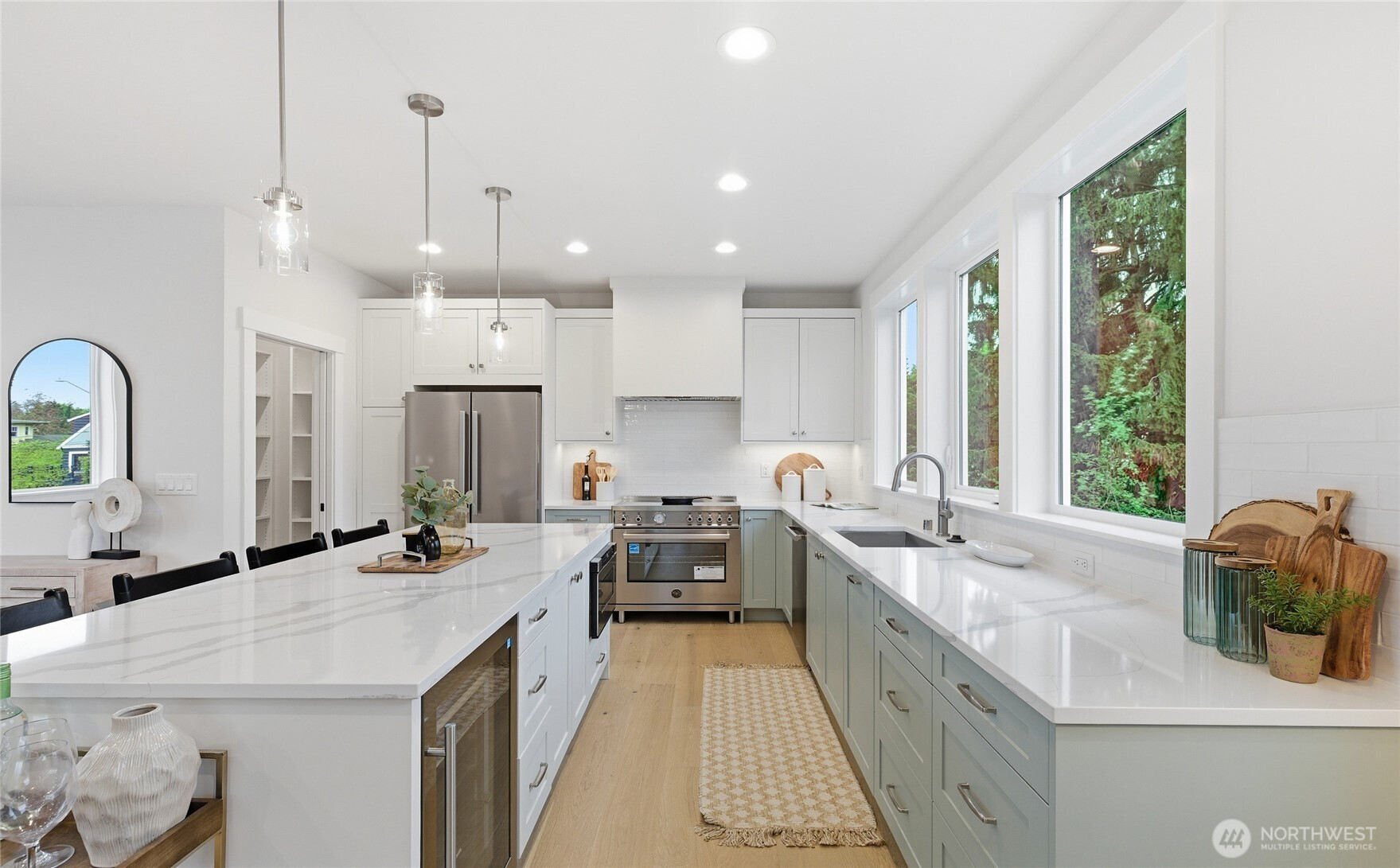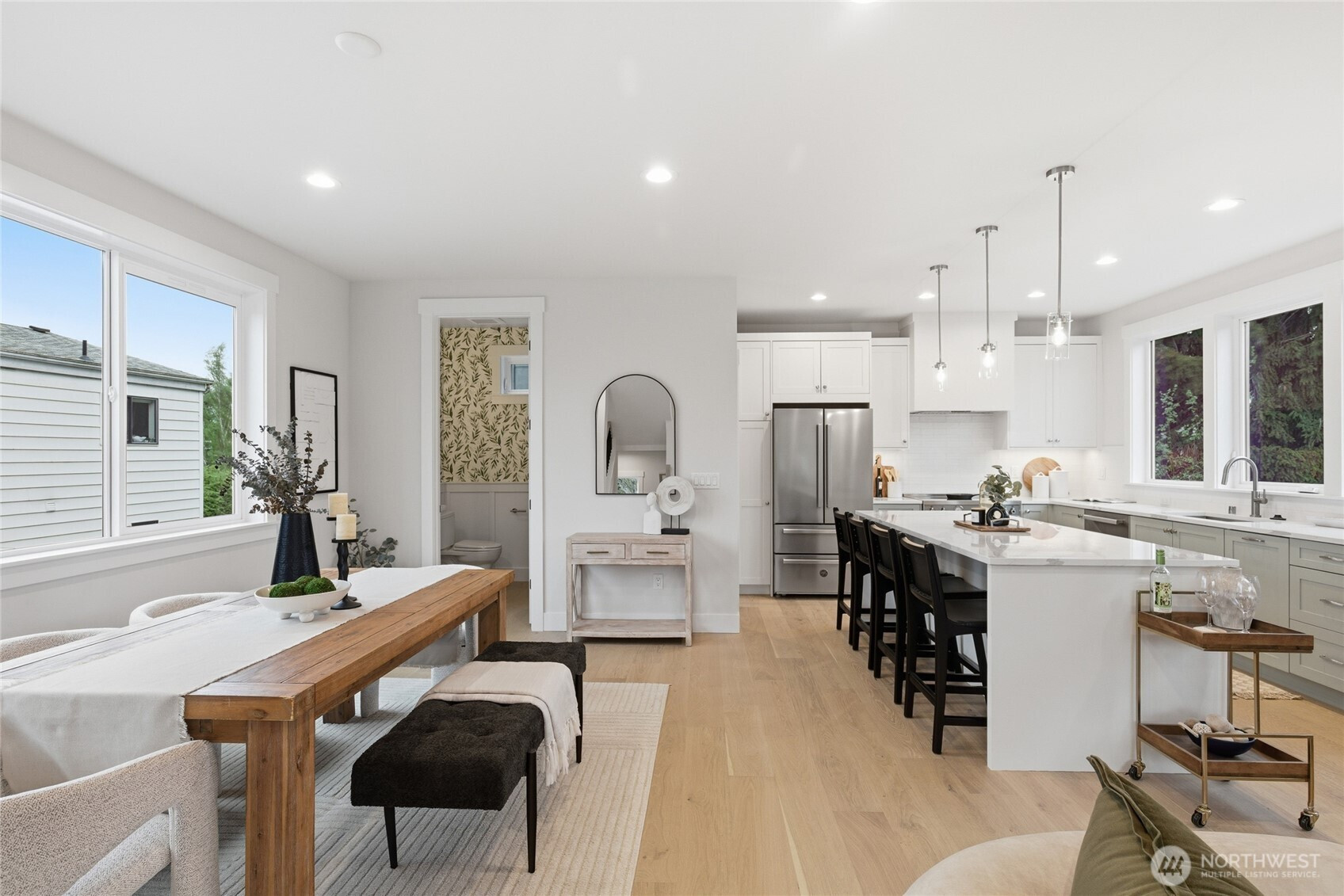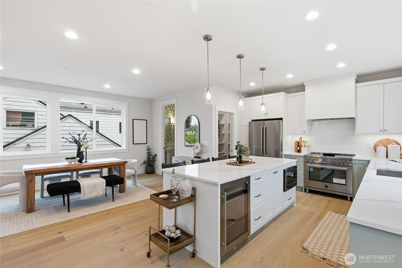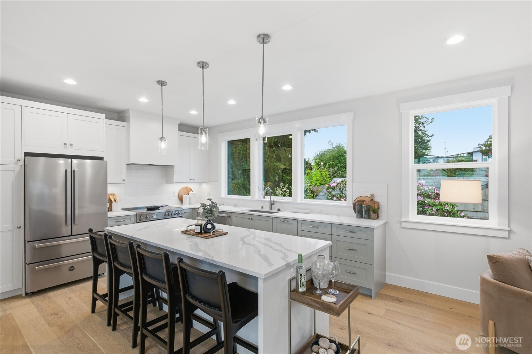 Crisp modern design meets everyday comfort. The largest of three spacious brand-new DETACHED homes from Seattle favorite boutique builder Garton Developments on one of the finest tree-lined streets in North Green Lake. Thoughtfully designed new construction, these home blends modern craftsmanship with timeless finishes. Wide-plank hardwoods, clean-lined shaker doors, and black hardware create a cohesive, elegant look, while a custom entry drop zone adds practical style. The kitchen features two-tone Bellmont cabinetry, quartz counters, full-height backsplash, and a spacious peninsula with pendant lighting. Bathrooms showcase designer tile, quartz, and modern fixtures, including a spa-like primary suite bath and a boutique powder room. Additional highlights include plush carpeted bedrooms, black spindle stair railings, curated exterior lighting, and a neutral palette for a bright, calm feel. Don't miss the heated garage/flex room, a rare find for in-city new construction. Set on a quiet, peaceful street yet just moments from vibrant conveniences including Green Lake, Northgate Station, North Seattle College and much more!