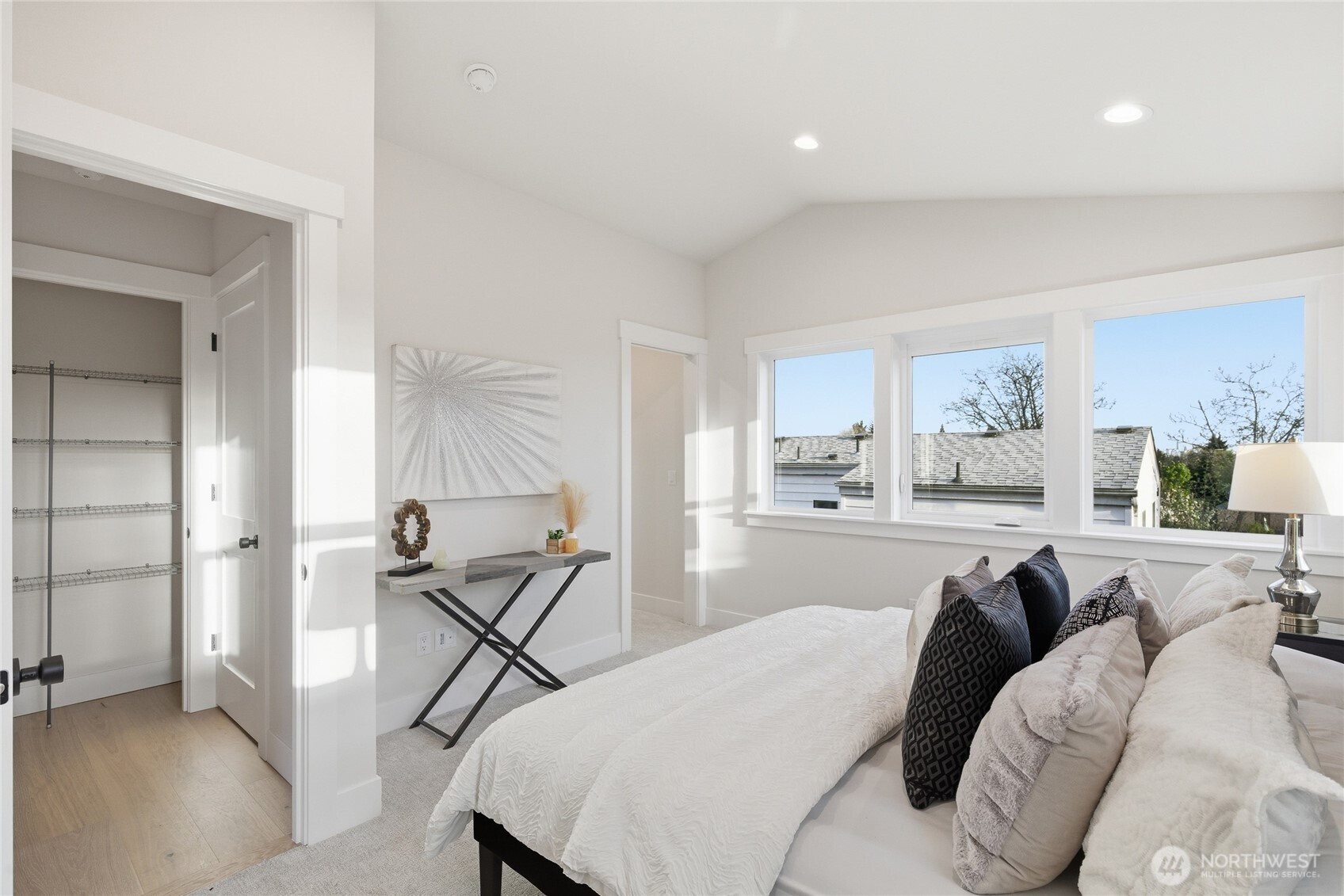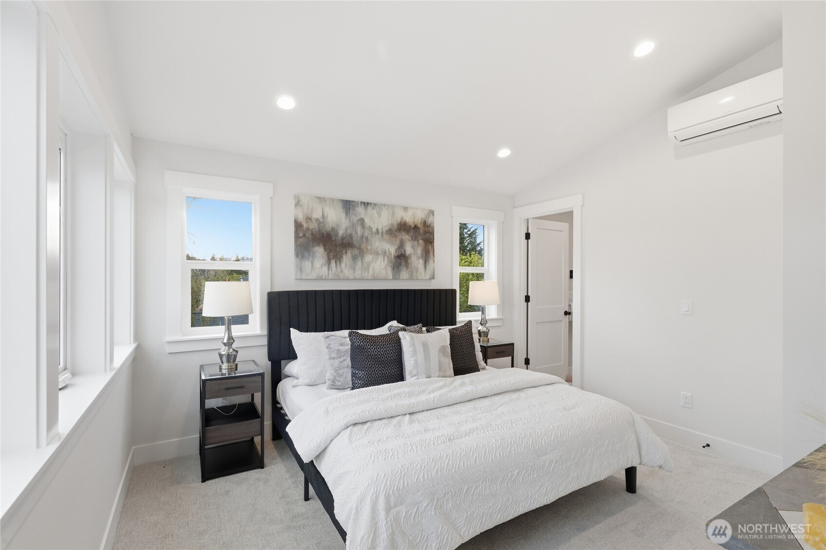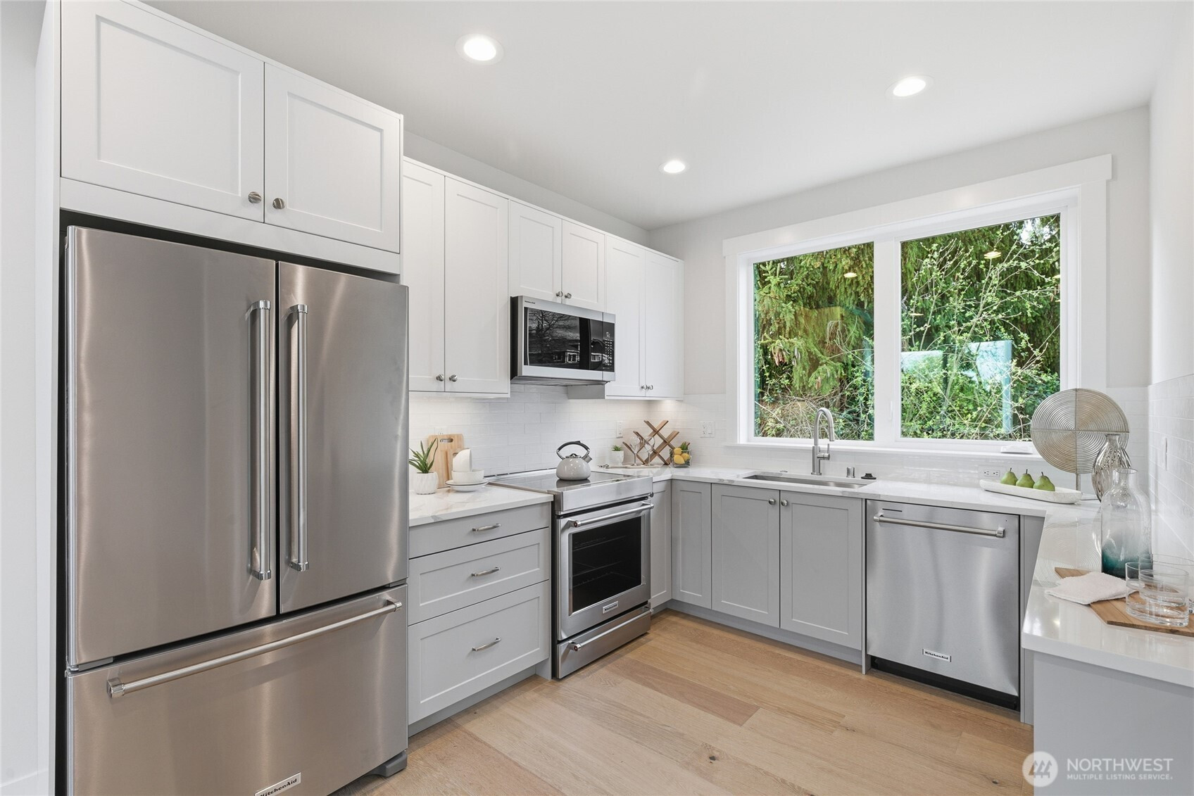 Crisp modern design meets everyday comfort. 1 of 3 spacious brand-new DETACHED homes from Seattle favorite boutique builder Garton Developments on one of the finest tree-lined streets in North Green Lake. Thoughtfully designed new construction, these home blends modern craftsmanship with timeless finishes. Wide-plank hardwoods, clean-lined shaker doors, and black hardware create a cohesive, elegant look, while a custom entry drop zone adds practical style. The kitchen features two-tone Bellmont cabinetry, quartz counters, full-height backsplash, and a spacious peninsula with pendant lighting. Bathrooms showcase designer tile, quartz, and modern fixtures, including a spa-like primary suite bath and a boutique powder room. Additional highlights include plush carpeted bedrooms, black spindle stair railings, curated exterior lighting, and a neutral palette for a bright, calm feel. Don't miss the heated two-wheeled garage/flex room and an off-street parking space. Set on a quiet, peaceful street yet just moments from vibrant conveniences including Green Lake, Northgate Station, North Seattle College and much more!