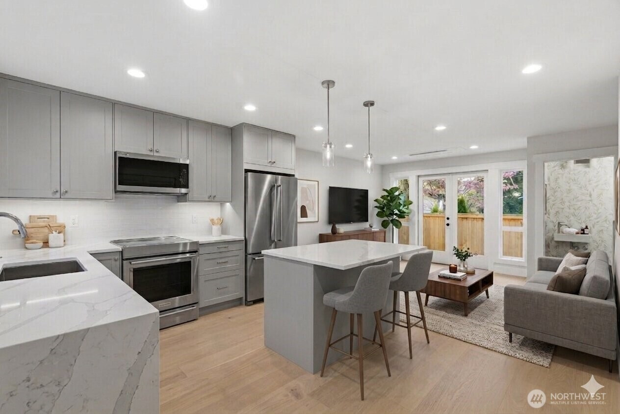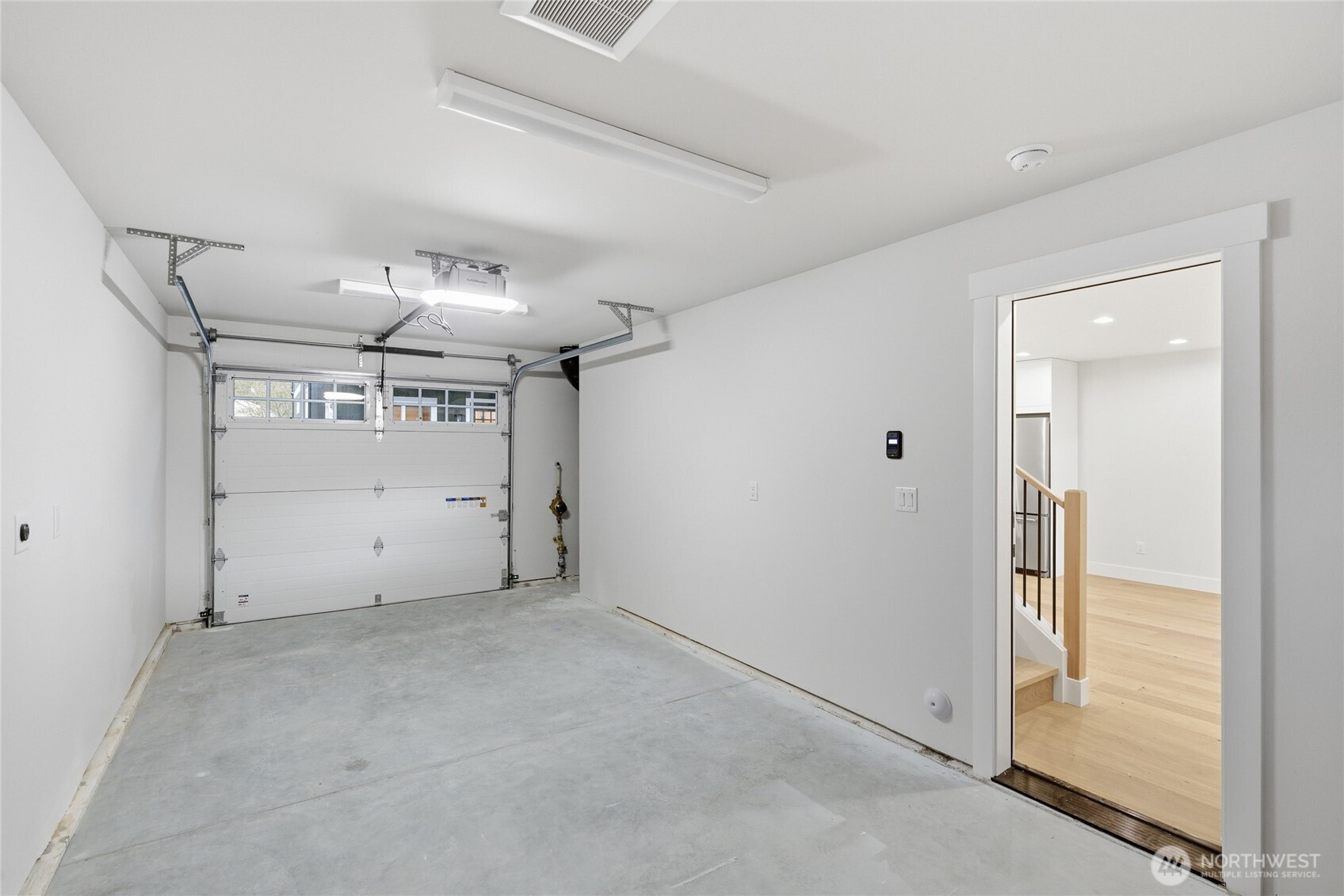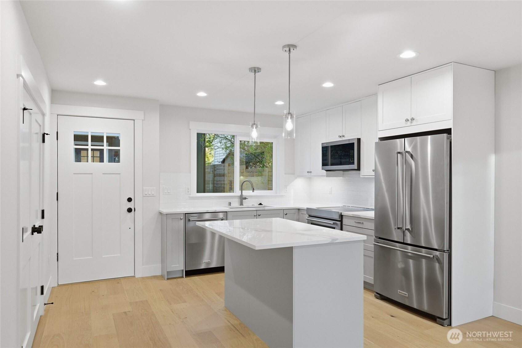 Crisp modern design meets everyday comfort. Two story detached home from Seattle favorite boutique builder Garton Developments on one of the finest tree-lined streets in North Green Lake. Thoughtfully designed new construction, these home blends modern craftsmanship with timeless finishes. Wide-plank hardwoods, clean-lined shaker doors, and black hardware create a cohesive, elegant look, while a custom entry drop zone adds practical style. The kitchen features two-tone Bellmont cabinetry, quartz counters, full-height backsplash, and a spacious peninsula with pendant lighting. Bathrooms showcase designer tile, quartz, and modern fixtures, including a spa-like primary suite bath and a boutique powder room. Additional highlights include plush carpeted bedrooms, black spindle stair railings, curated exterior lighting, and a neutral palette for a bright, calm feel. Don't miss the heated garage/flex room, a rare find for in-city new construction. Set on a quiet, peaceful street yet just moments from vibrant conveniences including Green Lake, Northgate Station, North Seattle College and much more!