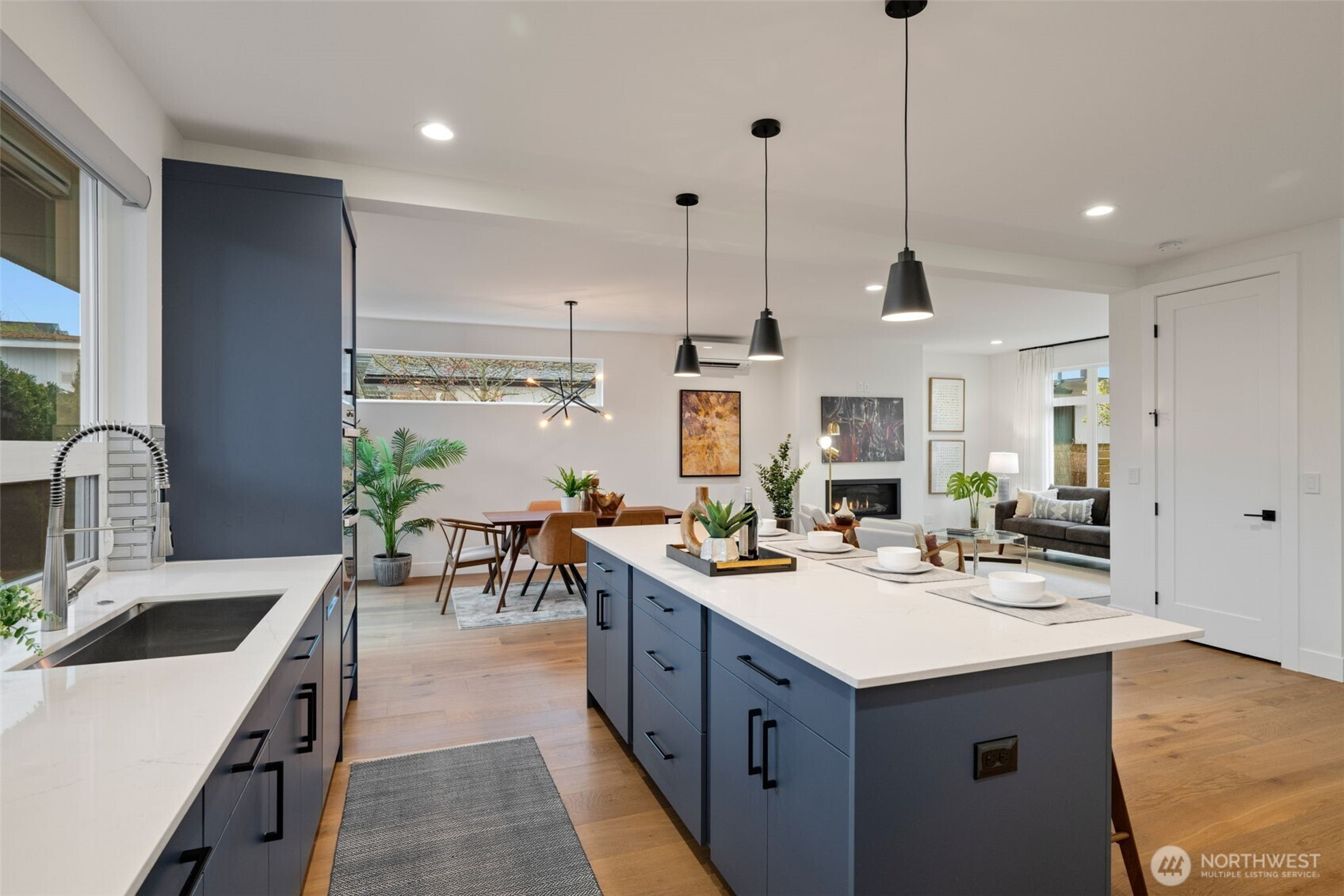 NEW PRICE! A standout in the world of new construction, this custom home delivers style, scale, and thoughtful detail. Over 2000 sqft on just 2 levels, there is a gracious feeling to all the spaces. The main level features a true great room with soaring ceilings, engineered hardwoods and floor-to-ceiling windows pulling in western light. The kitchen is centered around a large island with seating for four, quartz counters, glass tile, a gas cooktop and a walk-in pantry. The dining room flows out to a patio with large sliders and on the other side is an oversized living room corner with a gas fireplace. Upstairs, the primary suite has room to lounge and features a walk-in closet with built-in California Closets, luxe five-piece bath with heated floors, double vanity, soaking tub and rain shower. Two more bright bedrooms, a guest bath, a proper laundry room with ample storage—plus a wide landing that easily fits a home office setup. Mini-splits throughout gives eco- friendly heat and air + Lutron auto-shades and smart light switches. The top floor opens to a 1000sqft rooftop deck, stubbed for gas and plumbed for an outdoor kitchen. Two parking spaces ready for EV charging. A few blocks to 2 express bus routes, close to great parks- Westcrest + Riverview, a 10 min walk to neighborhood faves Fresh Flours and Can Bar, convenient to Westwood Village shopping and 2 miles to Lincoln Park and Puget Sound. Come experience a new build that stands apart!