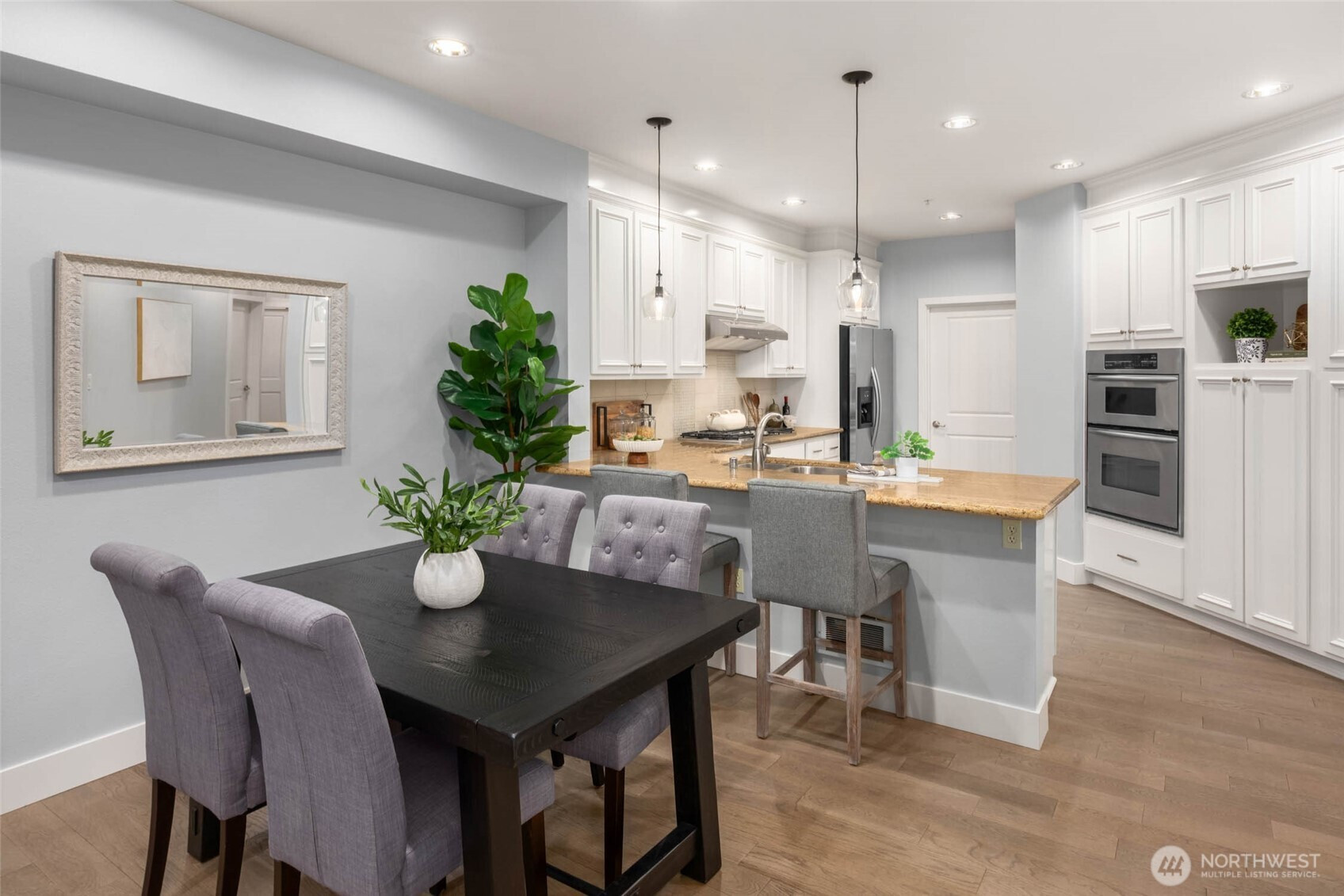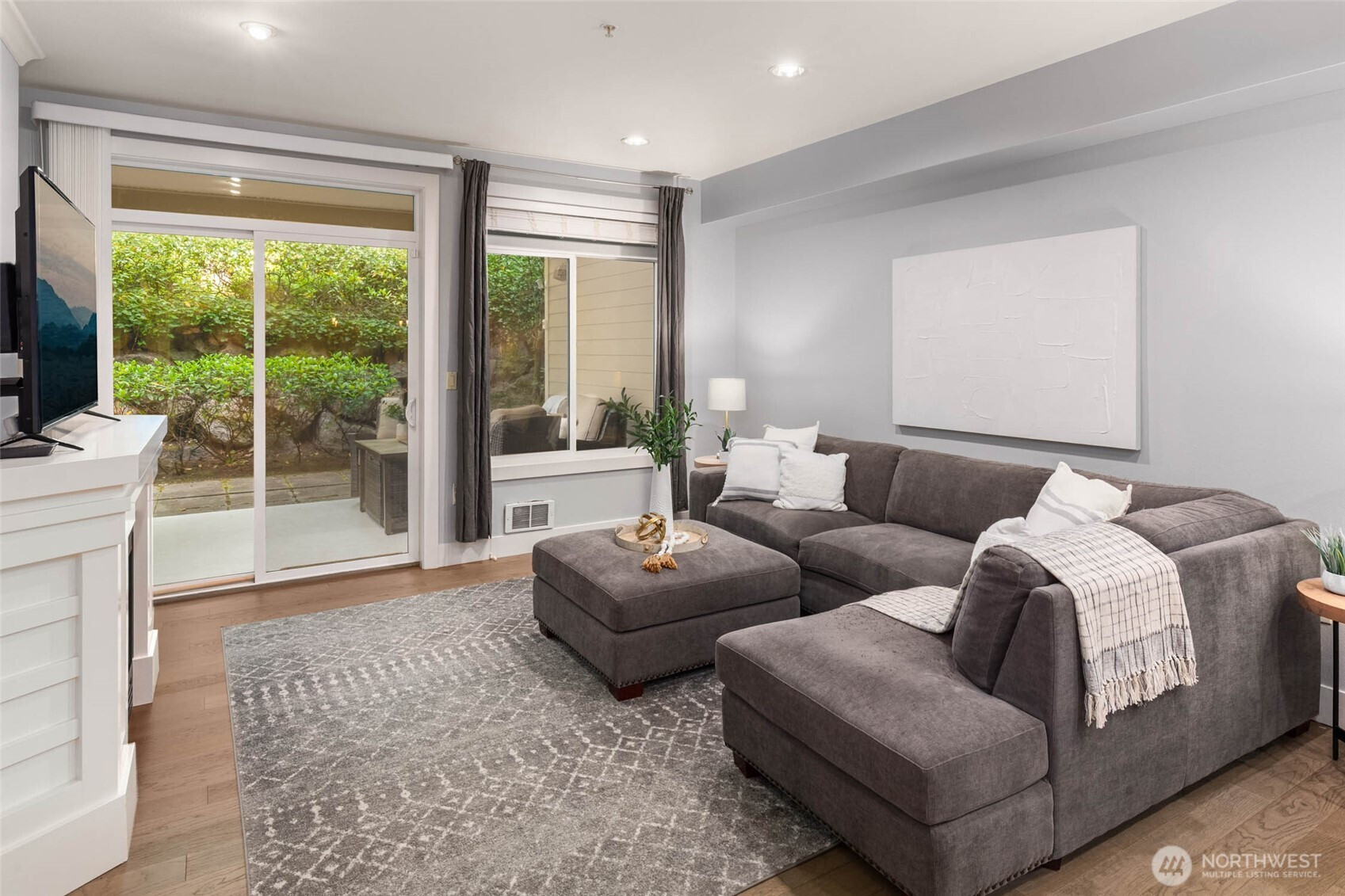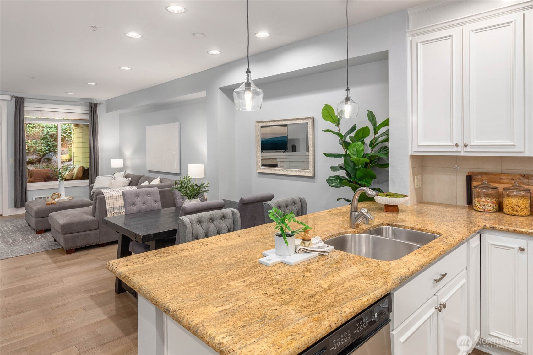 A rare blend of space, style, and location in the heart of downtown Redmond. This 1-bedroom condo with a spacious flex room lives like a true two-bedroom, offering 1,347 sq ft of beautifully updated living with hardwood floors throughout and an airy, open layout. The oversized kitchen flows seamlessly into a bright living area and out to a private back patio—your own outdoor escape. The generous flex room is perfect as another room for guests, a home office, or fitness space. The updated primary suite features a spa-inspired bath and walk-in closet. Located in desirable Towne Pointe, just moments from dining, parks, trails, and all that downtown Redmond has to offer.