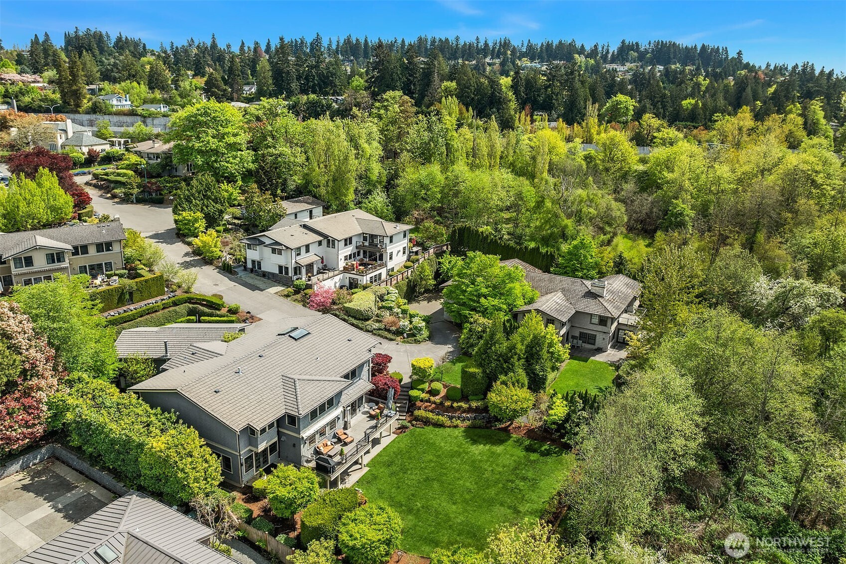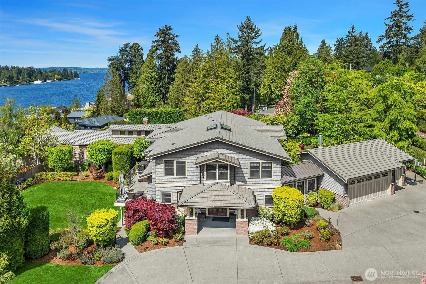 At the end of a quiet cul-de-sac, nestled between Wetherill Nature Preserve and Cozy Cove, this exceptional Yarrow Point home offers privacy, lake views, and seamless indoor-outdoor living. The main level features formal living and dining rooms opening to a private courtyard, an inviting family room, and a sunlit breakfast area adjoining the chef’s kitchen overlooking the grounds, and dedicated home office. Thoughtfully designed mudroom with built-in storage, dog wash, and powder bath connects to the 3-car garage. Upstairs offers four bedrooms each with ensuite bathrooms and custom closets, including a luxurious primary suite with dual walk-in closets and serene lake views, plus convenient upper-level laundry. The lower level lives like a private retreat with flexible entertainment space for home theater, gym, music or craft room, plus a sauna, and a fifth guest ensuite with adjacent living area and generous kitchenette — ideal for entertaining, extended stays or multigenerational living. Adjacent to 520 trails with access to Yarrow Point’s private beach, courts and playground at Morningside Park. Minutes to Bellevue, Seattle, and top-rated schools, while feeling worlds away, surrounded by nature among the wooded trails along Lake Washington's quiet shores.