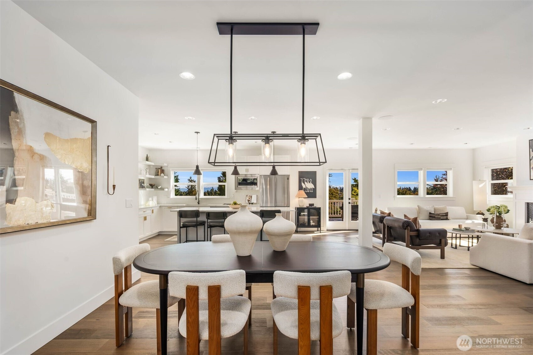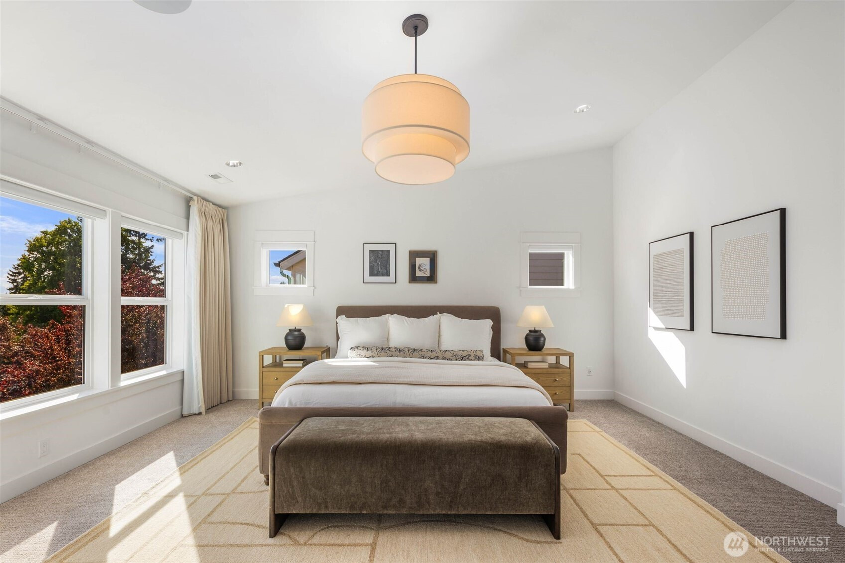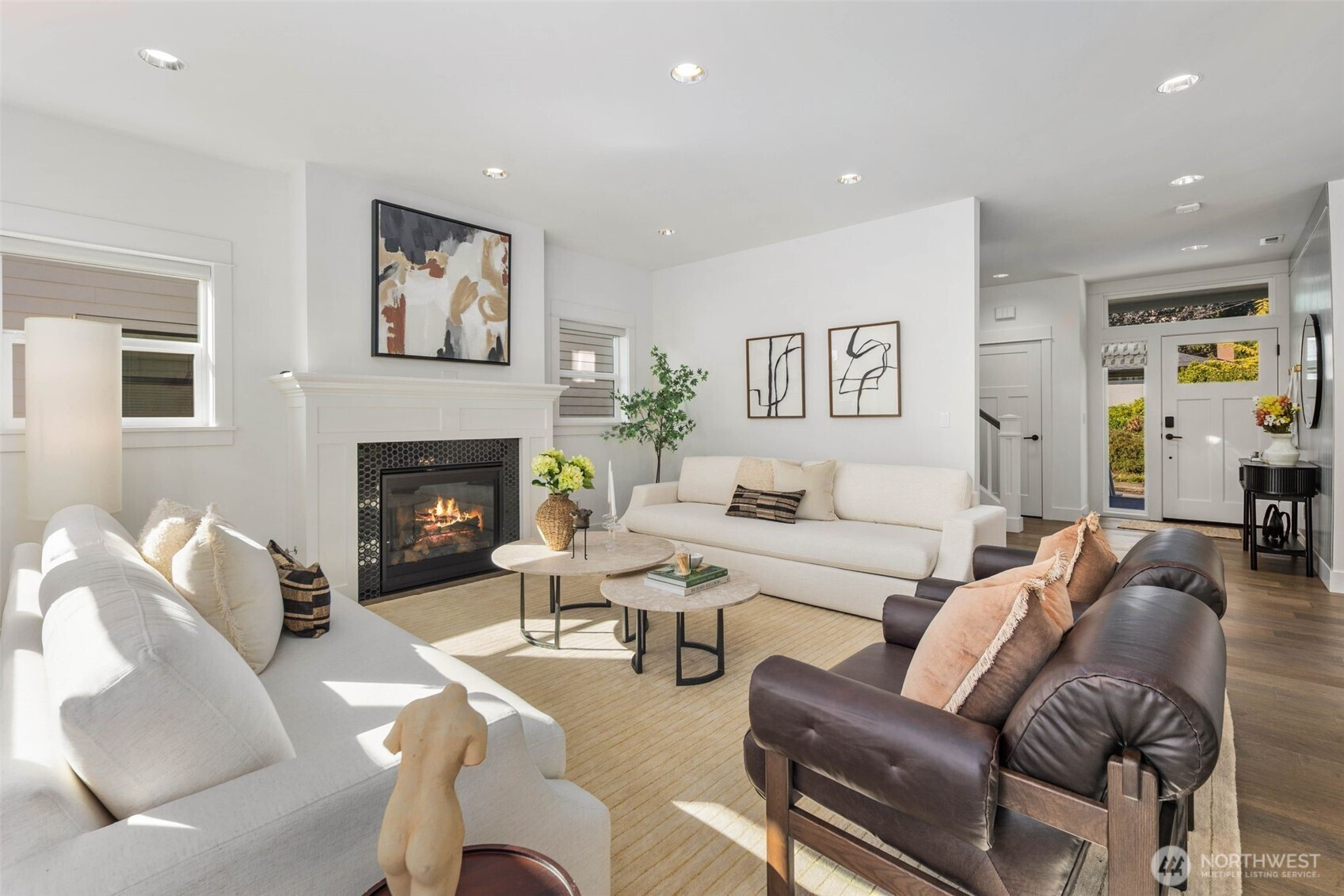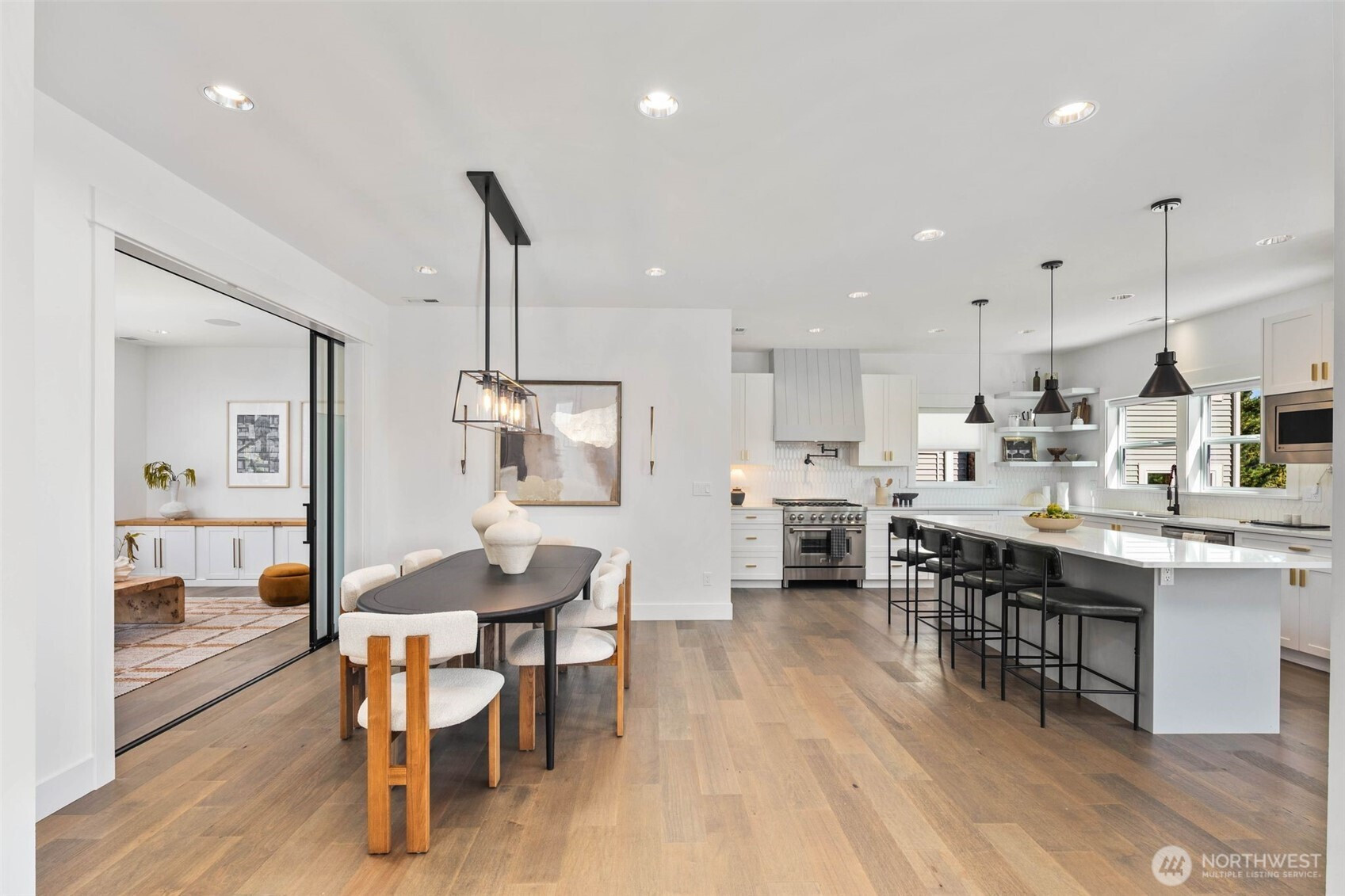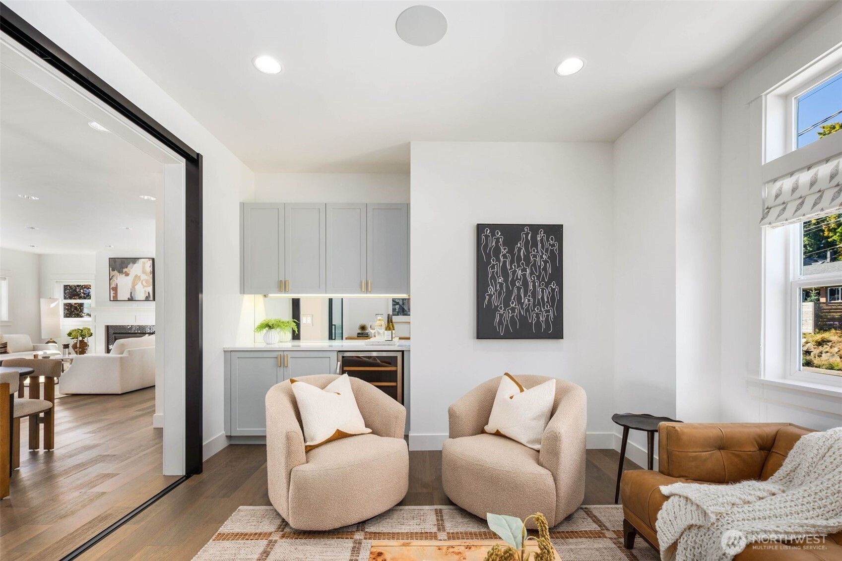 Eastern exposure fills this Maple Leaf home with beautiful natural light throughout the day and captures breathtaking sunrises over the Cascade Mountains and Mt. Rainier. Built in 2021 with timeless design in mind, the main level is ideal for both everyday living and entertaining, featuring an open floor plan anchored by a gourmet kitchen with high-end appliances, generous counter space, and a massive walk-in pantry. The kitchen flows seamlessly into the living and dining areas and opens to a spacious deck, perfect for morning coffee or evening gatherings. A versatile bonus room on this level offers the ideal space for a home office, playroom, or flex space to suit your needs. Upstairs, three bedrooms are thoughtfully situated on one level, including a serene primary suite complete with dual walk-in closets and a spa-inspired bathroom. The lower level provides exceptional flexibility with a large rec room, guest suite, and a covered patio that allows for year-round enjoyment of the expansive backyard, rain or shine. An oversized two-car garage with EV charging and ample storage is a rare find. Additional highlights include built-in speakers, central air conditioning, and a Lutron lighting system with smart-home capabilities, allowing effortless control of lighting, temperature, and sound from anywhere. Just a few blocks from Maple Leaf Park, coffee shops, and restaurants.