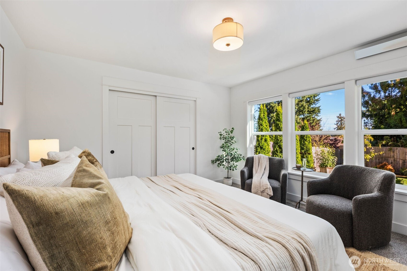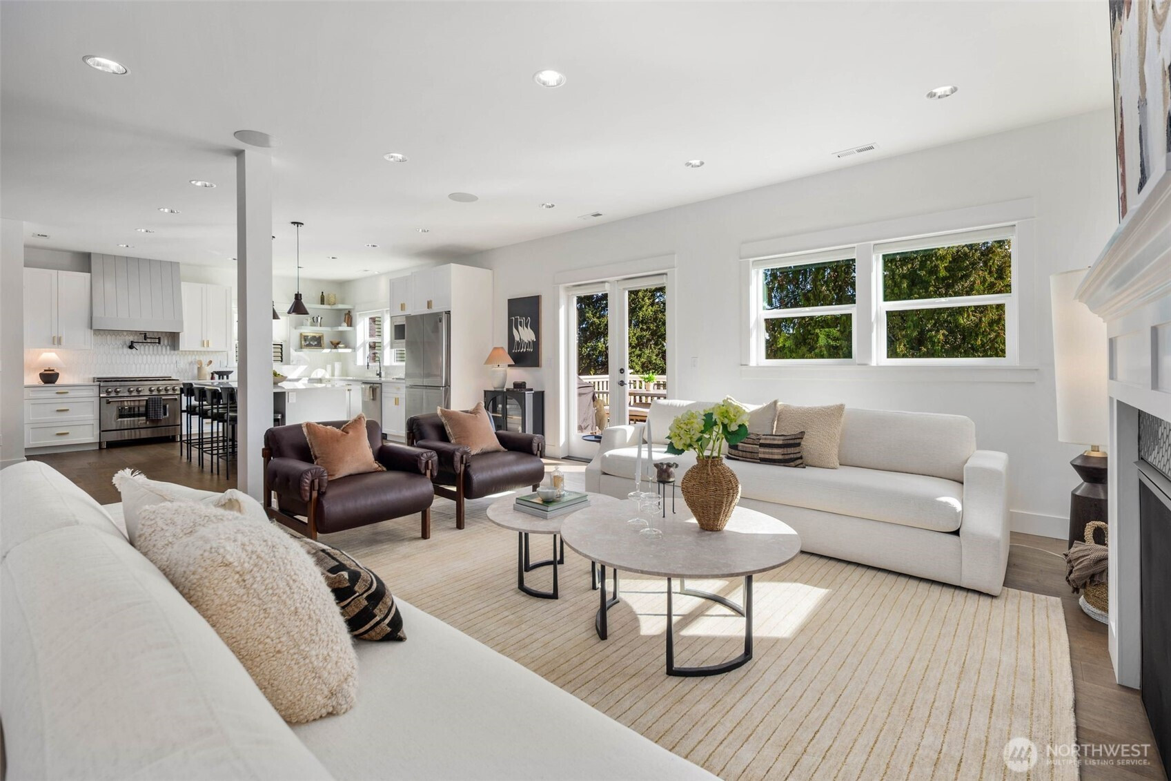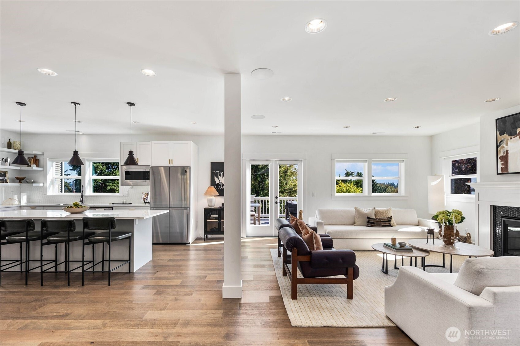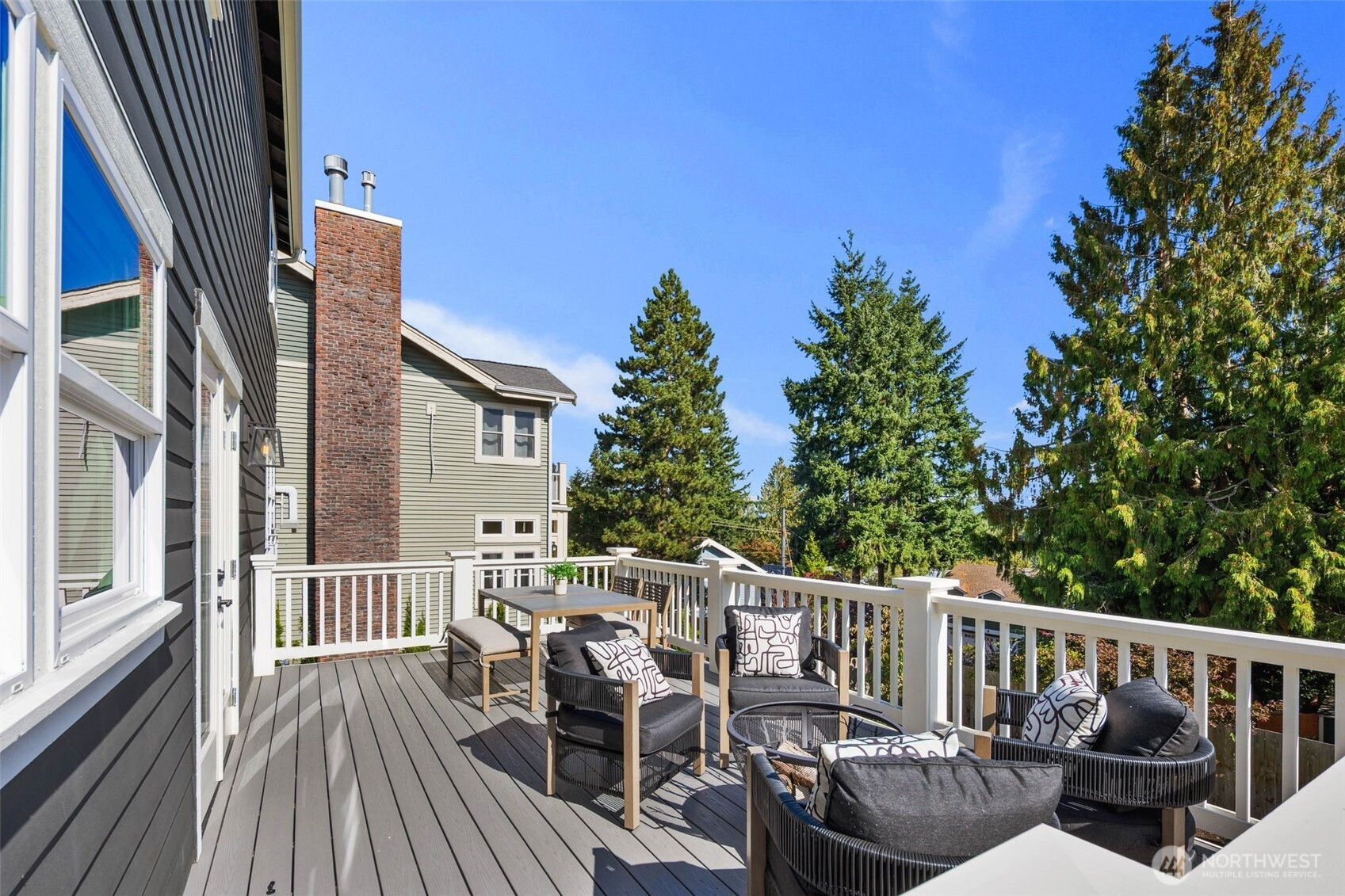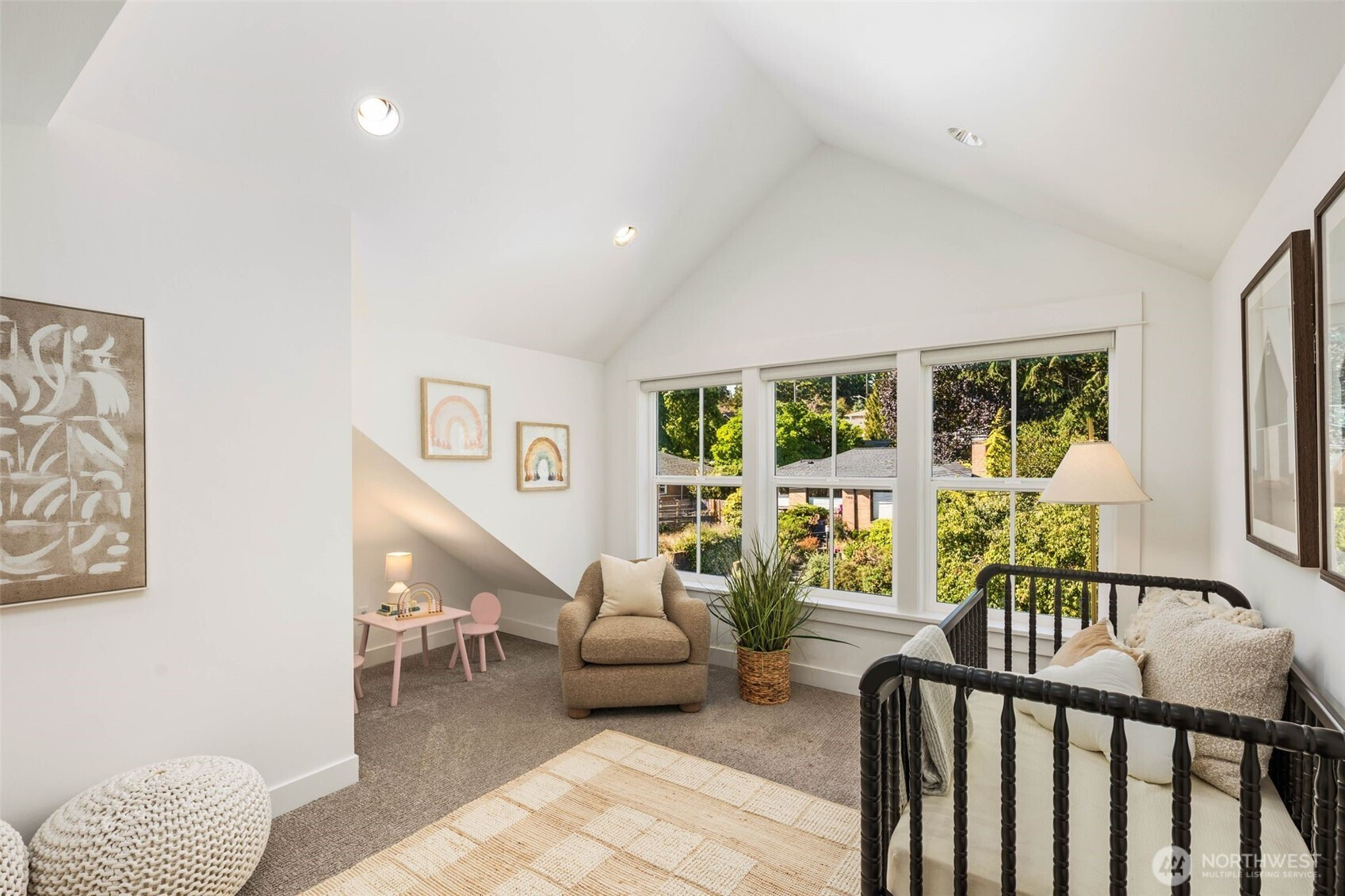 Eastern exposure fills this Maple Leaf home with beautiful natural light throughout the day and captures breathtaking sunrises over the Cascade Mountains and Mt. Rainier. Built in 2021 with timeless design in mind, the main level is ideal for both everyday living and entertaining, featuring an open floor plan anchored by a gourmet kitchen with high-end appliances, generous counter space, and a massive walk-in pantry. The kitchen flows seamlessly into the living and dining areas and opens to a spacious deck, perfect for morning coffee or evening gatherings. A versatile bonus room on this level offers the ideal space for a home office, playroom, or flex space to suit your needs. Upstairs, three bedrooms are thoughtfully situated on one level, including a serene primary suite complete with dual walk-in closets and a spa-inspired bathroom. The lower level provides exceptional flexibility with a large rec room, guest suite, and a covered patio that allows for year-round enjoyment of the expansive backyard, rain or shine. An oversized two-car garage with EV charging and ample storage is a rare find. Additional highlights include built-in speakers, central air conditioning, and a Lutron lighting system with smart-home capabilities, allowing effortless control of lighting, temperature, and sound from anywhere. Just a few blocks from Maple Leaf Park, coffee shops, and restaurants.