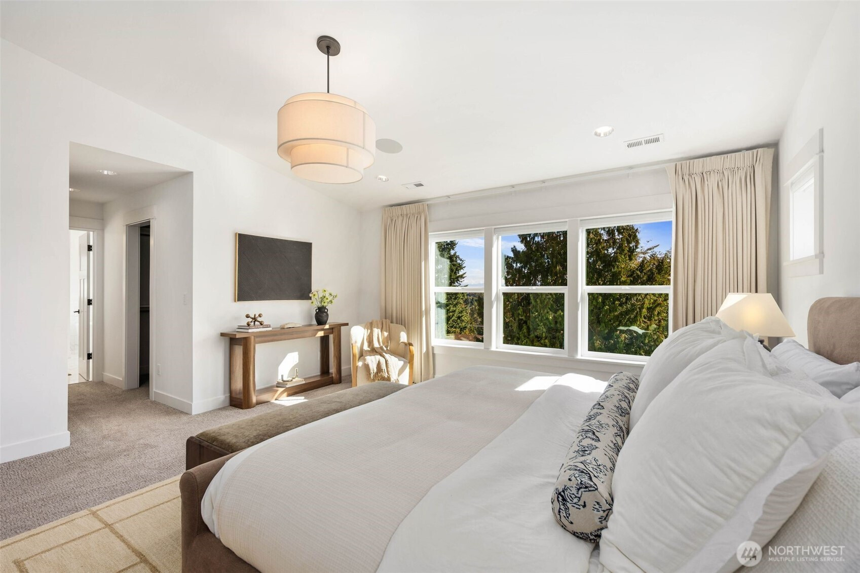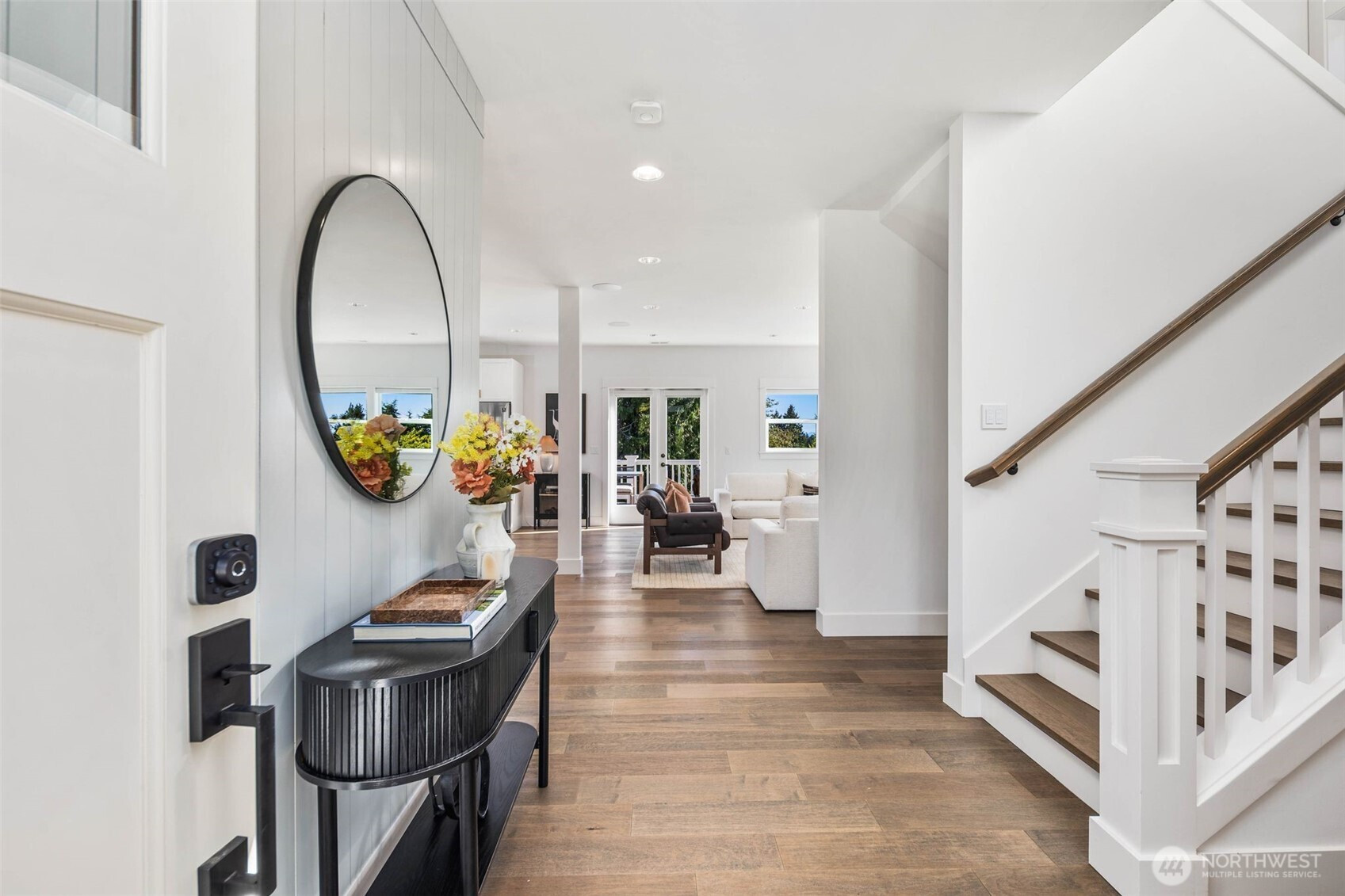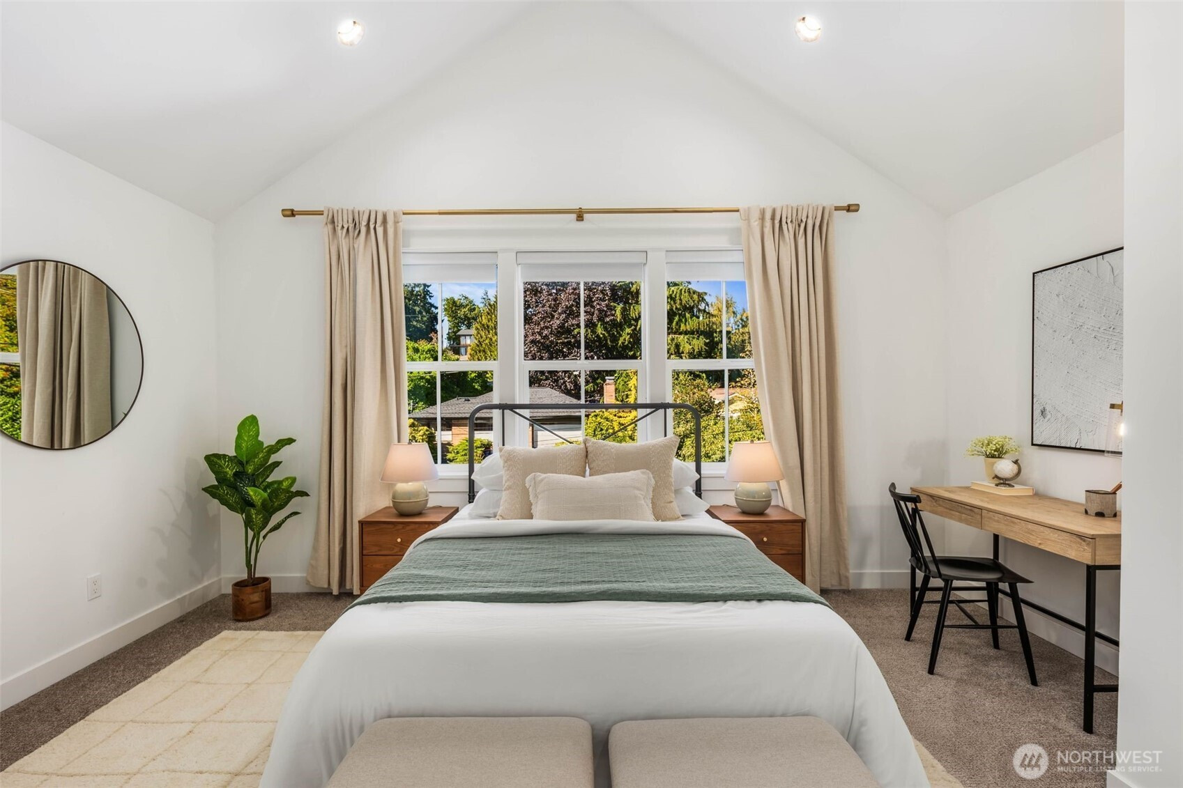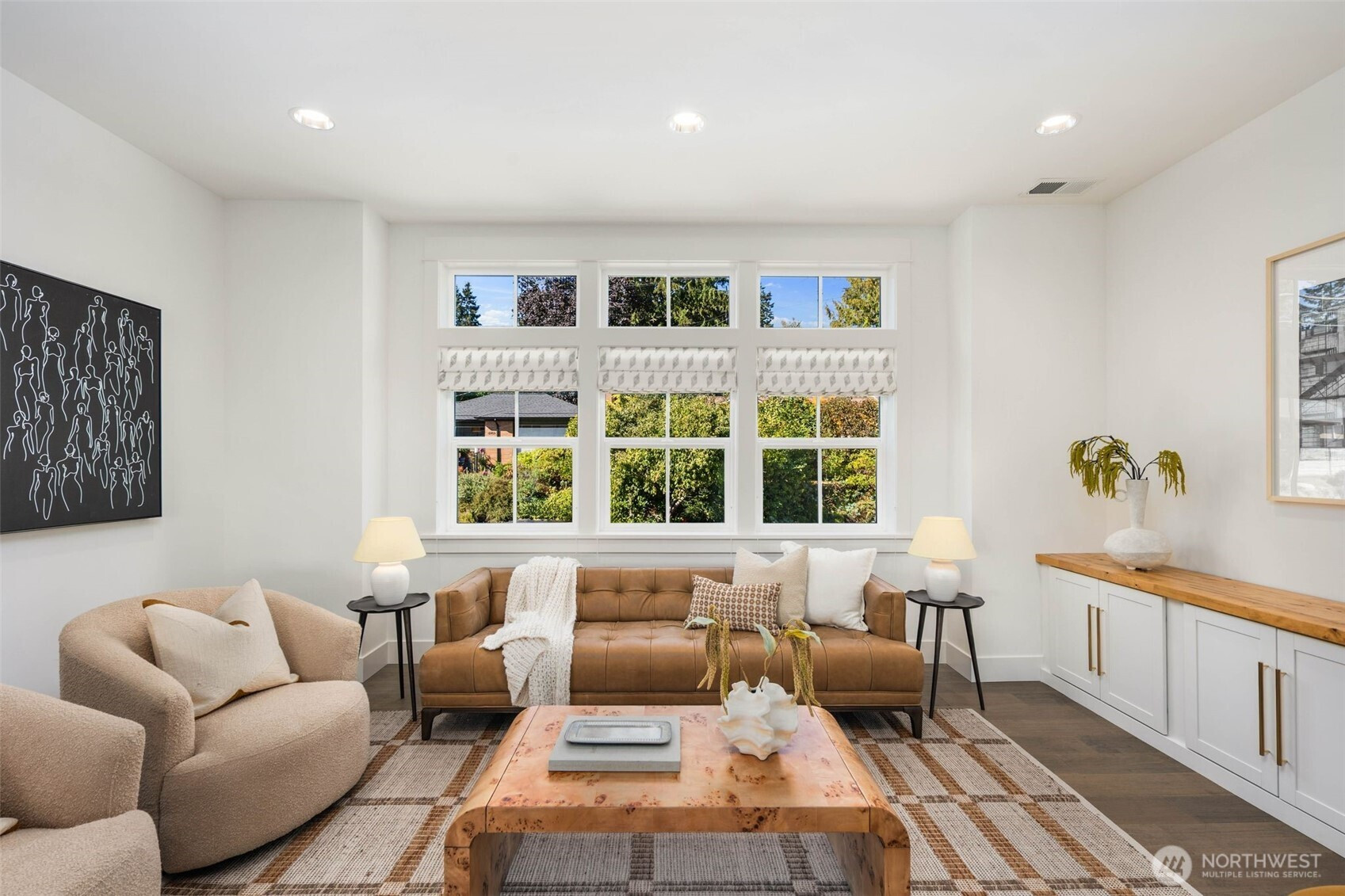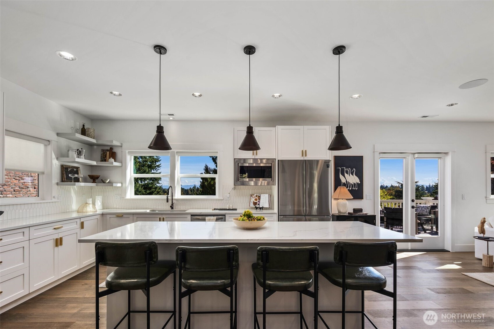 Eastern exposure fills this Maple Leaf home with beautiful natural light throughout the day and captures breathtaking sunrises over the Cascade Mountains and Mt. Rainier. Built in 2021 with timeless design in mind, the main level is ideal for both everyday living and entertaining, featuring an open floor plan anchored by a gourmet kitchen with high-end appliances, generous counter space, and a massive walk-in pantry. The kitchen flows seamlessly into the living and dining areas and opens to a spacious deck, perfect for morning coffee or evening gatherings. A versatile bonus room on this level offers the ideal space for a home office, playroom, or flex space to suit your needs. Upstairs, three bedrooms are thoughtfully situated on one level, including a serene primary suite complete with dual walk-in closets and a spa-inspired bathroom. The lower level provides exceptional flexibility with a large rec room, guest suite, and a covered patio that allows for year-round enjoyment of the expansive backyard, rain or shine. An oversized two-car garage with EV charging and ample storage is a rare find. Additional highlights include built-in speakers, central air conditioning, and a Lutron lighting system with smart-home capabilities, allowing effortless control of lighting, temperature, and sound from anywhere. Just a few blocks from Maple Leaf Park, coffee shops, and restaurants.