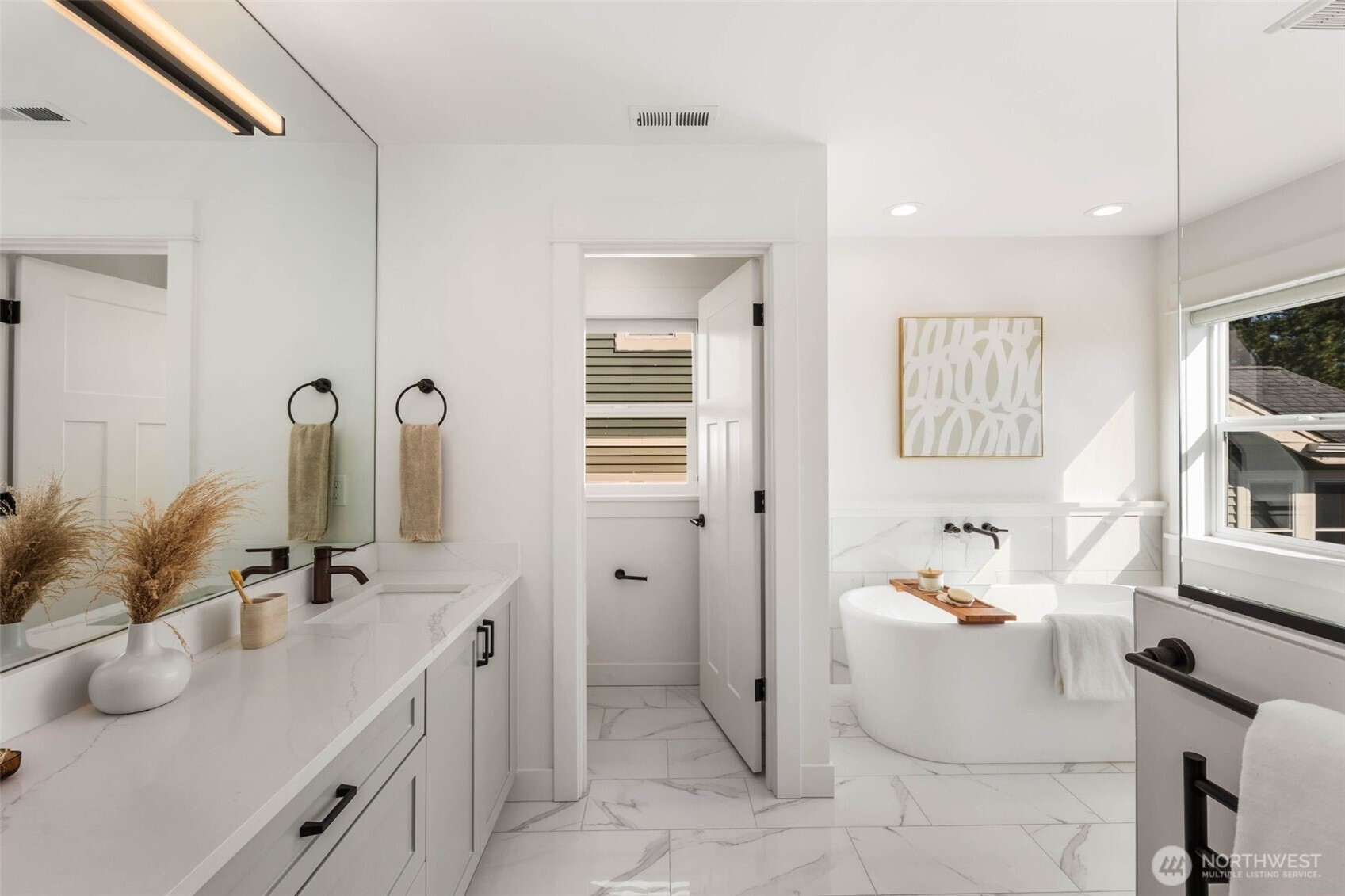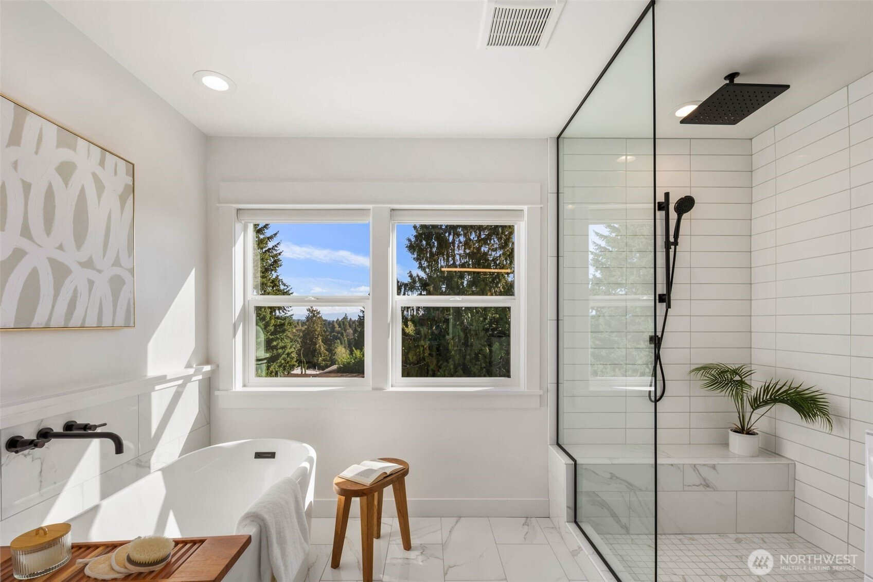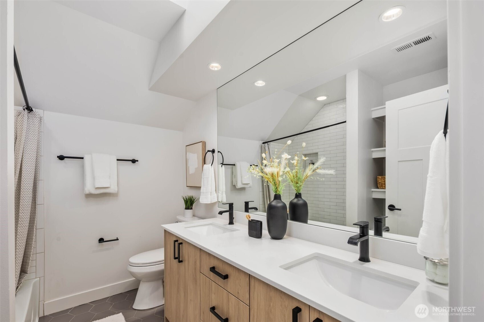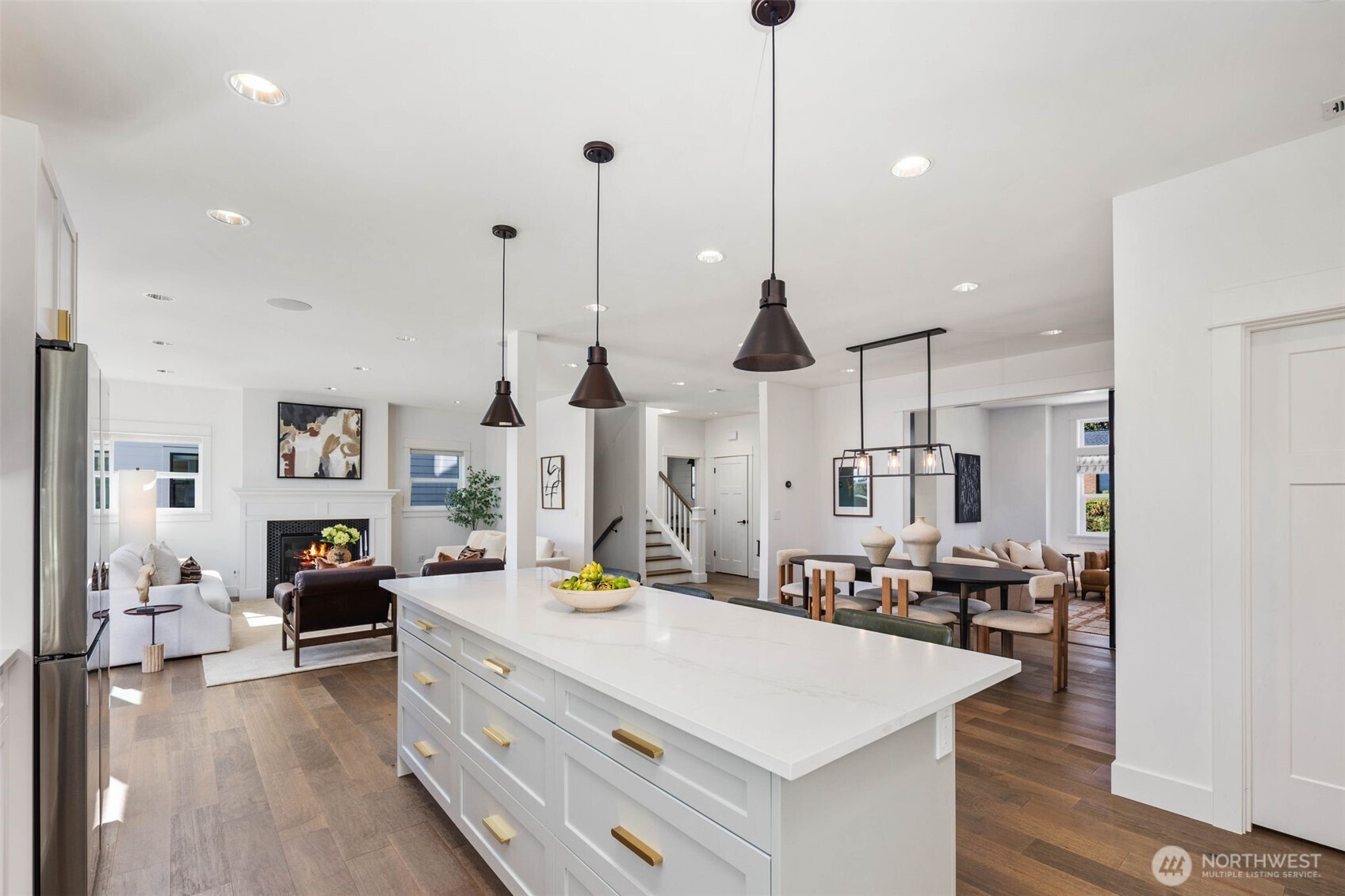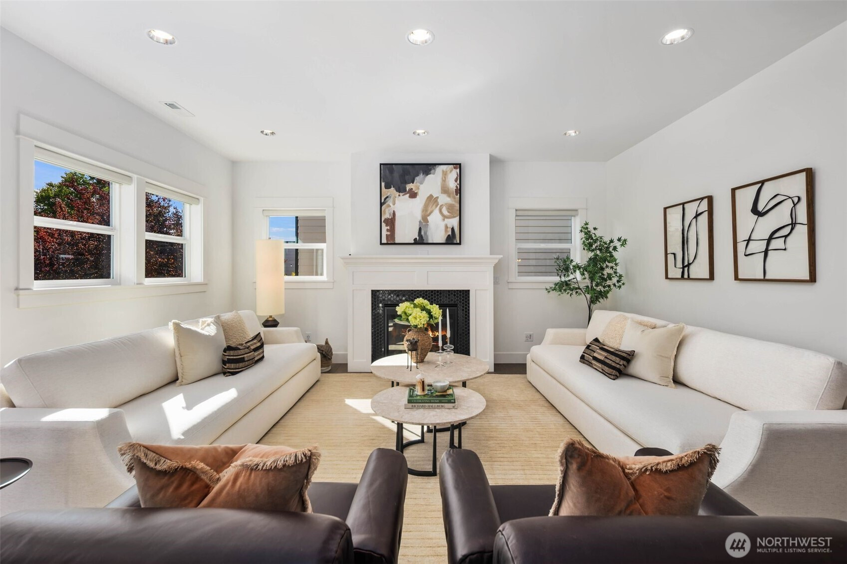 Eastern exposure fills this Maple Leaf home with beautiful natural light throughout the day and captures breathtaking sunrises over the Cascade Mountains and Mt. Rainier. Built in 2021 with timeless design in mind, the main level is ideal for both everyday living and entertaining, featuring an open floor plan anchored by a gourmet kitchen with high-end appliances, generous counter space, and a massive walk-in pantry. The kitchen flows seamlessly into the living and dining areas and opens to a spacious deck, perfect for morning coffee or evening gatherings. A versatile bonus room on this level offers the ideal space for a home office, playroom, or flex space to suit your needs. Upstairs, three bedrooms are thoughtfully situated on one level, including a serene primary suite complete with dual walk-in closets and a spa-inspired bathroom. The lower level provides exceptional flexibility with a large rec room, guest suite, and a covered patio that allows for year-round enjoyment of the expansive backyard, rain or shine. An oversized two-car garage with EV charging and ample storage is a rare find. Additional highlights include built-in speakers, central air conditioning, and a Lutron lighting system with smart-home capabilities, allowing effortless control of lighting, temperature, and sound from anywhere. Just a few blocks from Maple Leaf Park, coffee shops, and restaurants.