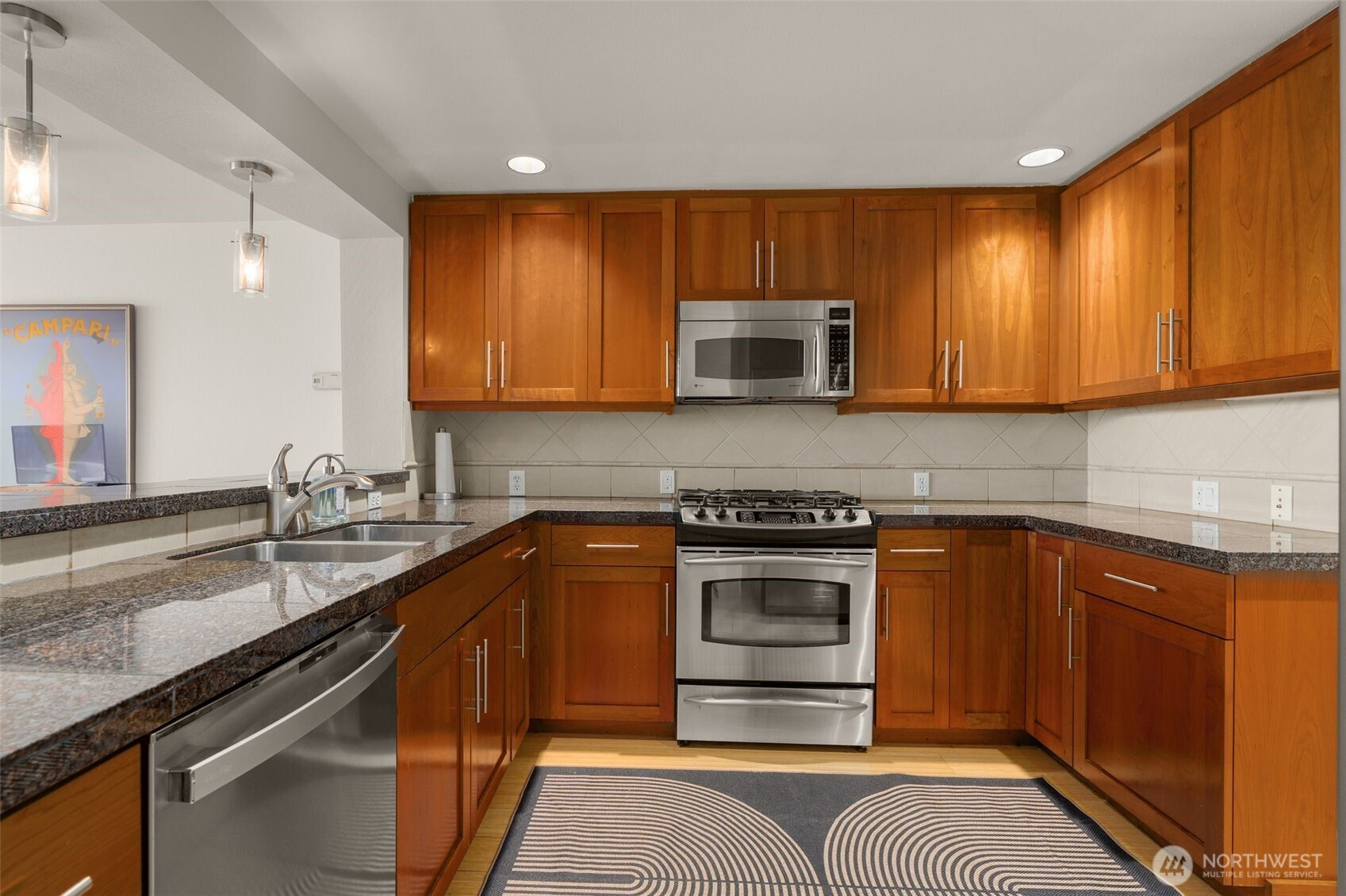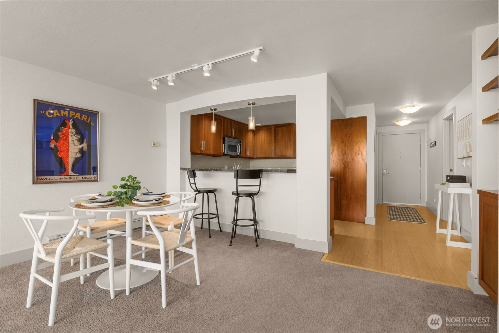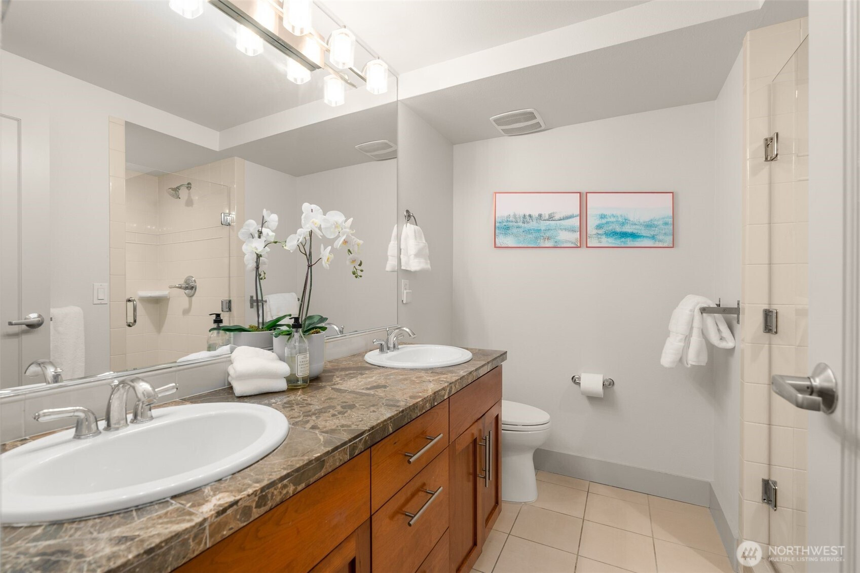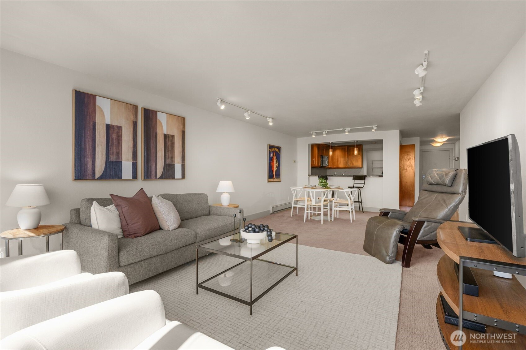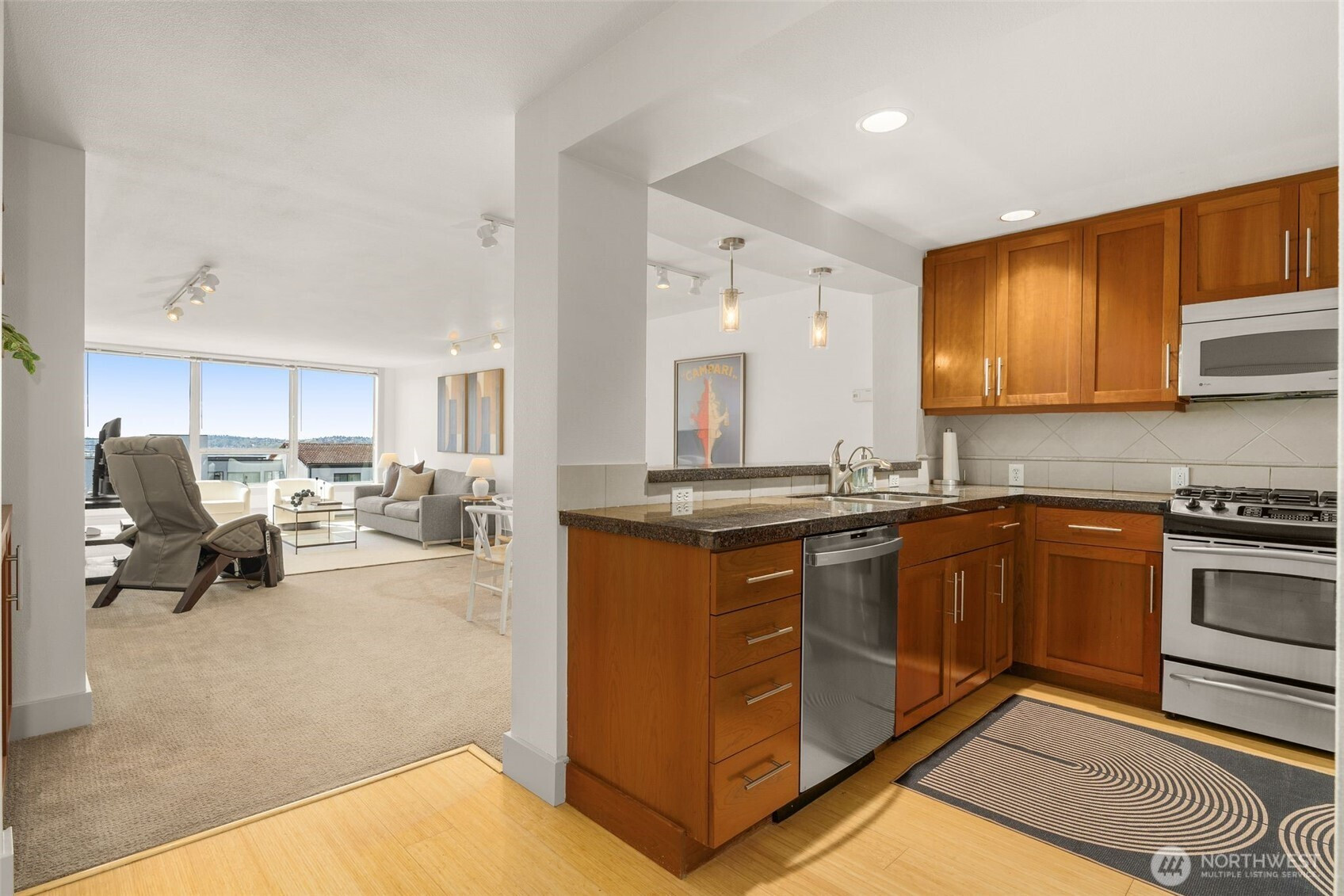 Iconic, unobstructed views of Downtown Seattle, the Space Needle, and Elliott Bay set the tone for this south-facing Queen Anne condo—an ever-changing backdrop you’ll never tire of. Perched on the coveted south slope in a boutique 20-unit building, this light-filled home offers 2 bedrooms, 1.75 baths, including a comfortable primary suite, and a well-designed 1,110 square foot layout. The updated kitchen features gas cooking, cherry cabinetry, granite countertops, stainless steel appliances, and a breakfast bar perfect for your morning routine, while expansive south-facing windows bring in beautiful natural light throughout the day. Enjoy generous closets and storage, including a large storage area conveniently located just in front of your reserved parking spaces, along with an in-unit washer and dryer. Two deeded parking spaces add rare convenience, and the building is pet-friendly. Ideally located near Queen Anne shopping and dining, South Lake Union, Climate Pledge Arena, and Downtown, with easy access to Myrtle Edwards Park and Seattle Repertory Theatre. Step onto the deck and take in the full, unobstructed panorama, there is no place you would rather start and end your day enjoying the iconic views!