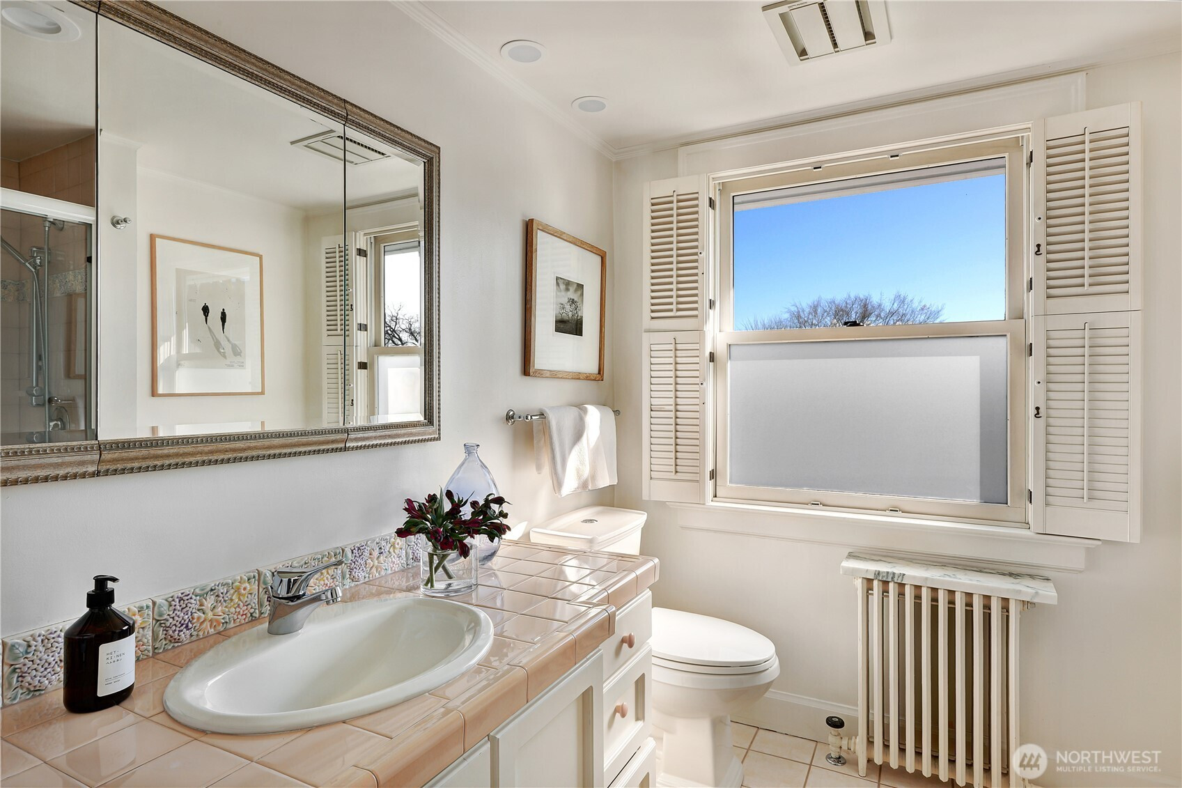On an elegant tree-lined street, a few blocks from Volunteer Park, cafes and shops - this Colonial delivers on every level. The entry foyer and staircase open to generous living and dining rooms. A marble fireplace anchors the living room, with a sunroom and office tucked alongside, that open to a private patio and garden. The dining room catches the afternoon light beautifully and spills out through French doors to a west-facing deck. The kitchen offers a breakfast nook, a desk, and French doors to another sunny deck with Space Needle and mountain views. Upstairs, two bedroom suites with walk-in closets, offer real comfort - including a primary with a sitting area and private outdoor space. Architectural details have been preserved throughout – exquisite leaded glass front door, coved ceilings, beautiful molding and wainscoting, and stained glass windows in the upper hall. The lower level provides a family/media room opening to a sun-washed patio and mature garden. A second kitchen, a cozy bedroom, and a new three-quarter bath make this level completely self-contained - ideal as a guest suite/separate apartment or simply enjoyed as part of the home. Additionally - a rare two-car garage.