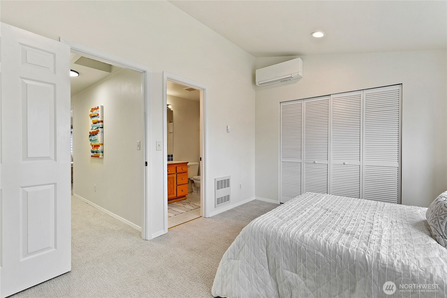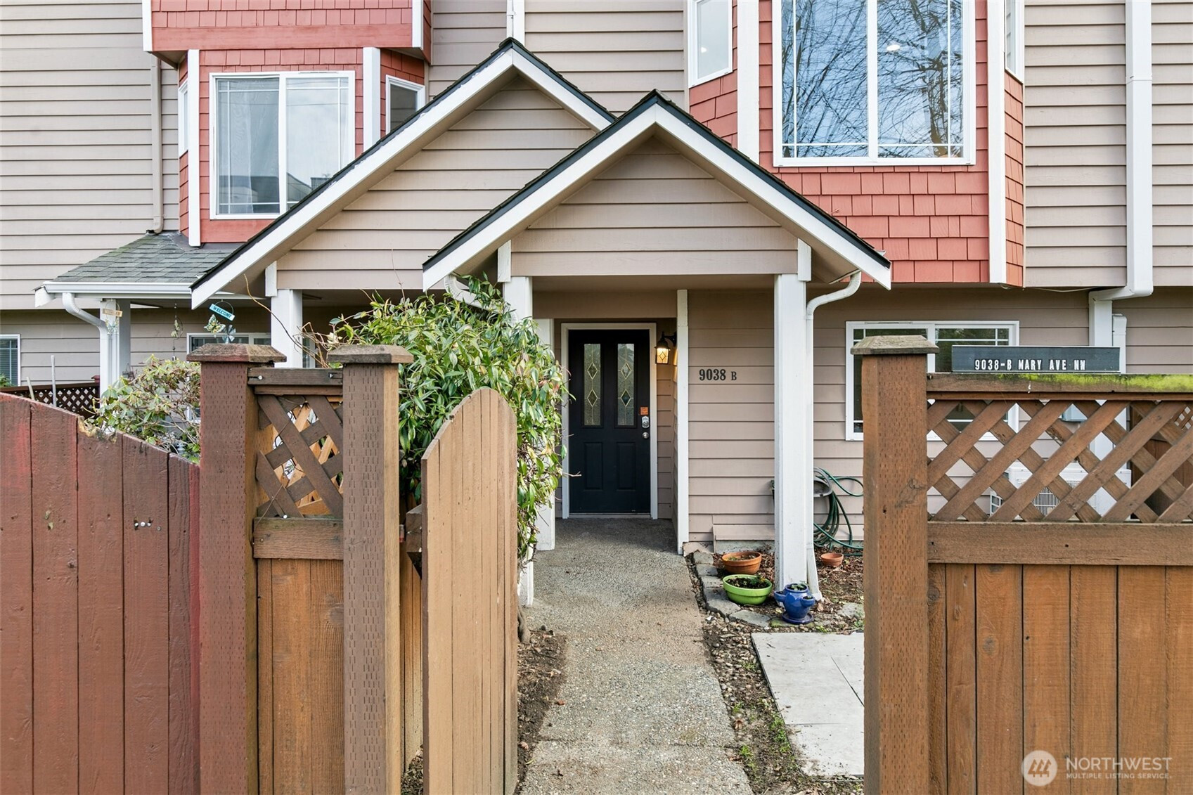 This bright, well-maintained no-HOA townhome surprises with an exceptional sense of space and a layout that truly lives large. Enter through a private fenced yard with patio before stepping inside where you’ll find a good-sized bedroom, a full bath, and the convenient garage with laundry and storage. On the main floor’s circular layout, a spacious eat-in kitchen with quartz counters and beautiful oak floors flows into a true dining room and a large living room with half bath. Upstairs, two sizable bedrooms feature vaulted ceilings and dedicated en-suite baths. Fresh paint, abundant natural light, and ample windows amplify the cheerful feel. Its convenient location near shops, transit, and amenities rounds out a truly compelling offering.