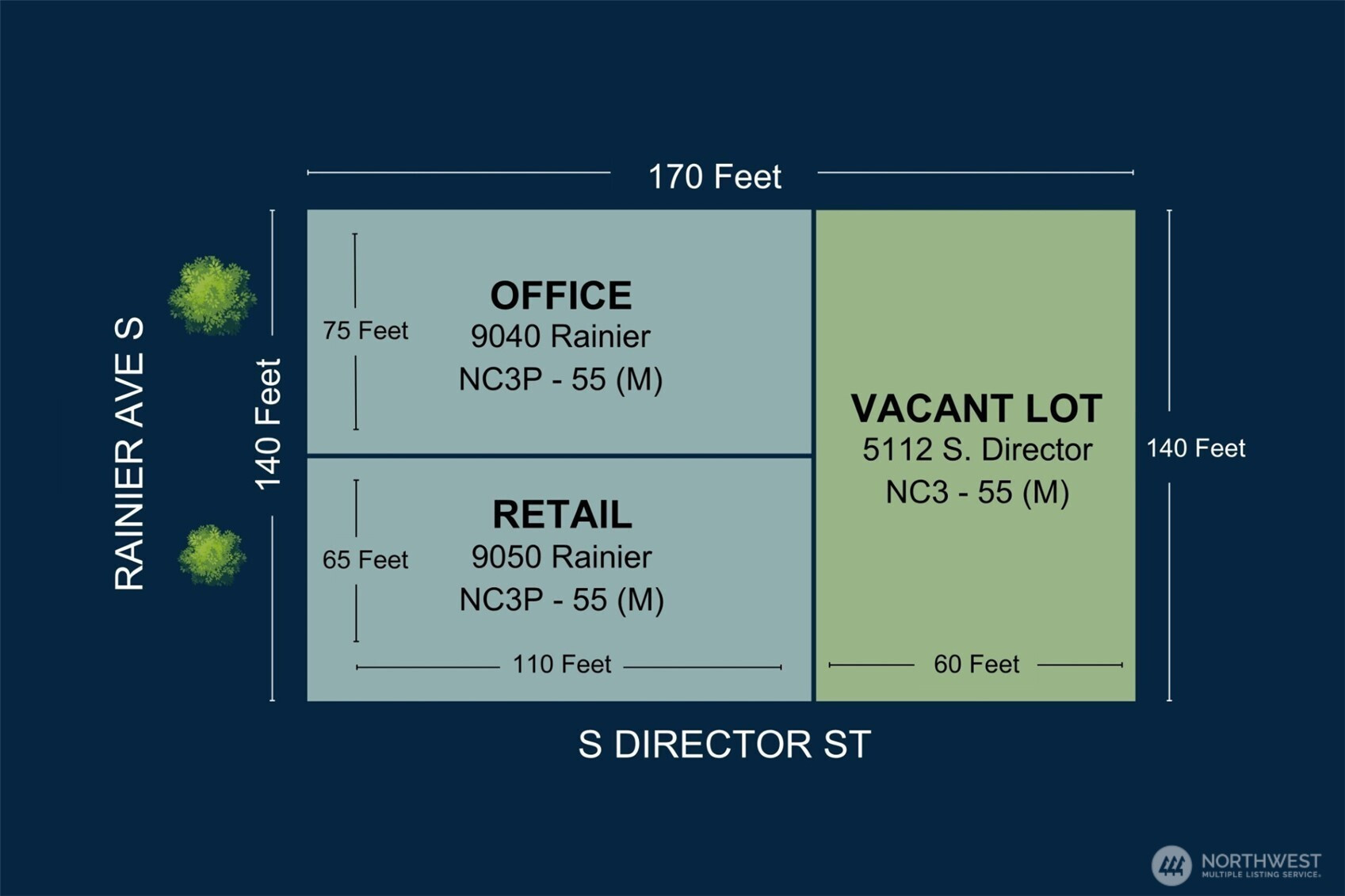 Prime 23,800 Square Foot 140x170 Level Corner Commercial Development Site/Lot with Maximum street Visability with High Traffic count in the Heart of the Rainier Beach Business District that includes Safeway, Safeway Gas Station, Brand New Starbucks, Seattle Public Library, Bank of America Building, Key Bank, Subway Shop, Washington Federal Bank, , McDonalds, KFC/Taco Bell, Planet Fitness, Dollar Tree Store, Burrito California Restaurant, Rainier Beach Dental Clinic 140 Feet Frontage on Rainier Ave South 170 Feet Frontage on South Director Street Three Parcels: ALL PARCELS IN THE OPPORTUNITY ZONE, URBAN CENTER, FREQUENT TRANSIT SERVICE AREA, DESIGN REVIEW EQUITY AREA. Parcel "A" 9040 Rainier Ave South Current Use Office 3704 SF 75x110, 8250 Square Feet, Zoned NC3P-55(M) Parcel "B" 9050 Rainier Ave South. Current Use Retail, 1440 Square Feet 65x110, 7150 Square Feet Zoned NC3P-55(M) Parcel "C" 5112 South Director Vacant Lot 60x140, 8400 Square Feet, Zoned NC3-55(M) UNDER NO CIRCUMSTANCES DISTURB THE TENANTS!!