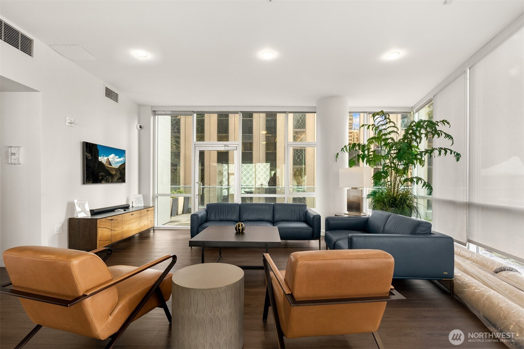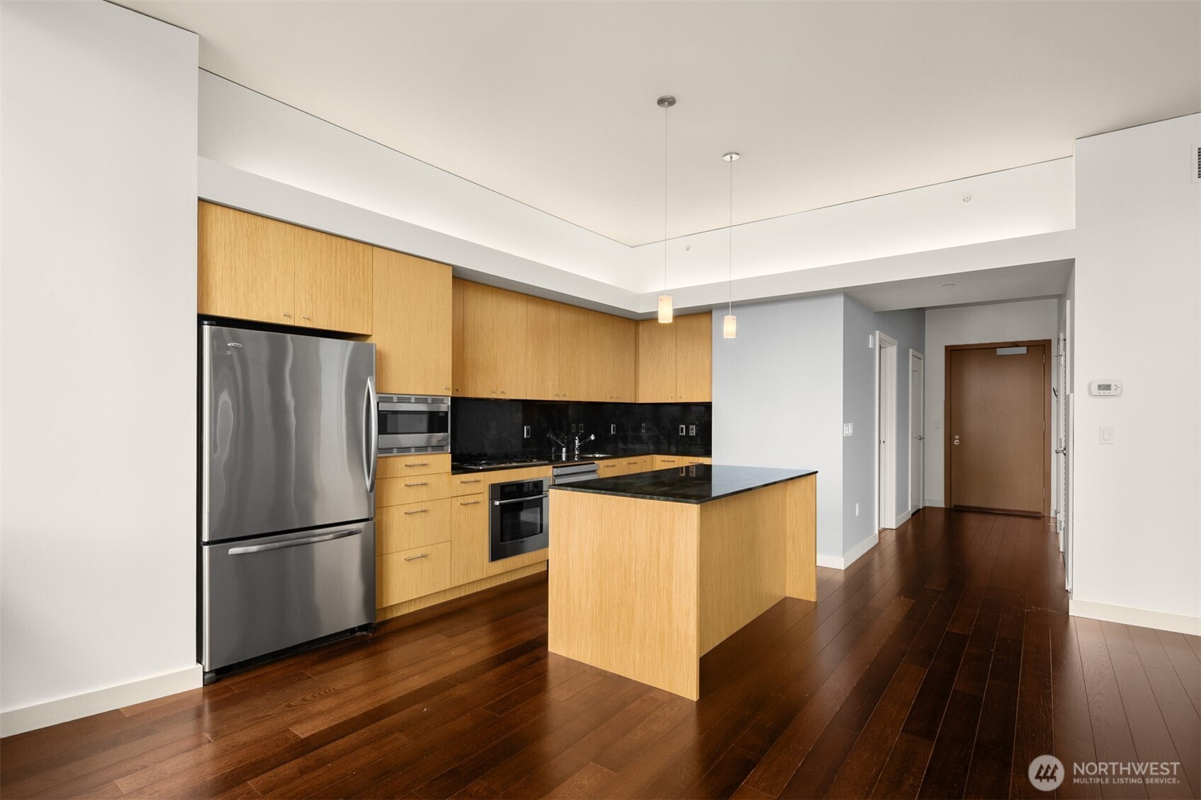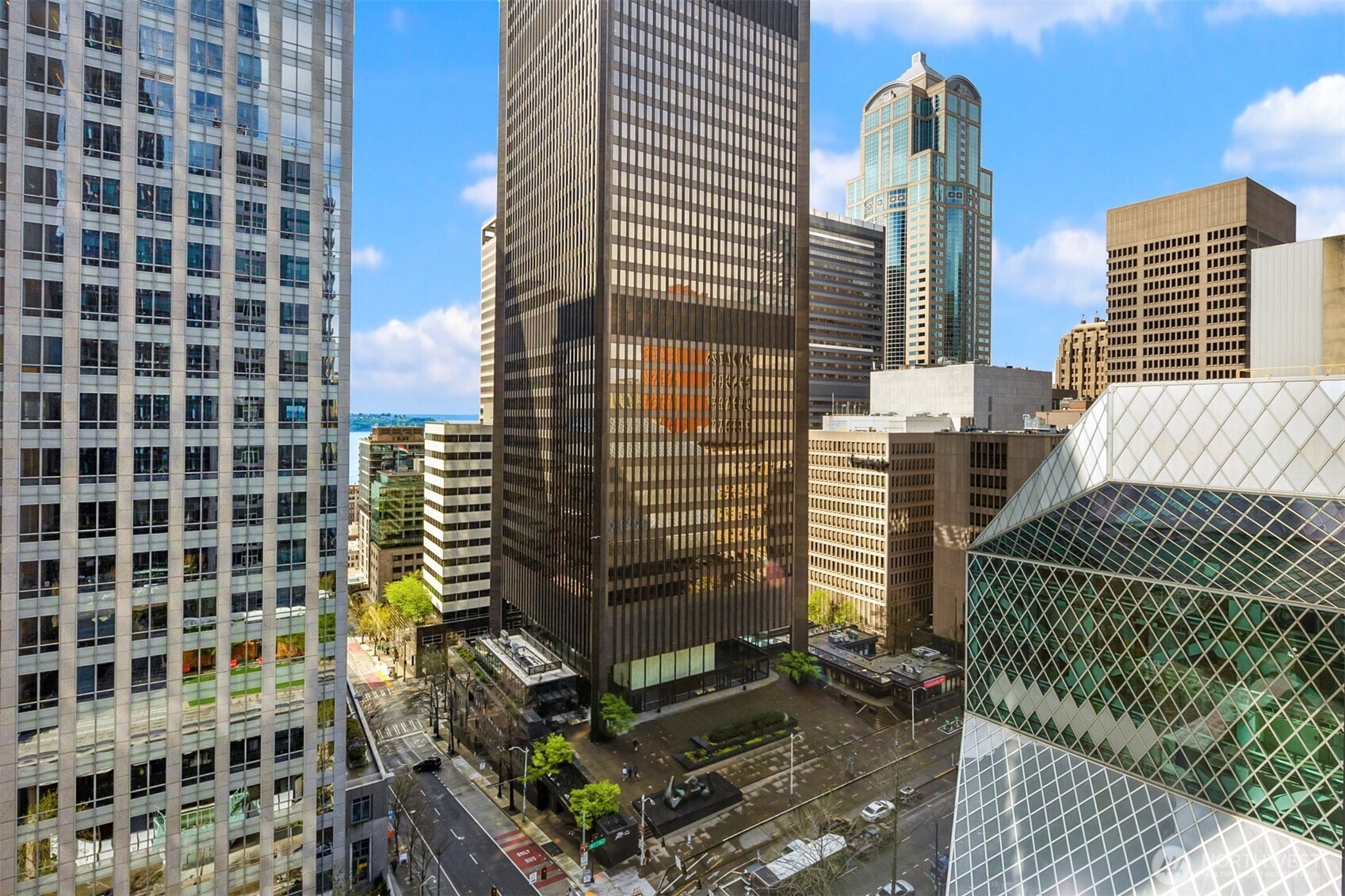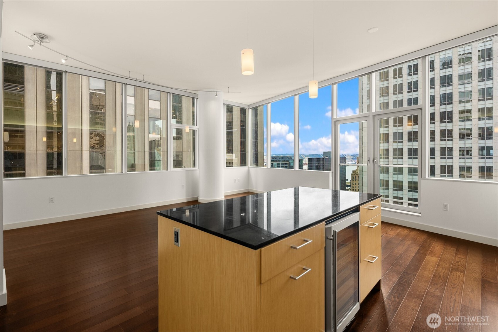 Beautiful downtown Seattle condo at 5th and Madison. Enjoy premium living, an end-unit, and the views of Elliott Bay. Open concept layout, floor-to-ceiling windows flood the space with natural light. Modern finishes, hardwood floors throughout for polished look and feel. 1 generous-size bedroom with walk-in closets, kitchen with granite island, stainless steel appliances, 1 full bath and in unit washer and dryer. Amenities: fitness center, game room & rooftop deck. Walking distance to Pike Place Market for fresh produce, restaurants, grocery stores, and a waterfront park. Comes with 1 assigned parking and storage space. No rental cap