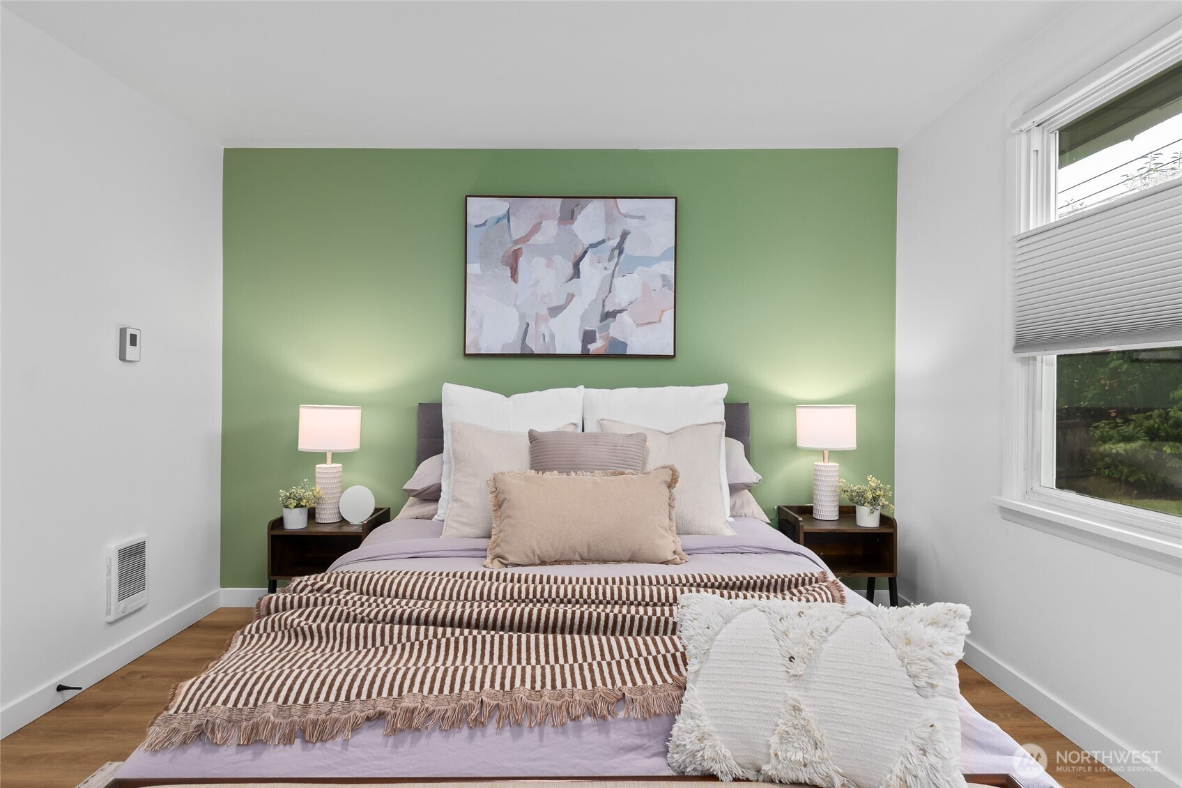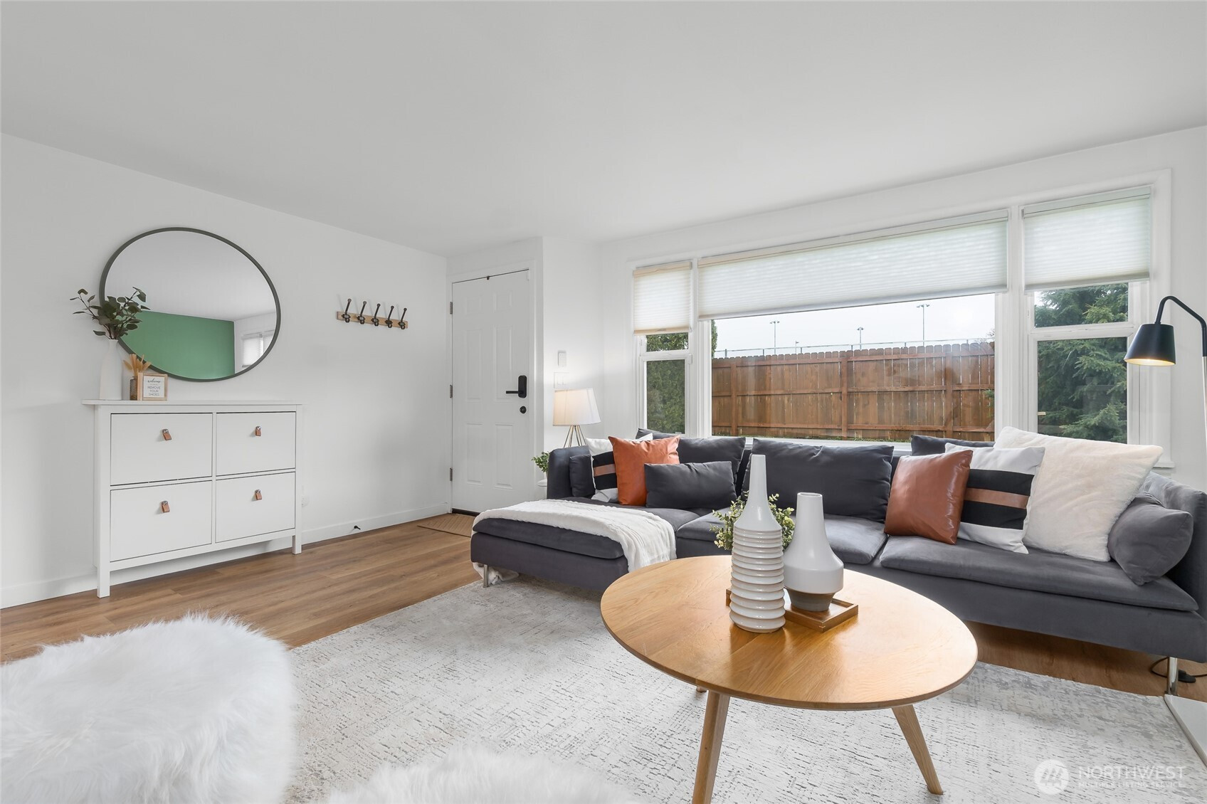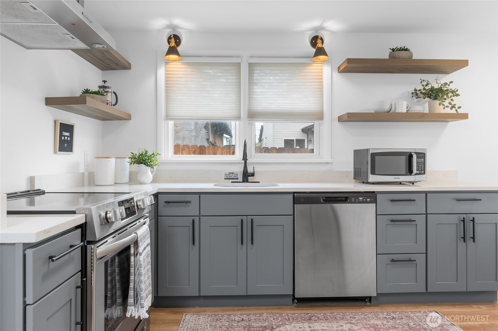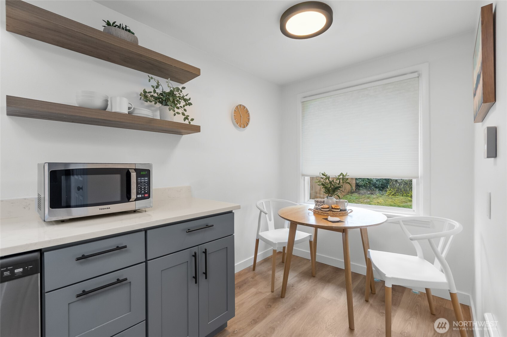 Beautifully updated turnkey 2-bedroom, 1-bath rambler on a spacious flat lot—Great home combining comfort, convenience, and future upside. The bright, inviting interior features a remodeled kitchen with quartz countertops and new appliances, a stylish updated bathroom, cozy breakfast nook, dedicated pantry, and a separate laundry room with washer and dryer. Attached 1-car garage adds everyday ease and storage. Extensive upgrades include a brand-new roof, durable LVP flooring, modern lighting, new heaters, refreshed landscaping, and a newer water heater—offering peace of mind and move-in-ready living. The expansive yard is ideal for entertaining, gardening, or creating your dream outdoor space. Rare opportunity with development potential for a new single-family home or additional units (buyer to verify with city), supported by nearby properties with similar possibilities. Prime location just about 1 mile to Shoreline South/148th Light Rail with direct access to Sea-Tac Airport, University of Washington, and downtown Seattle. Close to parks, shopping, dining, and quick access to Aurora Ave N and I-5. No HOA dues. Shoreline School District. Book your showing today!