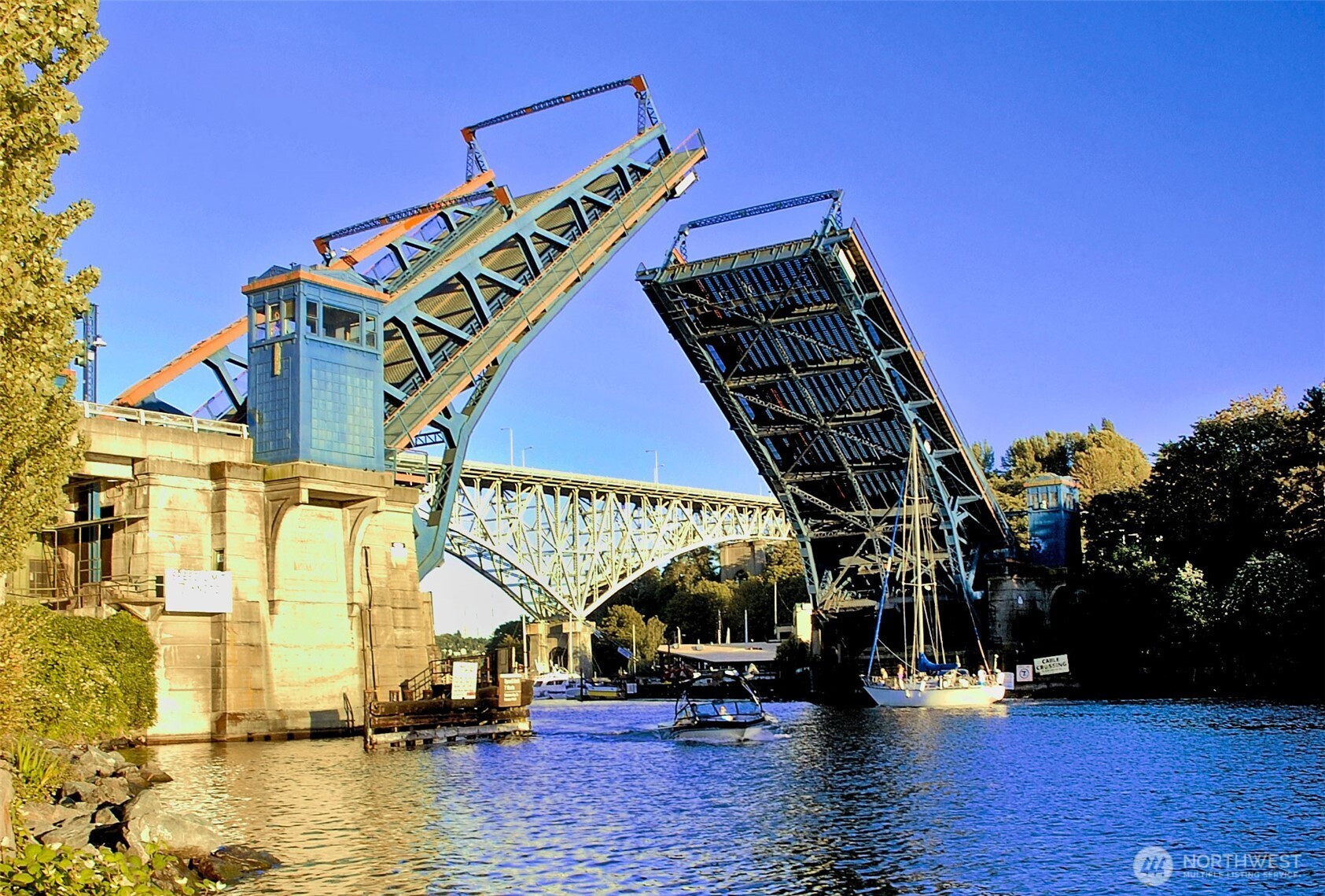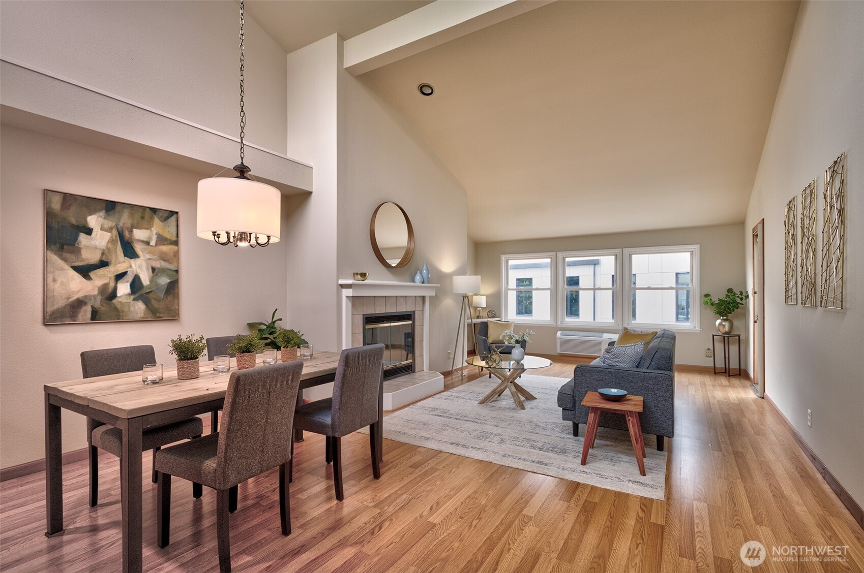 Fremont's vibrant "Center of the Universe" is the location of this top floor, 2 primary bedrooms, single level plan with soaring vaulted ceilings, spacious, sun filled rooms with clerestory windows & 4 skylights throughout. Open kitchen, dining & living area, wood burning fireplace, Primary suite with walk-in closet and a second suite with double closets! Intimate building conveniently located to the business hub for several tech offices, restaurants, shops, public library, Burke Gilman Trail, Lk Washington Rowing Club to name a few village amenities. Inviting South facing deck is the perfect spot for container gardening. Peek-a-boo view of marina on Lake Union and Queen Anne Hill just across the beloved Fremont bridge. Freshly painted and move-in ready! Pet friendly!