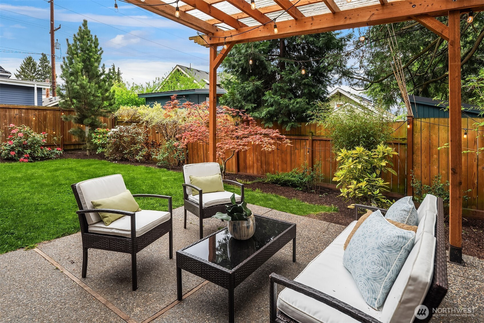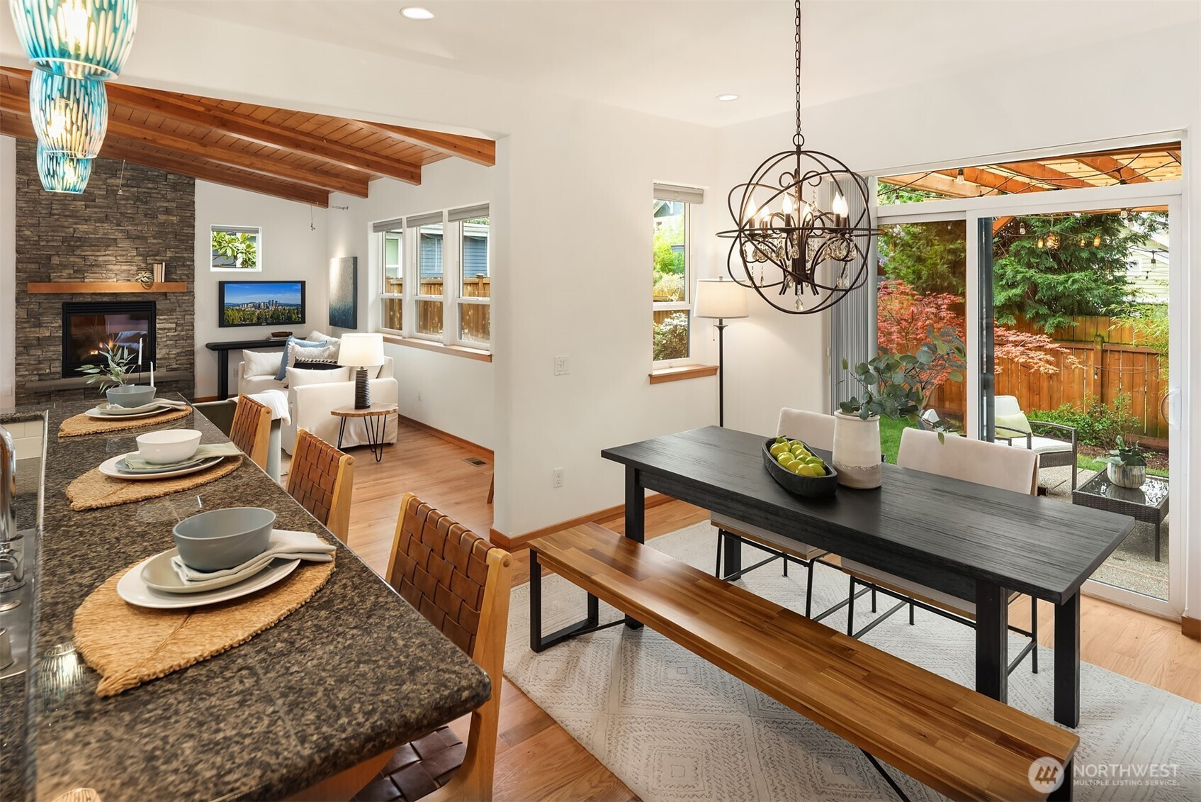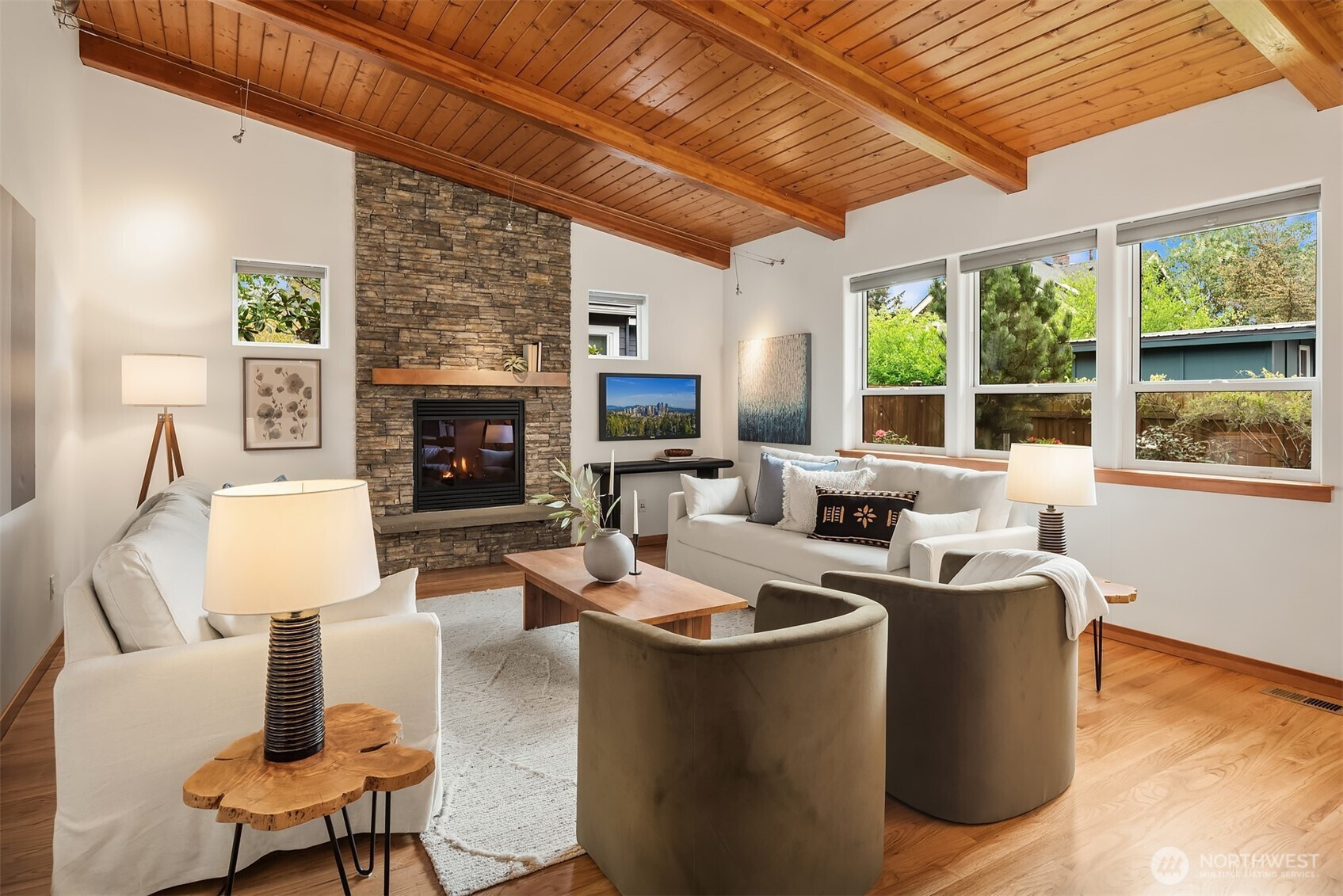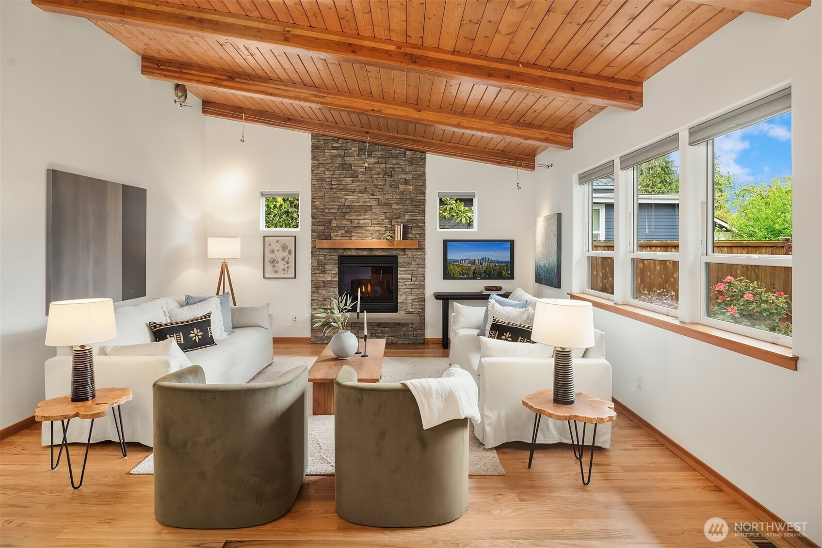 Stunning Northwest Contemporary in the heart of Ballard, built in 2010 with exceptional craftsmanship, high-end finishes, and thoughtful energy-efficient design, including a durable TPO roof. The home blends modern comfort with timeless style—exposed beams, rich hardwood flooring, and a dramatic floor-to-ceiling stone fireplace anchor the light-filled living space. The open-concept main level is designed for effortless living and entertaining, featuring a well-appointed kitchen with stainless steel appliances, an induction stove, a dedicated dining area, and seamless indoor-outdoor flow. A main-level bedroom and powder room offer flexible use for guests, work-from-home needs, or additional living space. Upstairs, you’ll find three bedrooms, including a spacious primary suite with a private balcony and territorial views—an ideal spot to enjoy a quiet morning coffee or unwind at the end of the day. Additional highlights include central A/C for year-round comfort, a convenient pantry, and an attached two-car garage. The serene backyard patio is designed for low-maintenance living, perfect for relaxing or hosting. Ideally located with close proximity to top-rated West Woodland Elementary and just minutes from Ballard’s vibrant shops, dining, and everyday amenities. Well-built, well-located, and move-in ready.