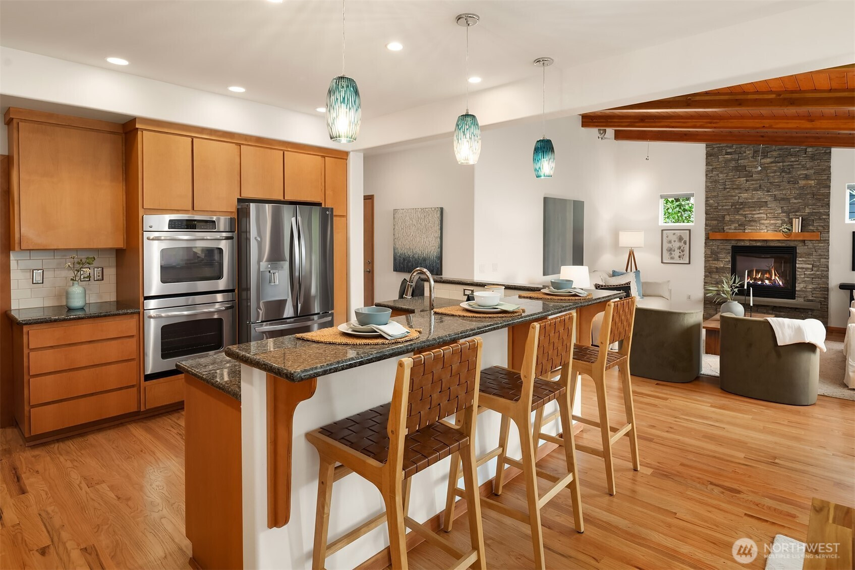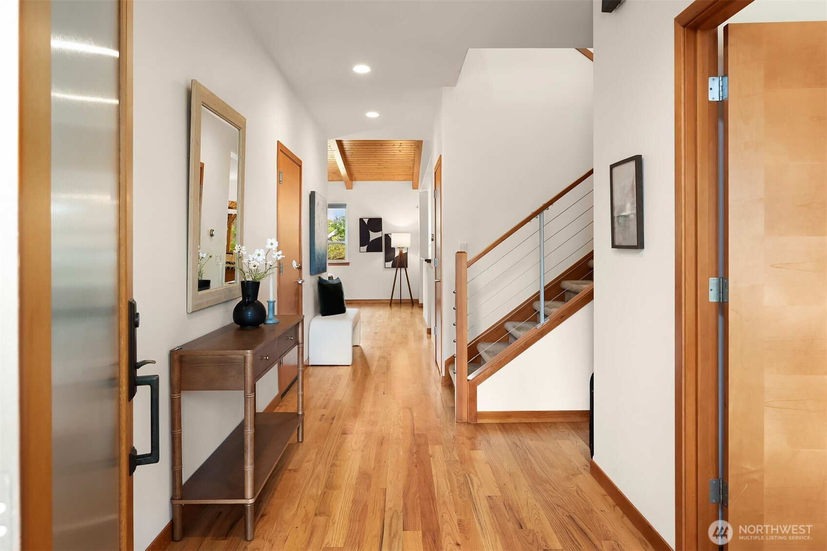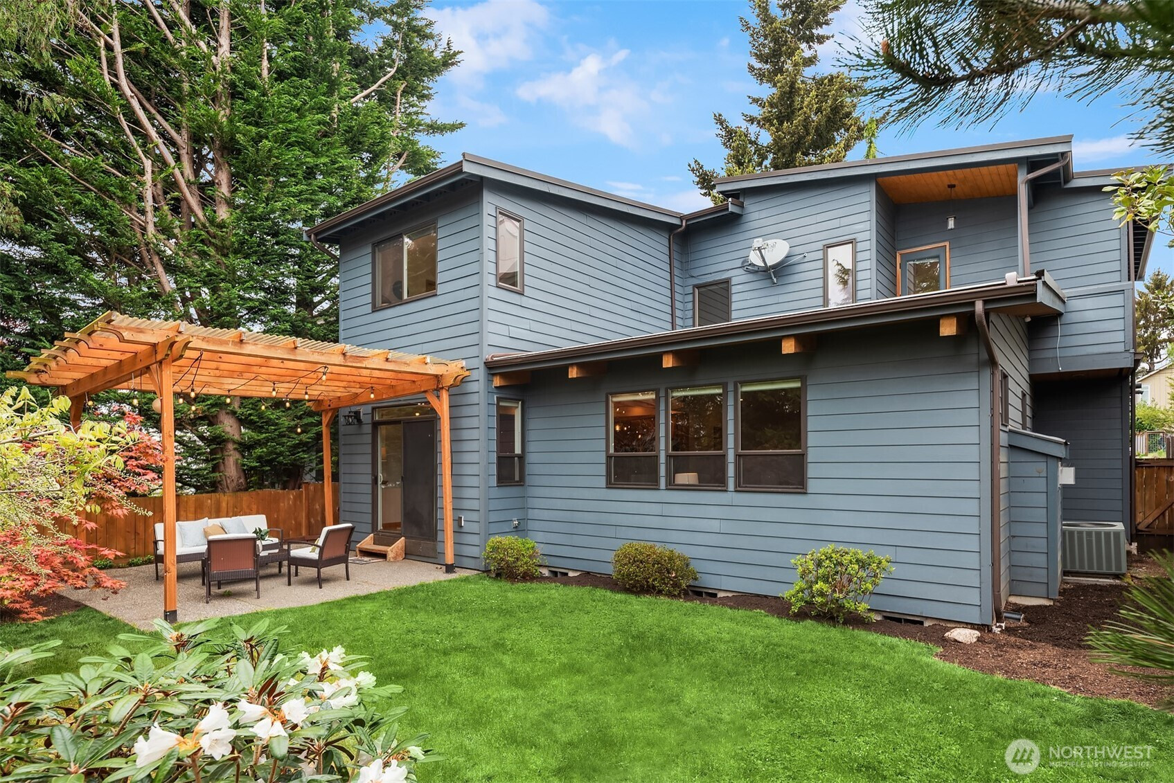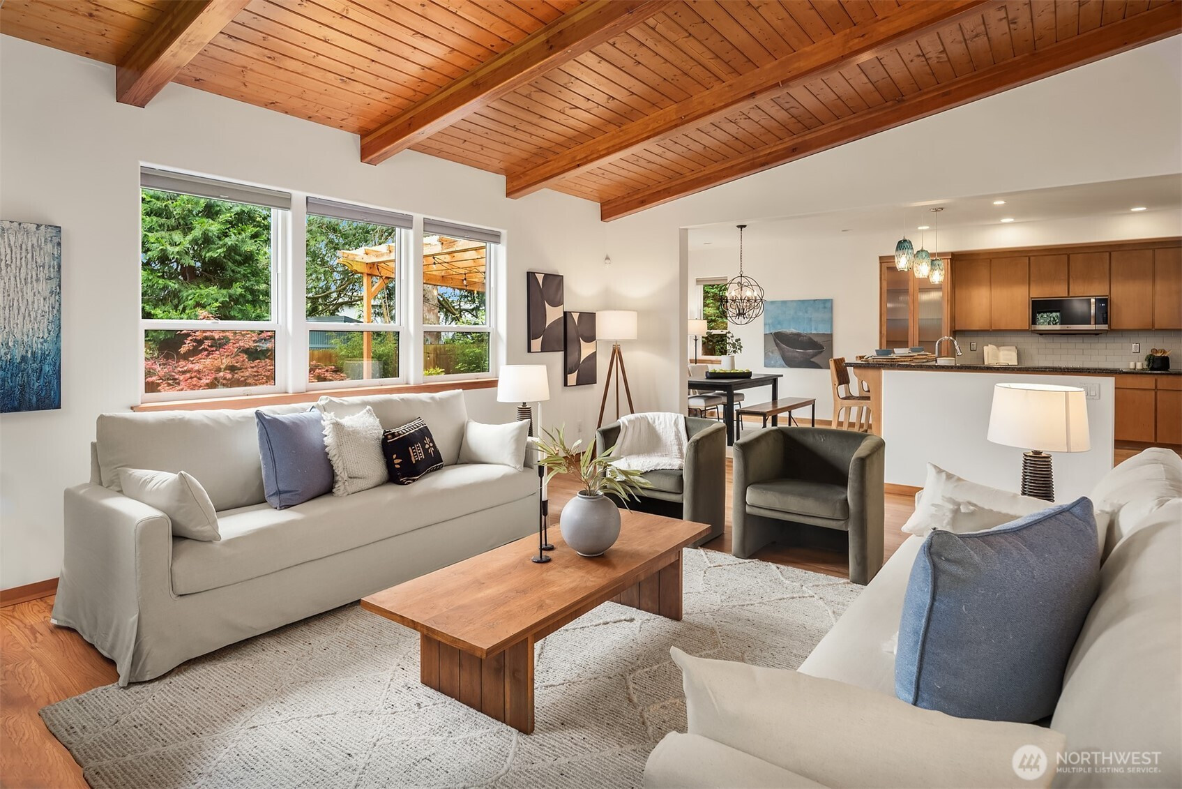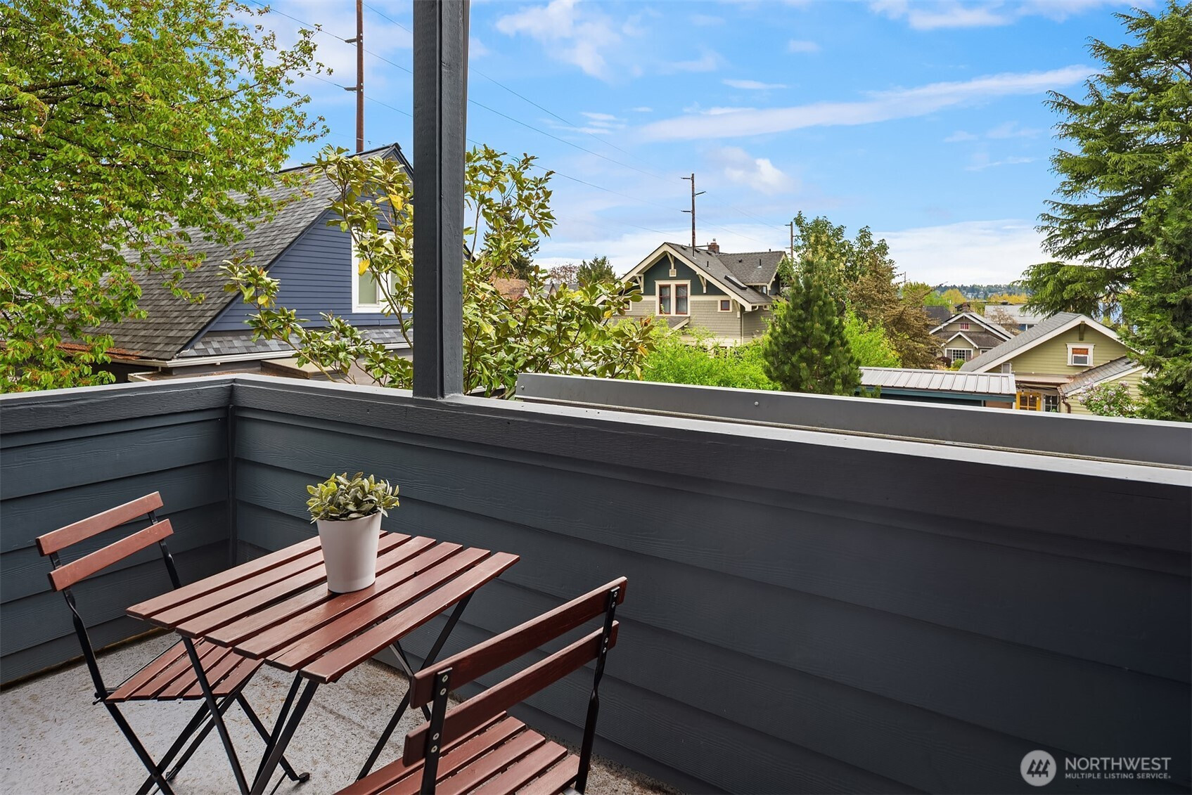 Stunning Northwest Contemporary in the heart of Ballard, built in 2010 with exceptional craftsmanship, high-end finishes, and thoughtful energy-efficient design, including a durable TPO roof. The home blends modern comfort with timeless style—exposed beams, rich hardwood flooring, and a dramatic floor-to-ceiling stone fireplace anchor the light-filled living space. The open-concept main level is designed for effortless living and entertaining, featuring a well-appointed kitchen with stainless steel appliances, an induction stove, a dedicated dining area, and seamless indoor-outdoor flow. A main-level bedroom and powder room offer flexible use for guests, work-from-home needs, or additional living space. Upstairs, you’ll find three bedrooms, including a spacious primary suite with a private balcony and territorial views—an ideal spot to enjoy a quiet morning coffee or unwind at the end of the day. Additional highlights include central A/C for year-round comfort, a convenient pantry, and an attached two-car garage. The serene backyard patio is designed for low-maintenance living, perfect for relaxing or hosting. Ideally located with close proximity to top-rated West Woodland Elementary and just minutes from Ballard’s vibrant shops, dining, and everyday amenities. Well-built, well-located, and move-in ready.