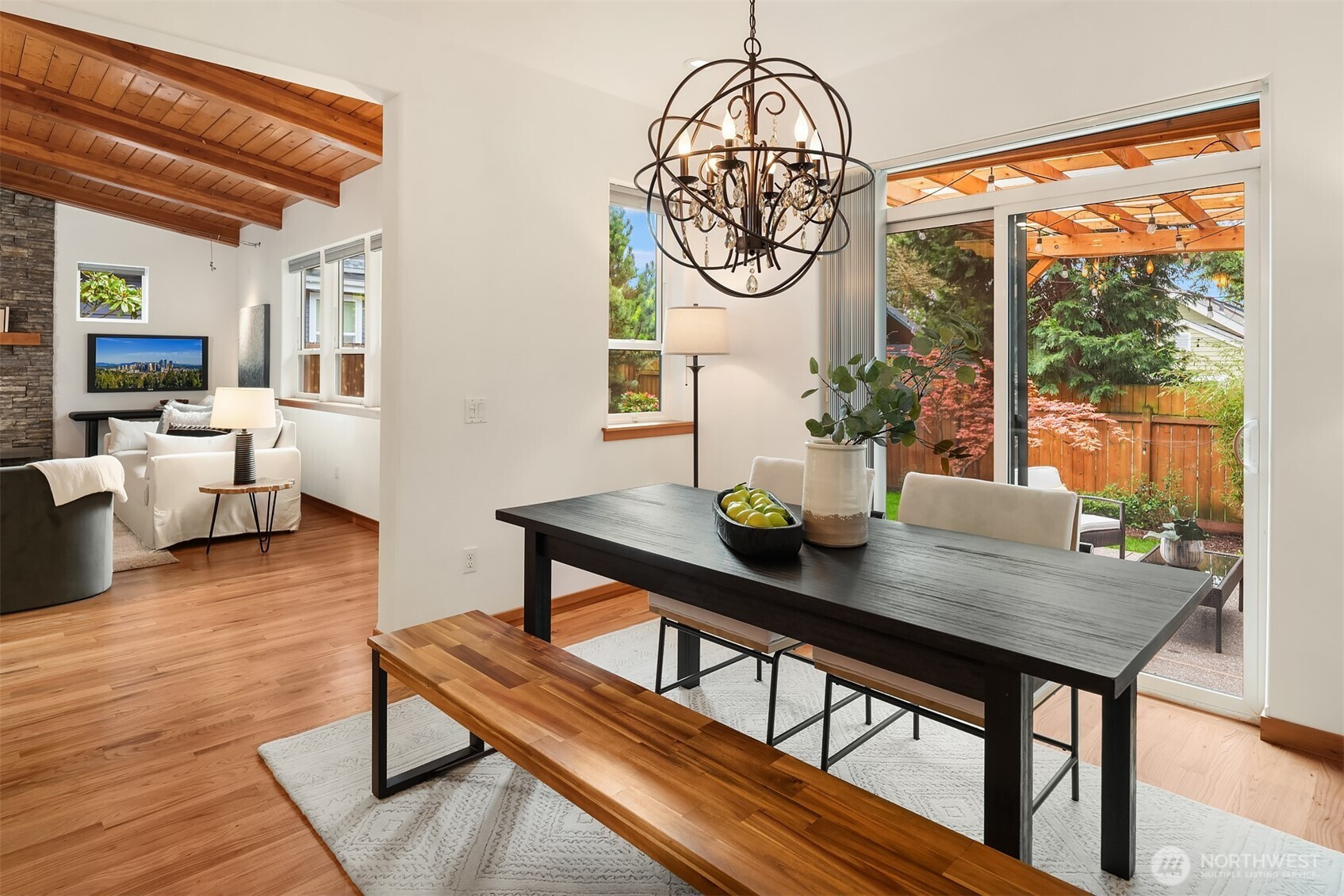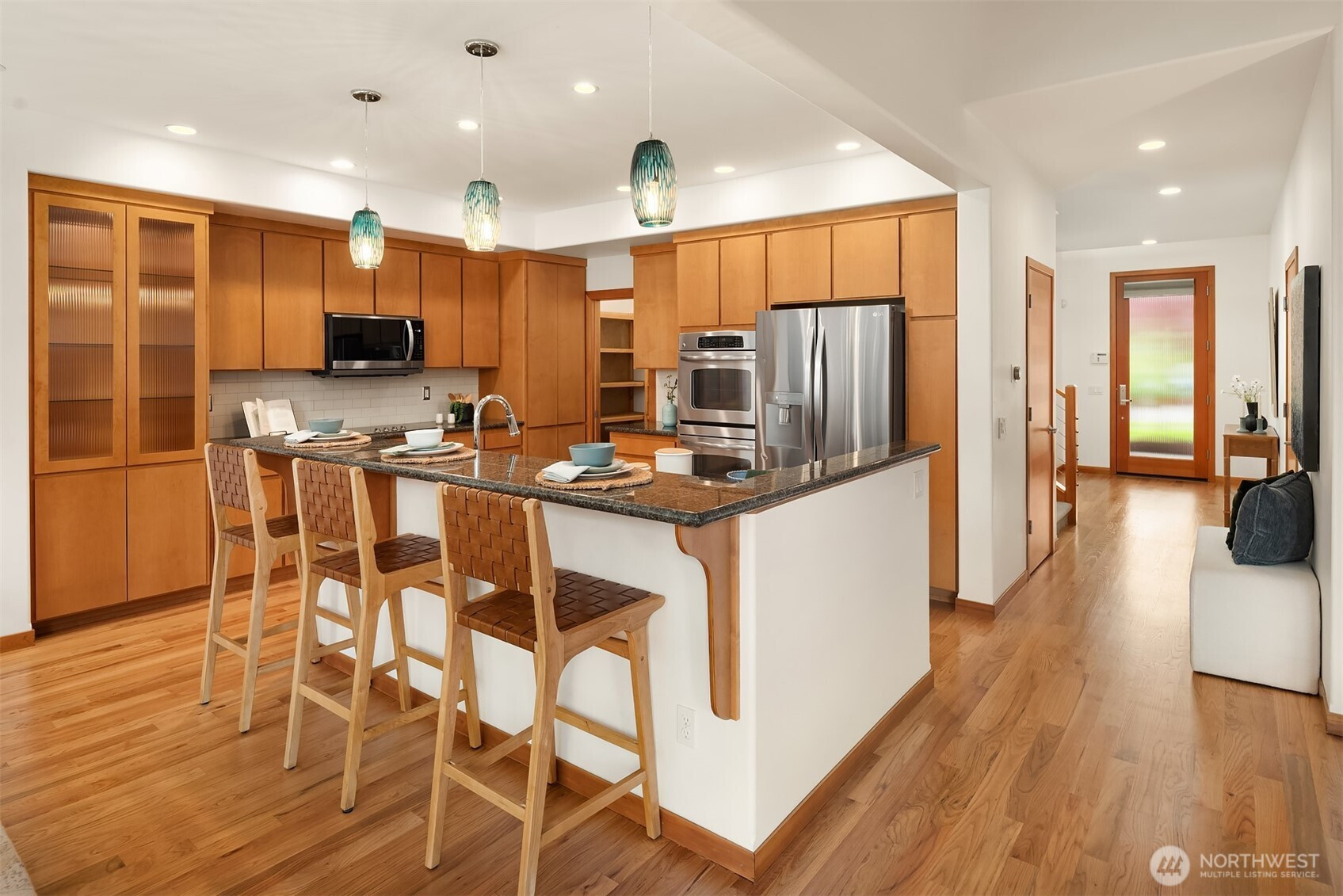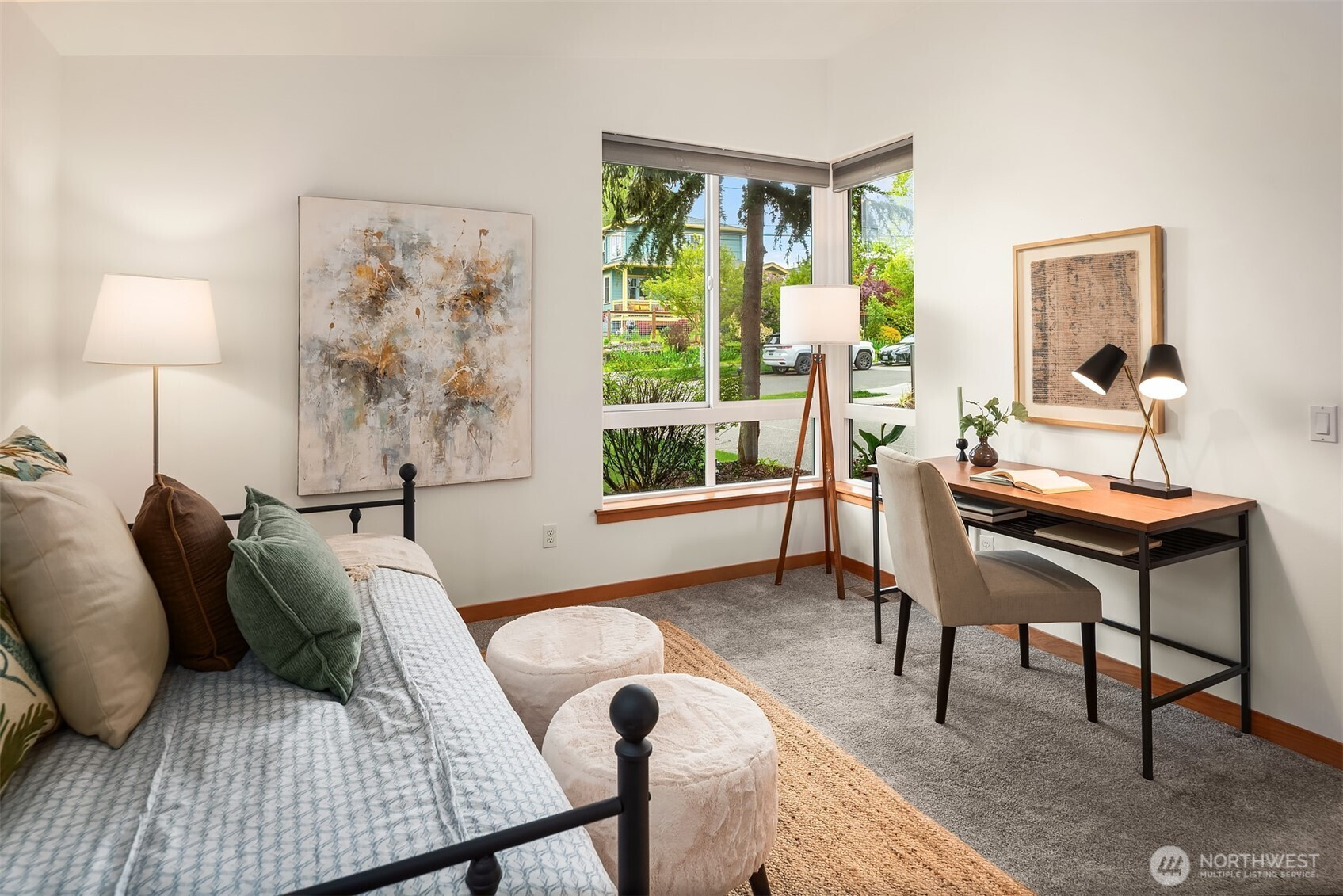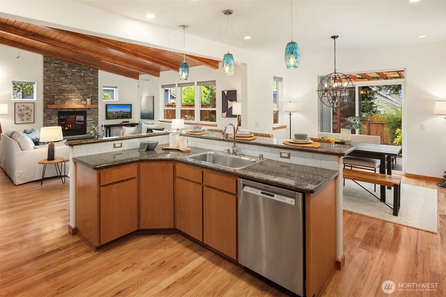 Stunning Northwest Contemporary in the heart of Ballard, built in 2010 with exceptional craftsmanship, high-end finishes, and thoughtful energy-efficient design, including a durable TPO roof. The home blends modern comfort with timeless style—exposed beams, rich hardwood flooring, and a dramatic floor-to-ceiling stone fireplace anchor the light-filled living space. The open-concept main level is designed for effortless living and entertaining, featuring a well-appointed kitchen with stainless steel appliances, an induction stove, a dedicated dining area, and seamless indoor-outdoor flow. A main-level bedroom and powder room offer flexible use for guests, work-from-home needs, or additional living space. Upstairs, you’ll find three bedrooms, including a spacious primary suite with a private balcony and territorial views—an ideal spot to enjoy a quiet morning coffee or unwind at the end of the day. Additional highlights include central A/C for year-round comfort, a convenient pantry, and an attached two-car garage. The serene backyard patio is designed for low-maintenance living, perfect for relaxing or hosting. Ideally located with close proximity to top-rated West Woodland Elementary and just minutes from Ballard’s vibrant shops, dining, and everyday amenities. Well-built, well-located, and move-in ready.