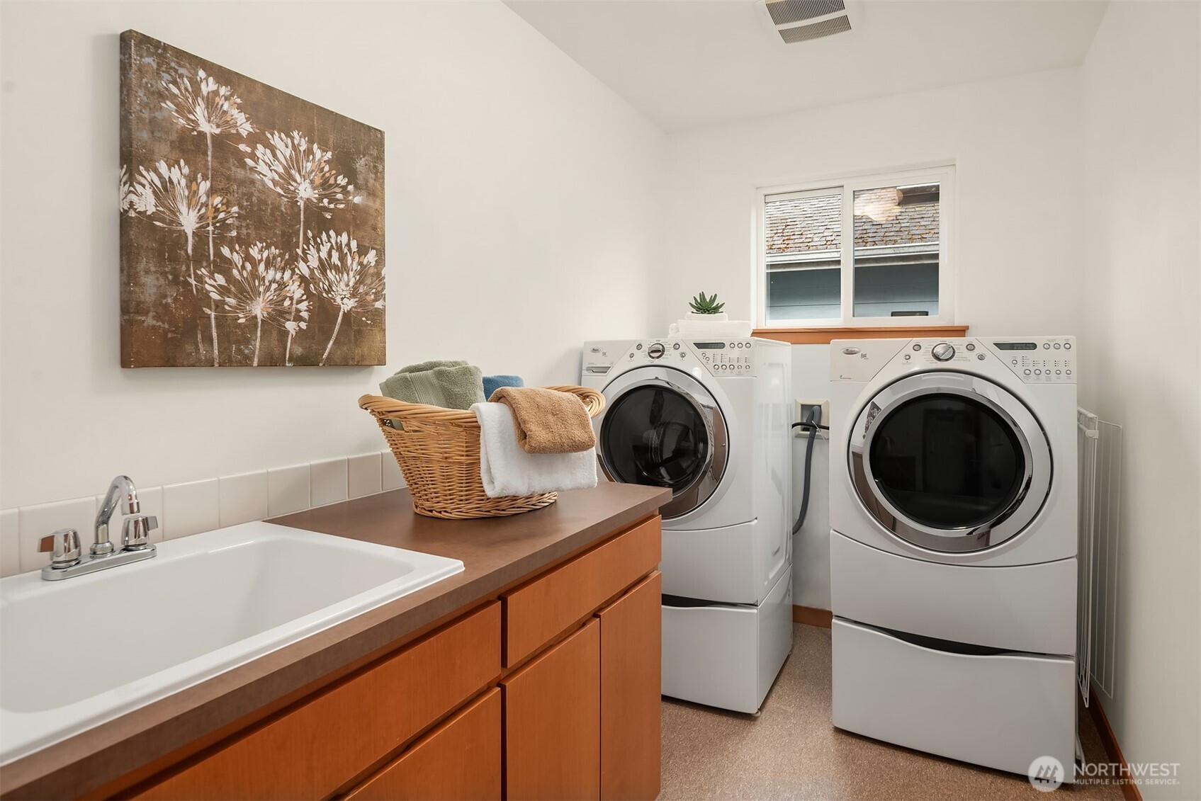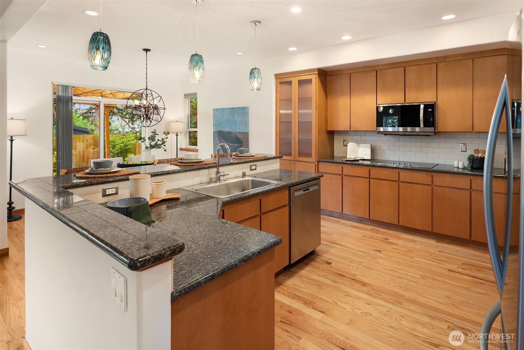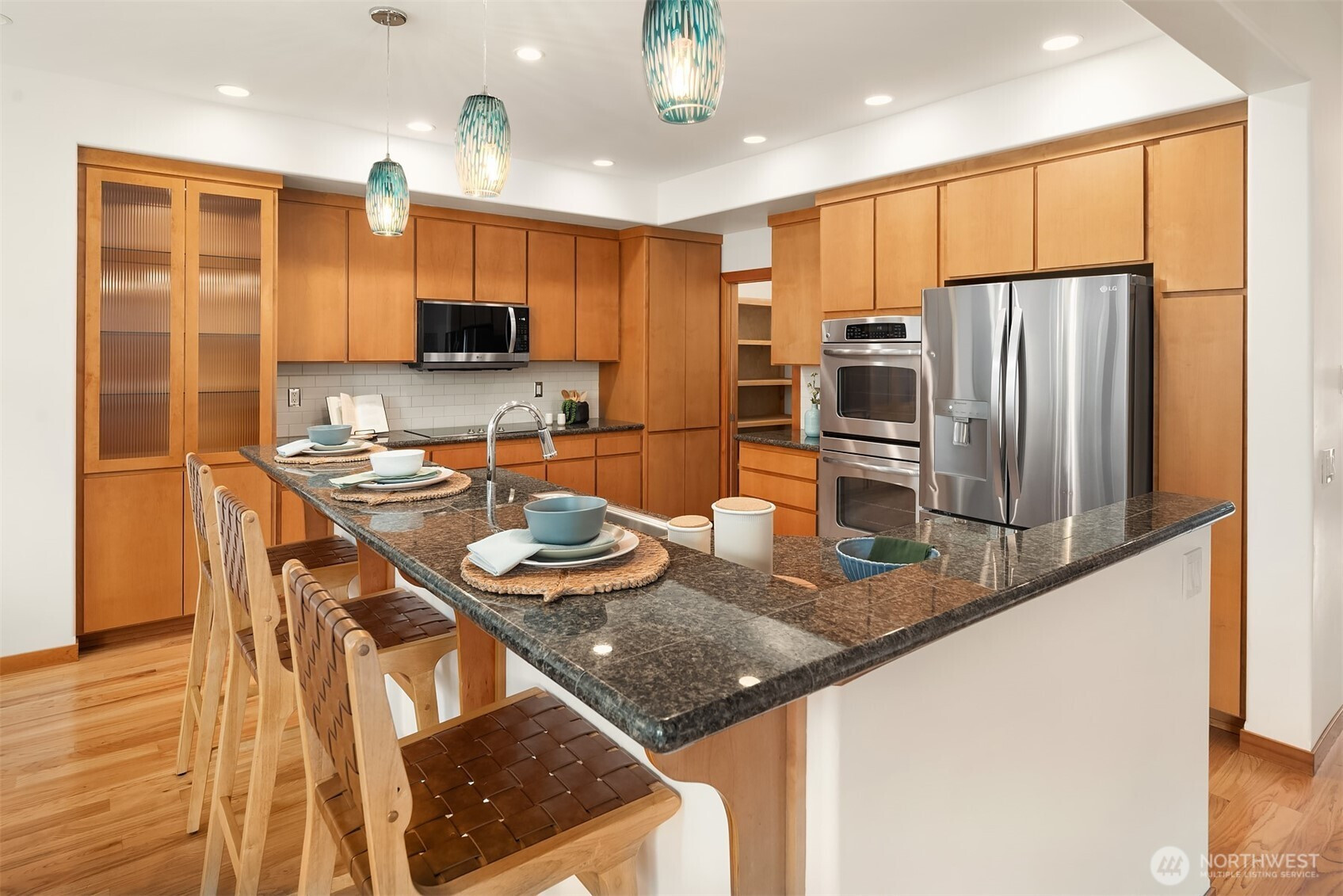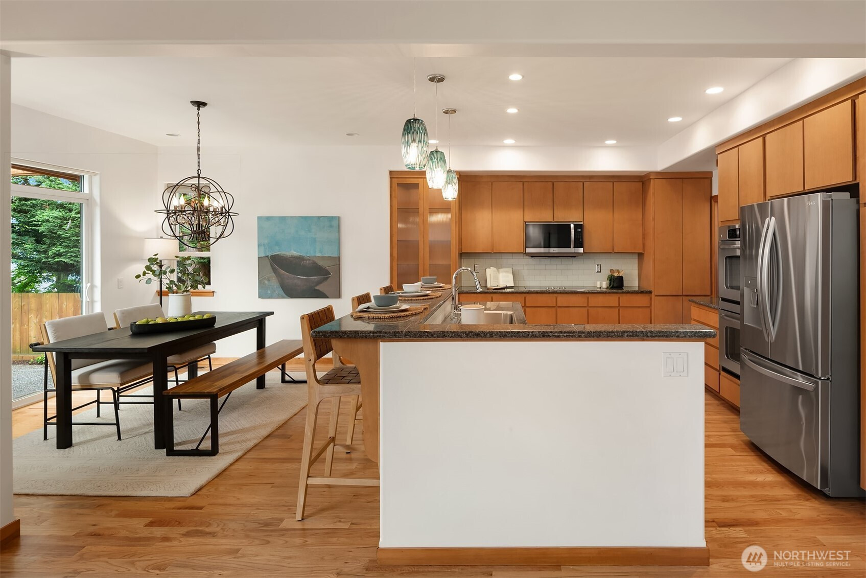 Stunning Northwest Contemporary in the heart of Ballard, built in 2010 with exceptional craftsmanship, high-end finishes, and thoughtful energy-efficient design, including a durable TPO roof. The home blends modern comfort with timeless style—exposed beams, rich hardwood flooring, and a dramatic floor-to-ceiling stone fireplace anchor the light-filled living space. The open-concept main level is designed for effortless living and entertaining, featuring a well-appointed kitchen with stainless steel appliances, an induction stove, a dedicated dining area, and seamless indoor-outdoor flow. A main-level bedroom and powder room offer flexible use for guests, work-from-home needs, or additional living space. Upstairs, you’ll find three bedrooms, including a spacious primary suite with a private balcony and territorial views—an ideal spot to enjoy a quiet morning coffee or unwind at the end of the day. Additional highlights include central A/C for year-round comfort, a convenient pantry, and an attached two-car garage. The serene backyard patio is designed for low-maintenance living, perfect for relaxing or hosting. Ideally located with close proximity to top-rated West Woodland Elementary and just minutes from Ballard’s vibrant shops, dining, and everyday amenities. Well-built, well-located, and move-in ready.