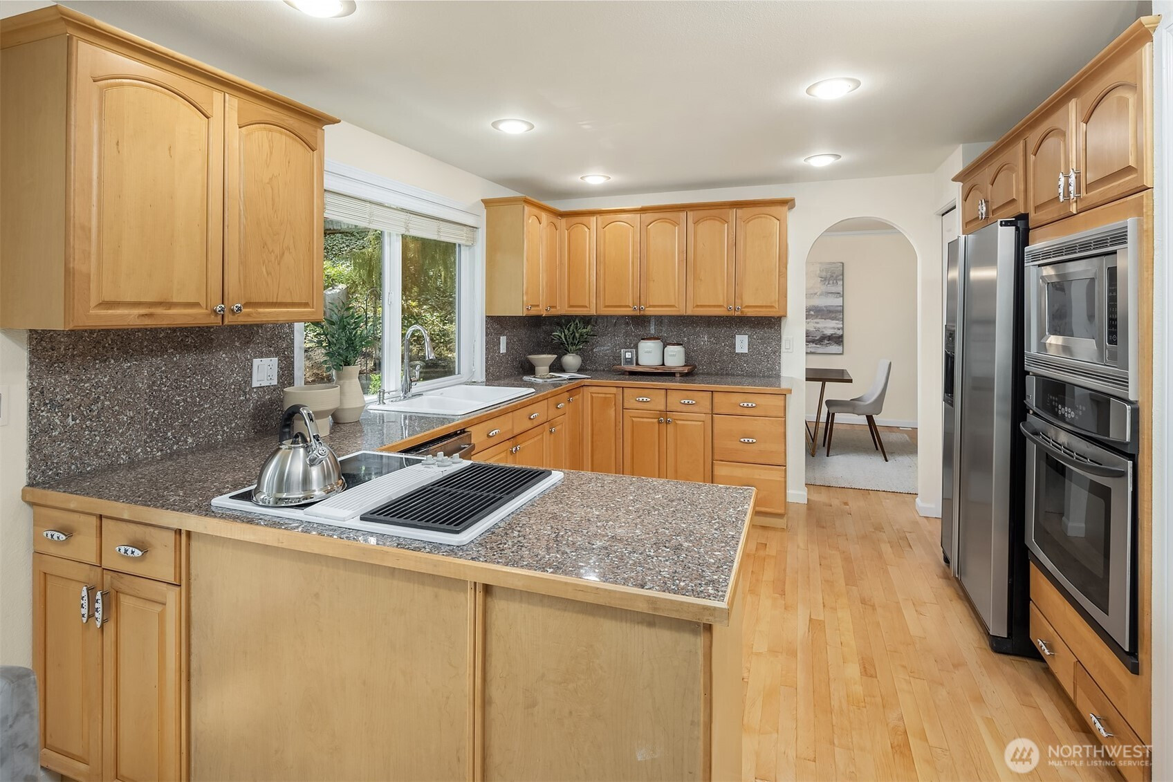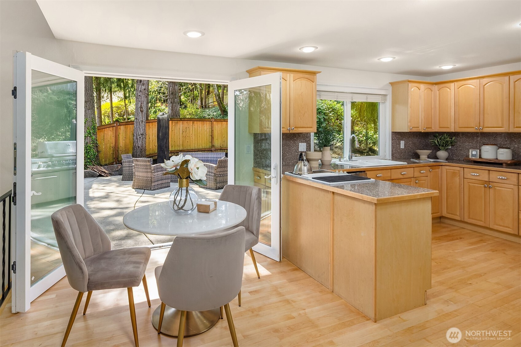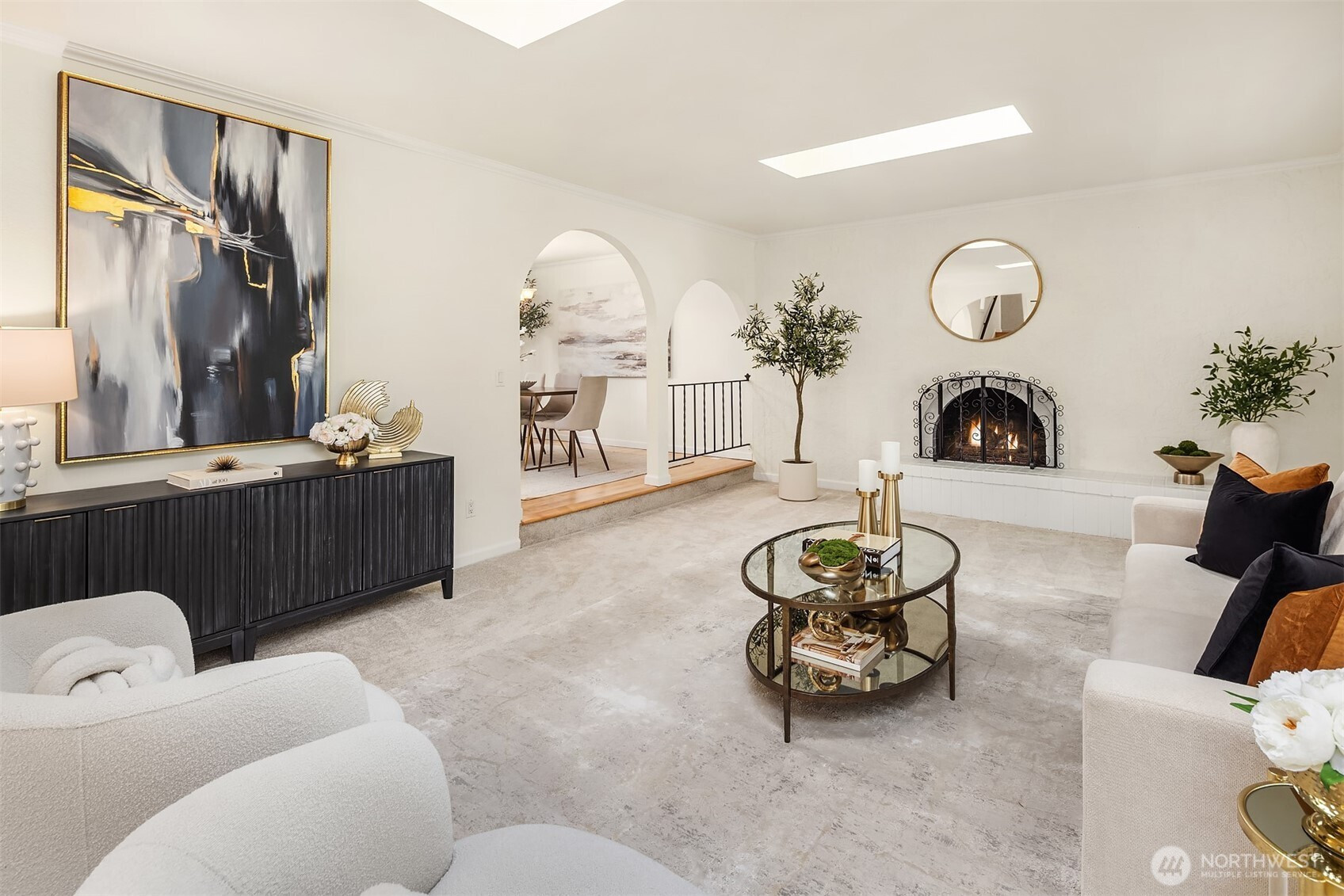 Set on a quiet oversized corner lot, this Mediterranean-inspired home offers light-filled living and functional flexibility throughout. Skylights and French doors bring in abundant natural light, while dual living spaces anchored by a wood-burning fireplace create comfortable gathering areas. The open kitchen features stainless steel appliances, generous cabinetry, and easy flow to the main living areas. A finished daylight basement adds valuable bonus space for a media room, office, gym, or guests. Upstairs bedrooms provide privacy, with peek-a-boo lake views adding a subtle highlight. Outside, the private backyard is thoughtfully designed for effortless entertaining, featuring a firepit, built-in BBQ area, and flat lawn perfect for play or evening gatherings. Recent improvements, including a new roof, fresh interior paint, and refinished maple floors, provide confidence and move-in-ready appeal. A rare blend of character, light, and lifestyle in a setting that feels both private and connected.