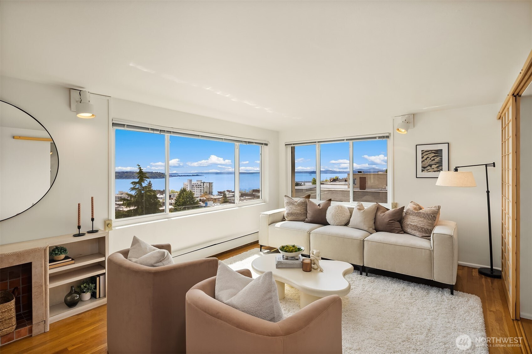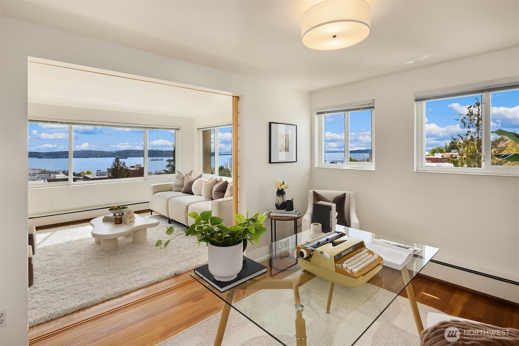Perched on the top floor of Hadley House, this 2-bedroom, 1-bath co-op captures the kind of sweeping Seattle views buyers dream about—Elliott Bay, the Space Needle, downtown lights, ferry traffic, Alki, and all the way to the Olympics. A sought-after Queen Anne co-op, Hadley House is prized for its panoramic views, larger living spaces, and well-managed community. Offered for the first time in over 35 years, this is a rare opportunity to own a top-floor home in one of Queen Anne’s most beloved co-op communities. Tucked into the desirable lower south slope, it offers that rare balance of peaceful residential living and close proximity to Seattle Center, Climate Pledge Arena, dining, parks, and transit. Inside, the floor plan lives larger than many newer condos, with generous living spaces, hardwood floors, fresh interior paint, updated kitchen and lighting, and a flexible second bedroom ideal for guests, office, or den use. Residents enjoy a rooftop deck with stunning panoramic views, plus bike storage, laundry, a lounge with kitchen, separate storage, and secure lobby access. Monthly dues cover water, sewer, garbage, storage, AND property taxes. Parking may be available through the building by waitlist for an additional cost.