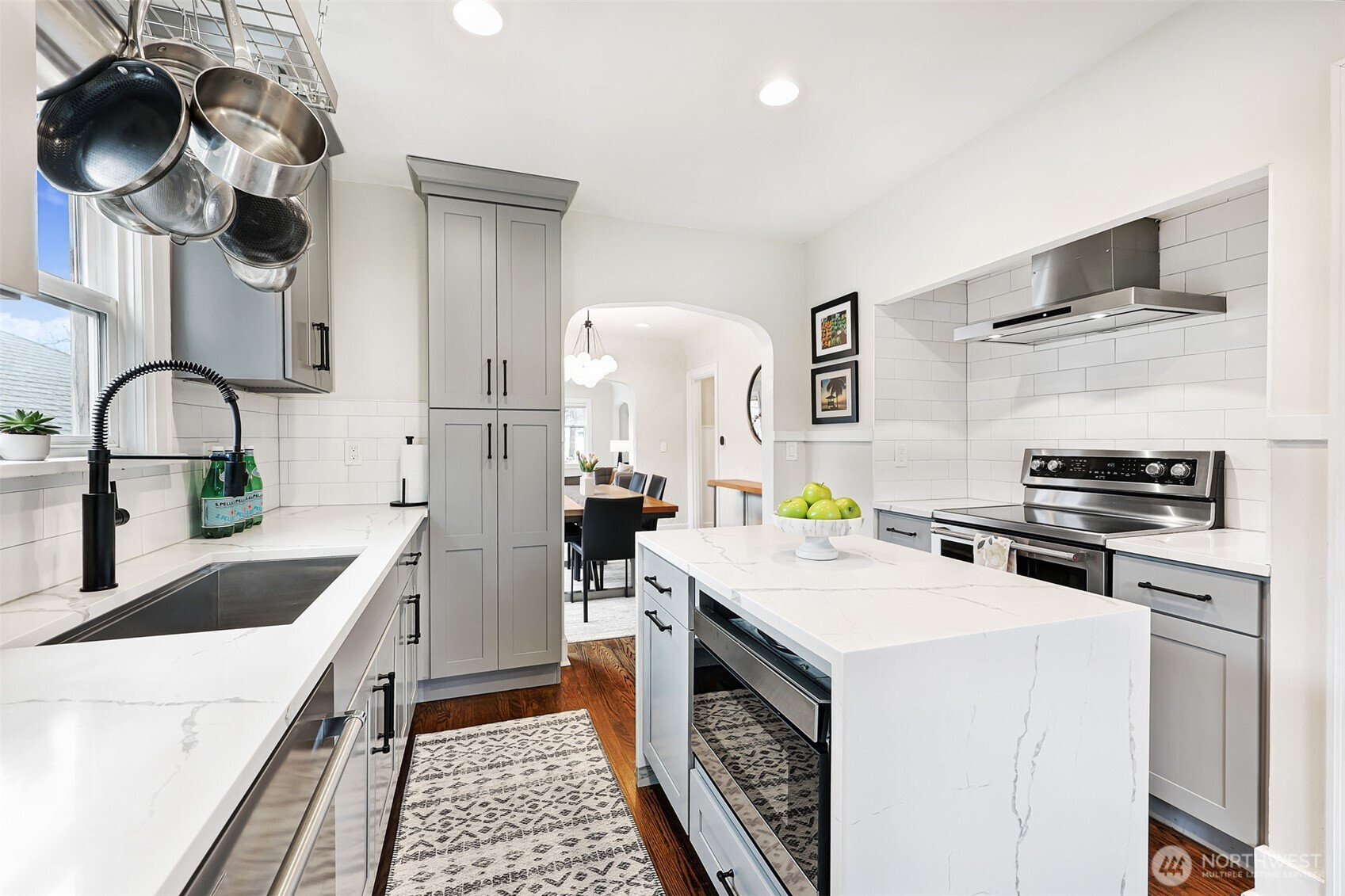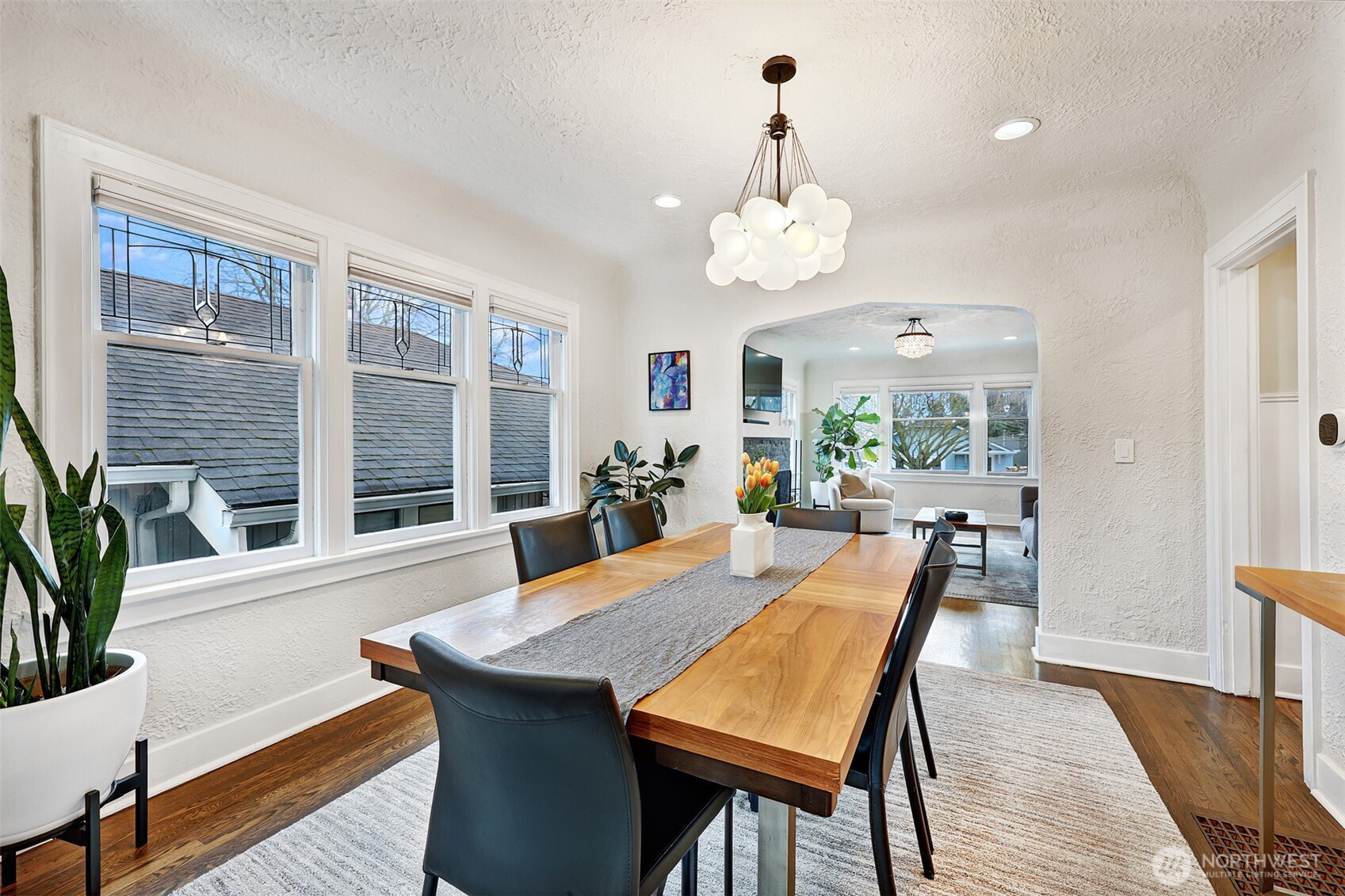 All the right touches in this thoughtfully remodeled Green Lake Craftsman - just move in and enjoy! From the entry foyer with closet to the inviting living room with fireplace, the home feels warm and welcoming. High-quality finishes are seamlessly blended with classic old world architectural details, including archways, cove ceilings, hardwood floors, original leaded glass windows, and built-ins. The remodeled chef’s kitchen features an island, stainless KitchenAid appliances, quartz countertops, and generous cabinet and workspace - all open to a spacious formal dining room. A dreamy second-floor primary suite offers a walk-in closet, maple flooring, and a spacious ensuite bath with double sinks. Main floor bedroom and flexible den offering options for work, study, or additional living space. Bathrooms on every level have been updated. The fully finished lower level includes a bedroom, half bath, built-ins and flex space for office and cozy reading/media/play space. Stay dry on rainy days with lower level access from attached garage with inside "drop zone" for coats and bags. Peaceful, landscaped and fenced backyard includes irrigation and lighting, a flagstone patio, and alley access. Spacious garage with storage room and driveway parking. Updates include: heat pump, air conditioning, new roof and tankless hot water and more. Easy in-city living with a convenient commute and close proximity to shops, restaurants, PCC, RapidRide - and just blocks to Green Lake!