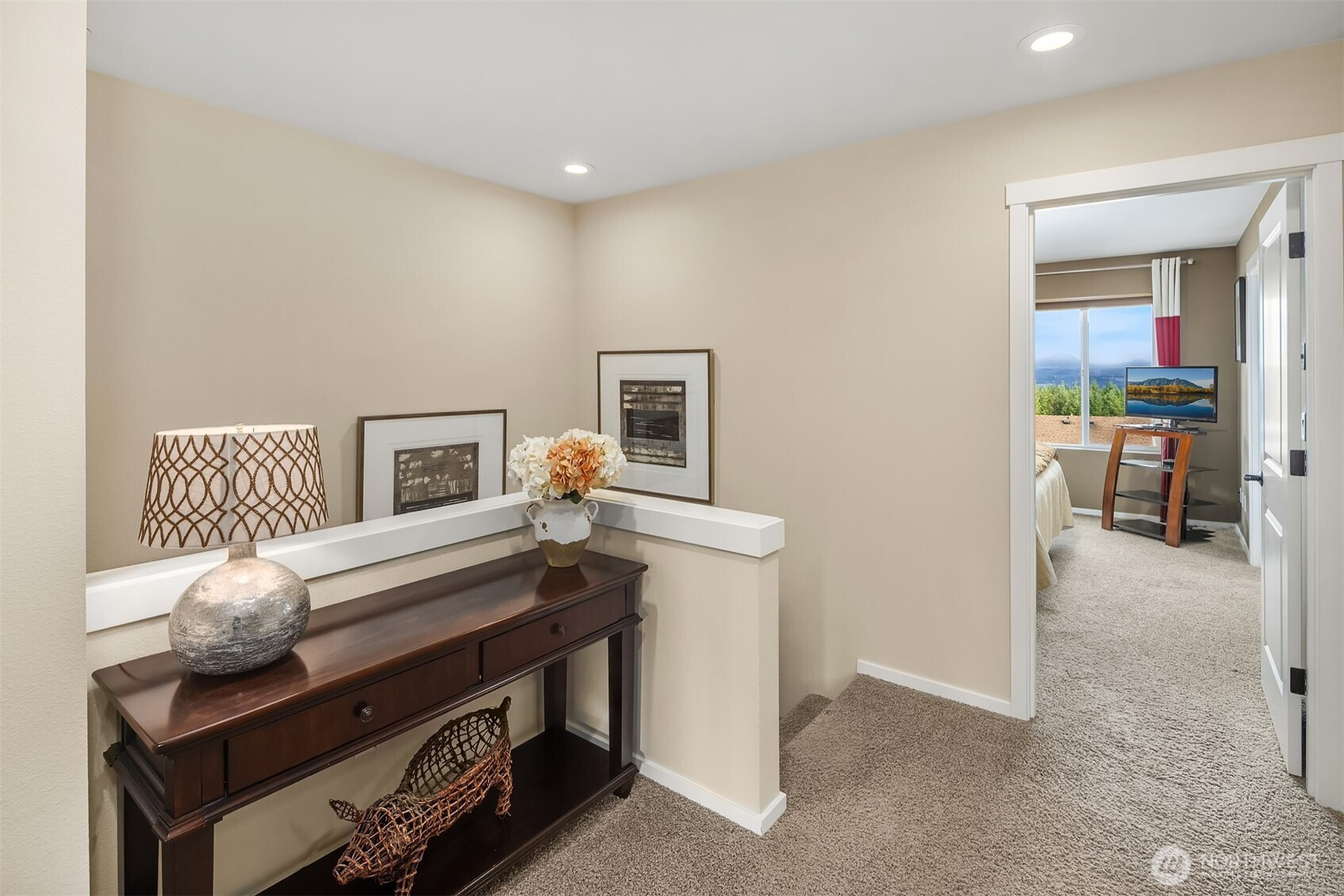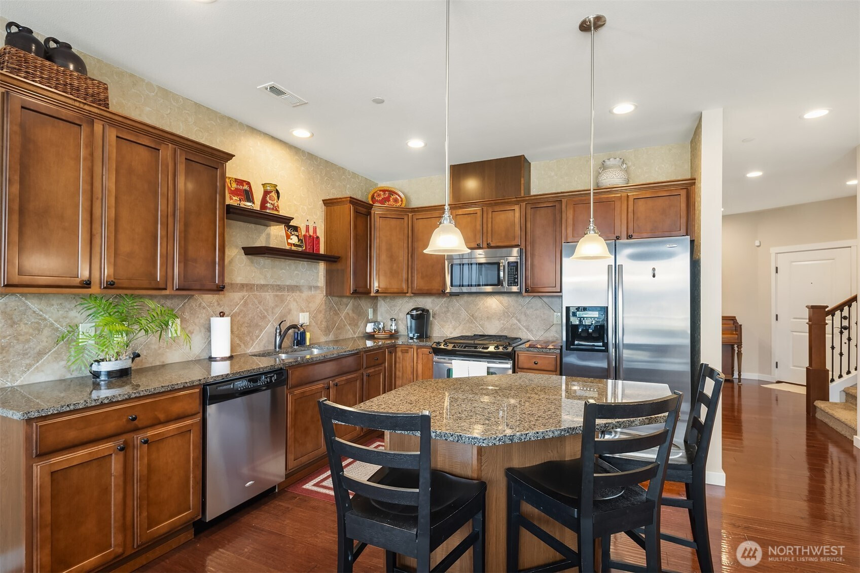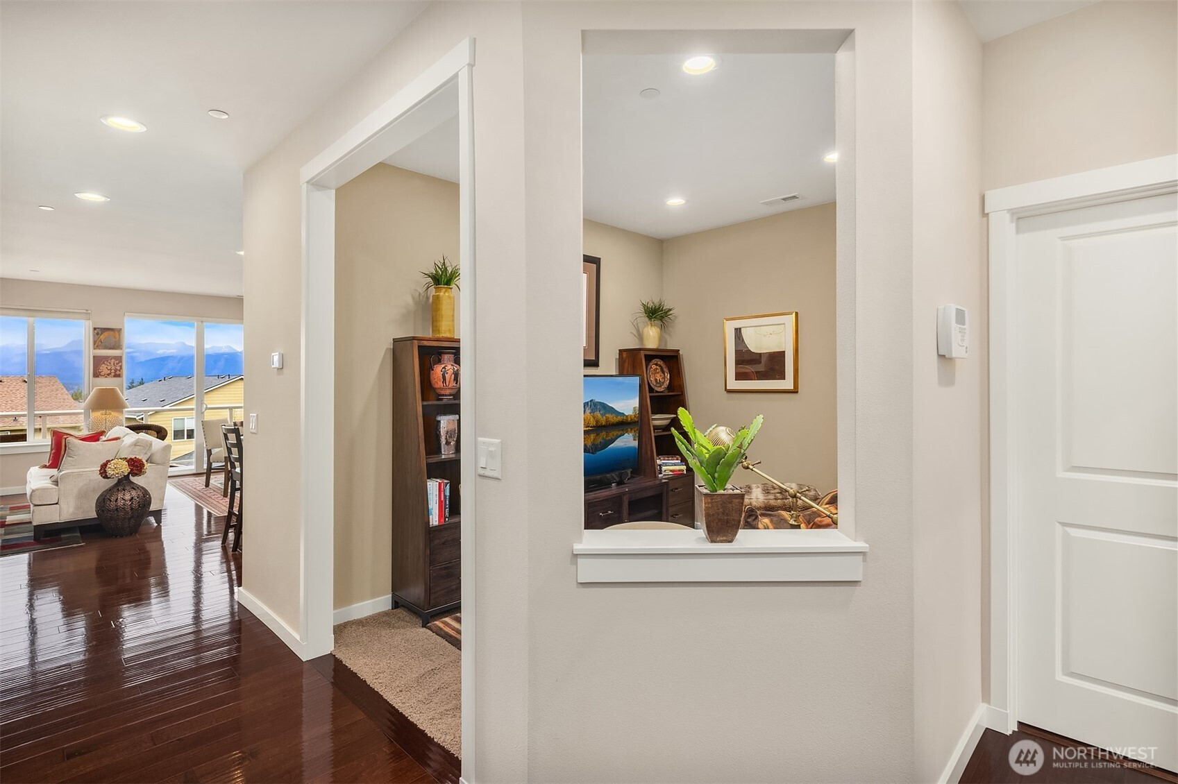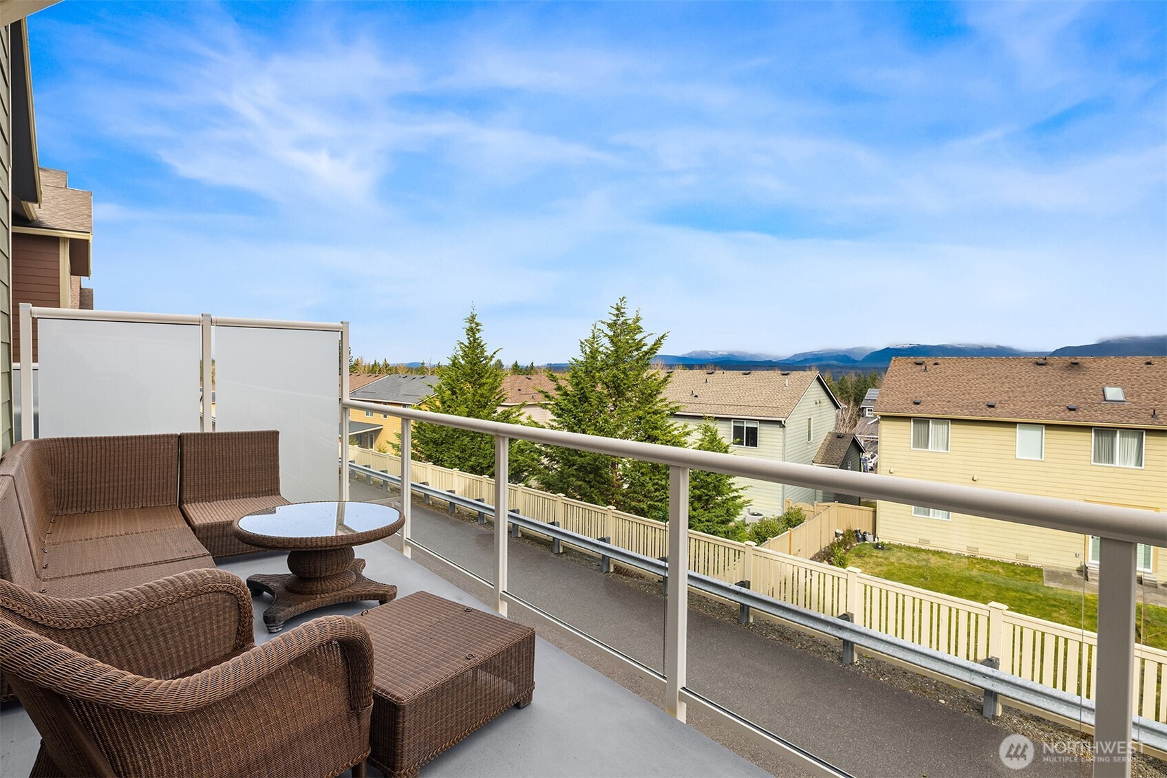 Endless views of Mount Si and the breathtaking Cascade Mountain range create a stunning, daily backdrop for this beautifully maintained 3-bedroom, 2.75-bath home in the highly desirable community of Snoqualmie Ridge. The main floor features perfectly maintained hardwood floors bathed in natural light. An open-concept kitchen, complete with island, pantry, and stainless steel appliances anchors the space, flowing seamlessly into the dining area and inviting living room with a cozy gas fireplace. A separate den offers the perfect office or reading retreat, while an additional bedroom and full bath provide flexibility for guests or work-from-home needs. Step outside to your expansive private deck that is ideal for entertaining, relaxing, or stargazing under Northwest skies. Upstairs, two spacious ensuite bedrooms each enjoy private bathrooms and walk-in closets. The primary suite is perfectly positioned to capture sweeping views of the Snoqualmie Valley, offering a peaceful retreat with a spa-like bath. A convenient laundry area, desk nook, and extra storage complete the upper level. The lower level includes a two-car garage with additional storage and driveway parking, plus guest parking just outside your front door. With quick access to I-90, shopping, dining, and golf, this home offers the perfect balance of comfort, convenience, and Pacific Northwest beauty.
