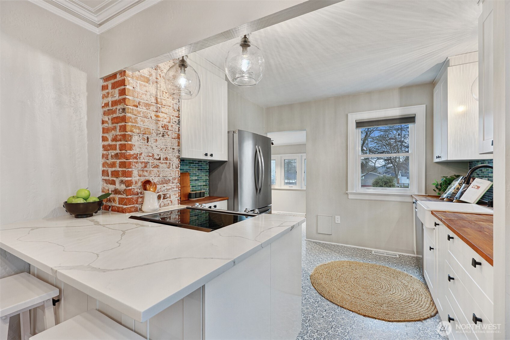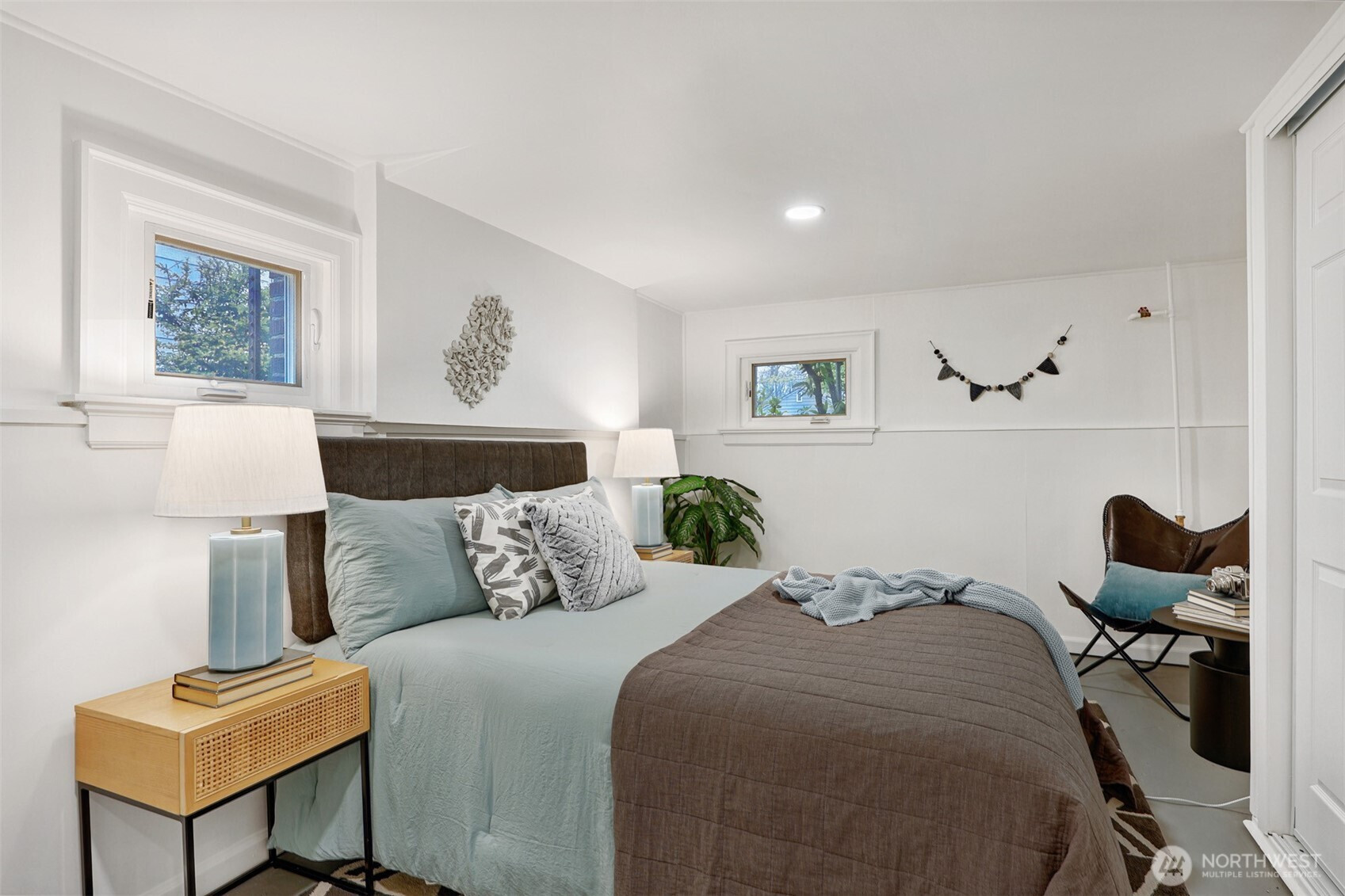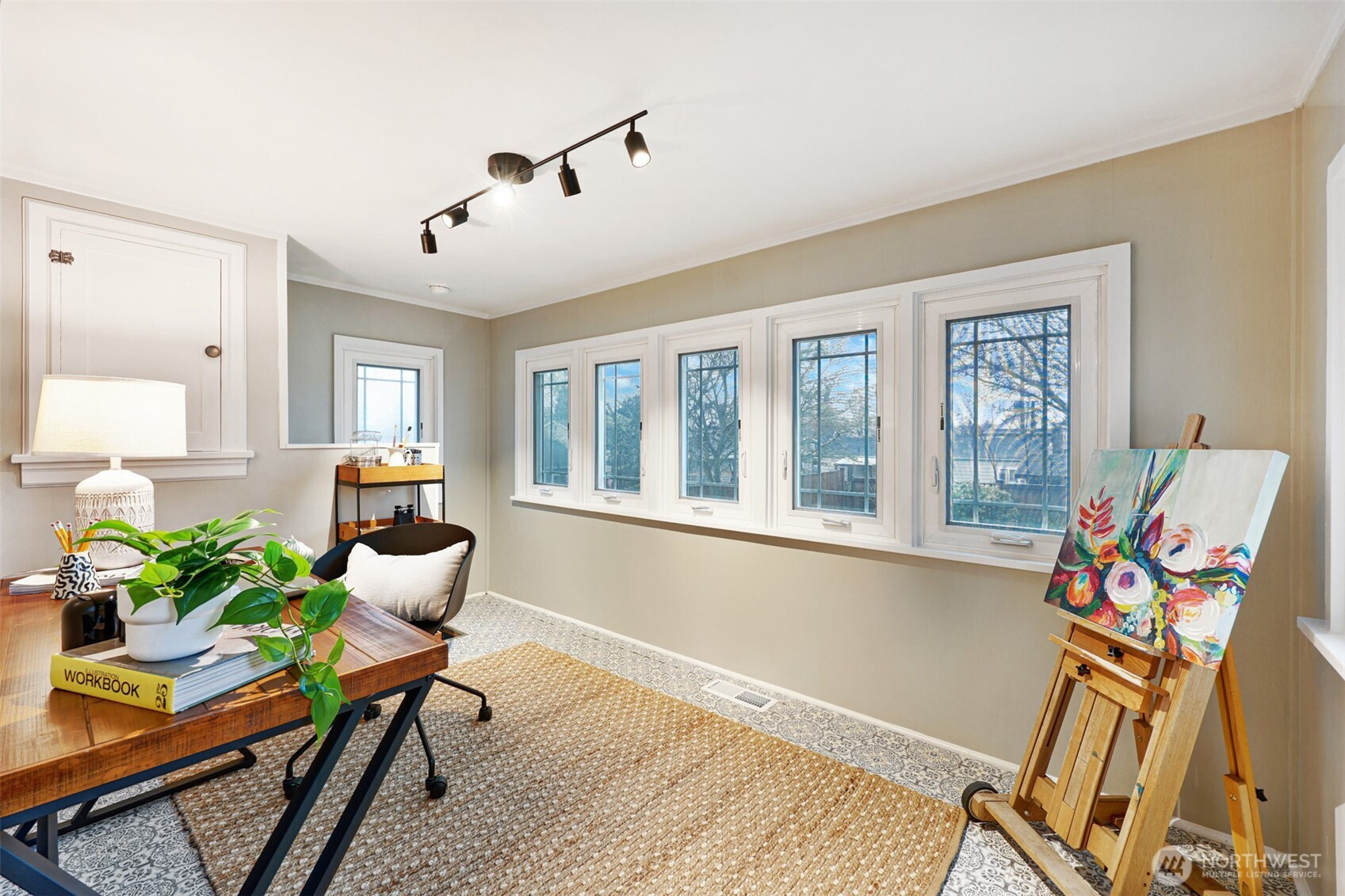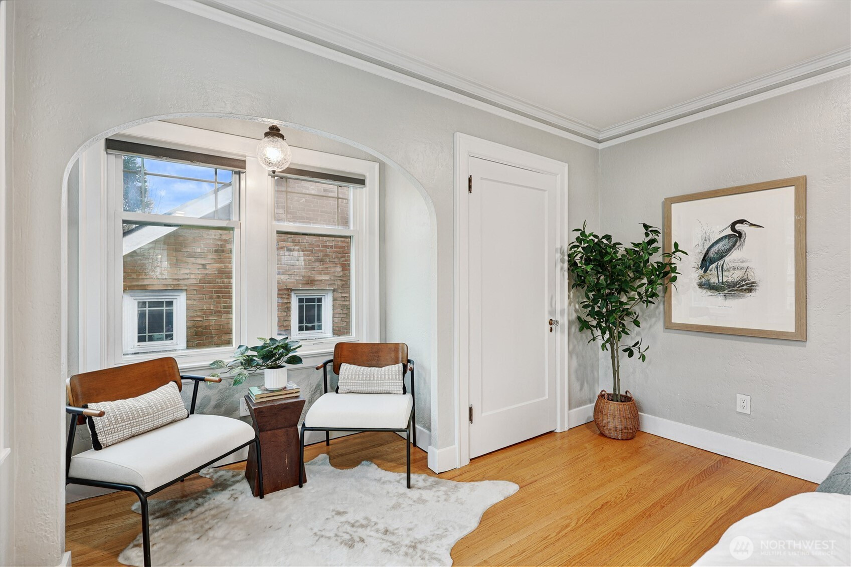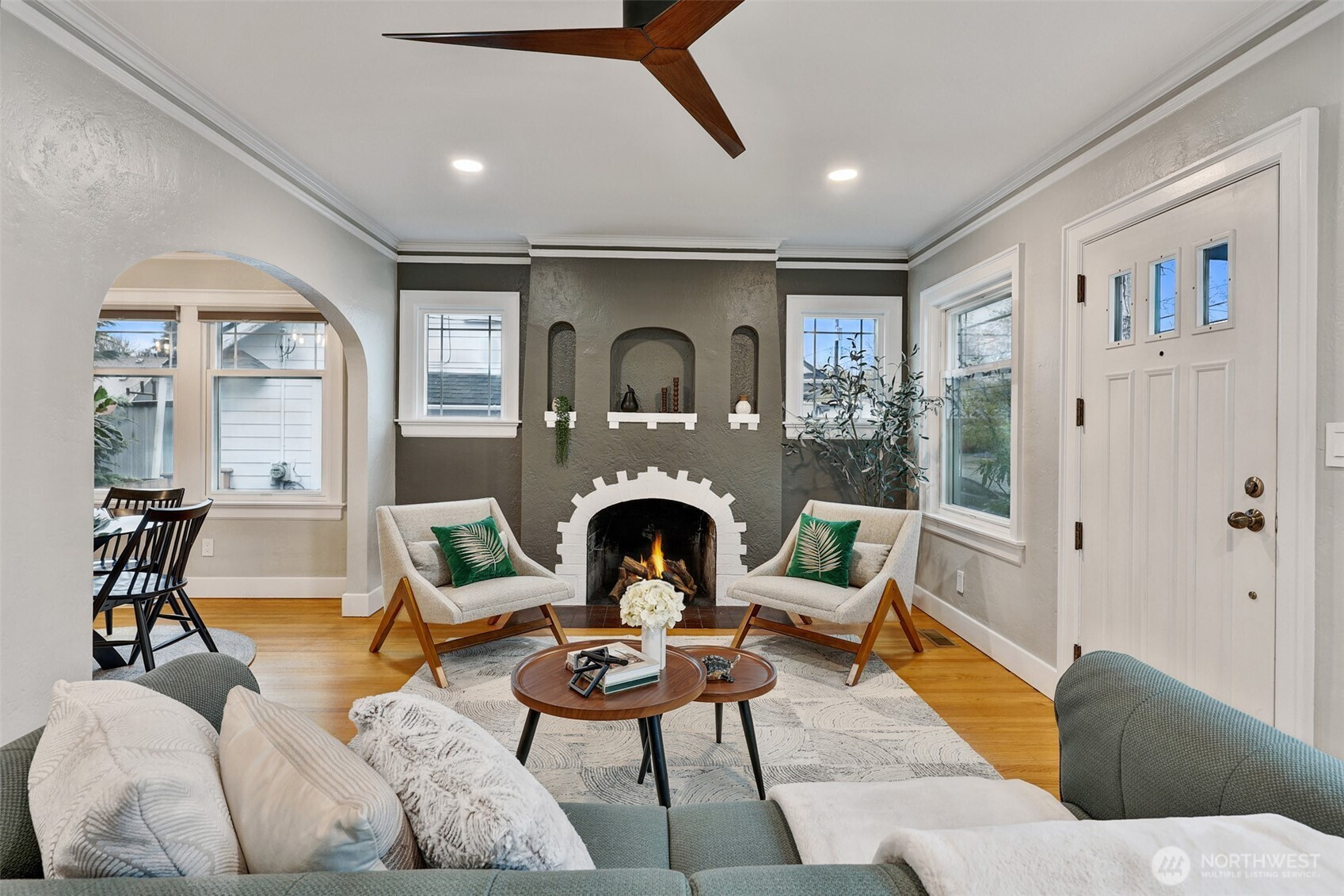 Classic 1928 charm meets impactful modern updates in this beautifully maintained home, set up off the street for added privacy and stately presence. Inside, period details pop—exposed brick, original oak hardwoods, crown moulding & picture rail, and vintage glass doorknobs pair effortlessly with everyday functionality. The welcoming living room features a wood-burning fireplace, large coat closet, and inviting sunlit window-wrapped nook. A dedicated dining room flows into the spacious modern kitchen complete with pull-out storage and soft close cabinetry & stainless appliances. Bar seating and a nearby back door make hosting BBQs this summer a no brainer as the spacious, private, and thoughtfully landscaped west-facing backyard will turn you into a green thumb in no time! One bedroom, full bath and former back porch turned great home office flex space completes the main floor. Downstairs, a 2nd bedroom plus lots of clean, unfinished space ideal for storage or a home gym. This home has been extensively improved to set you up for long-term ease and peace of mind. Major updates include full rewiring, a new electrical panel, 2023 roof & solar panels, modern insulation, fresh interior paint, plus conversion to efficient electric heat with a heat pump for AC. Plenty of driveway parking in addition to an attached garage equipped with EV charging, or hop on bus 107 steps from your front door! A rare blend of character, comfort, and smart investment in a fantastic neighborhood.