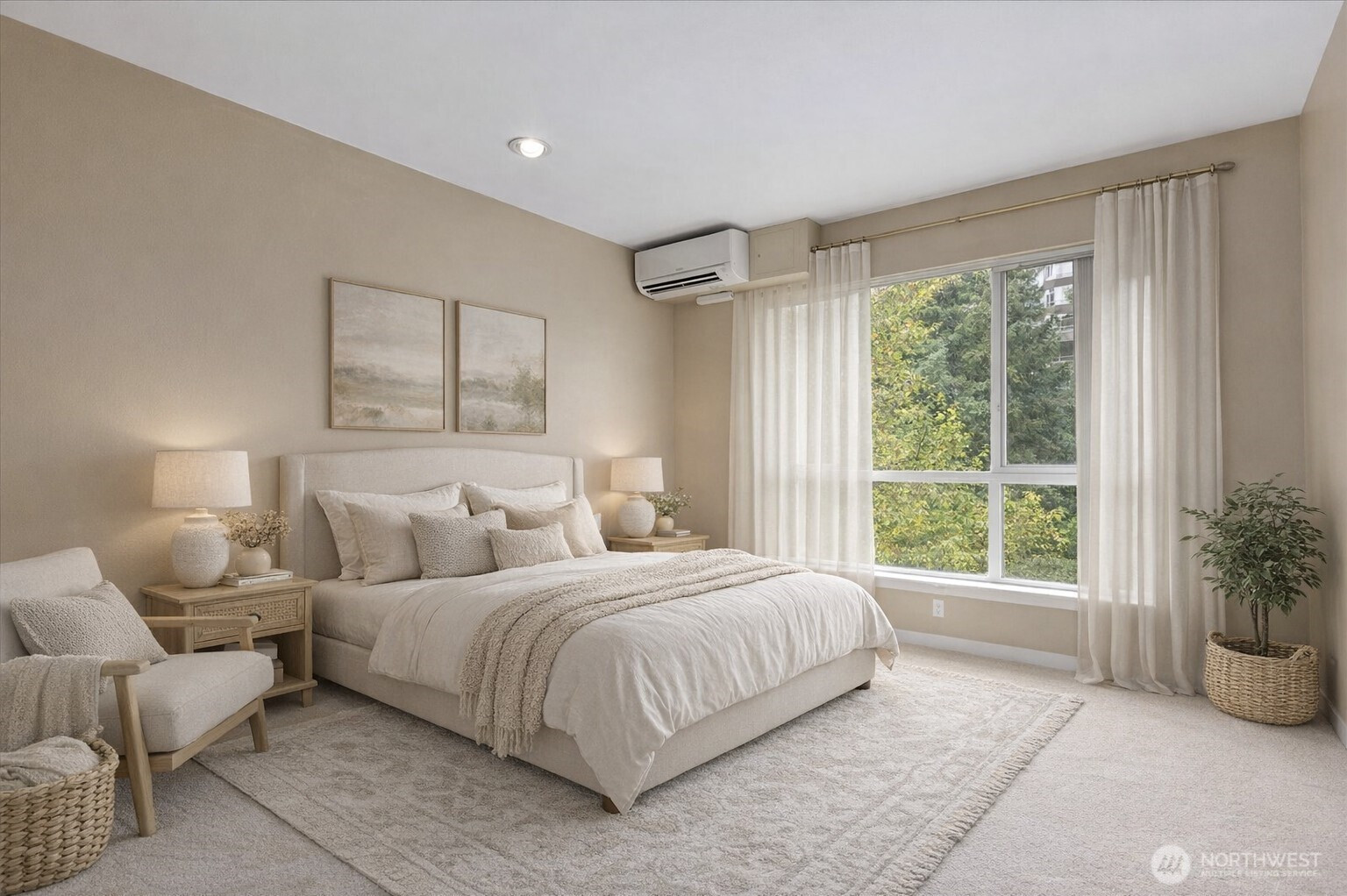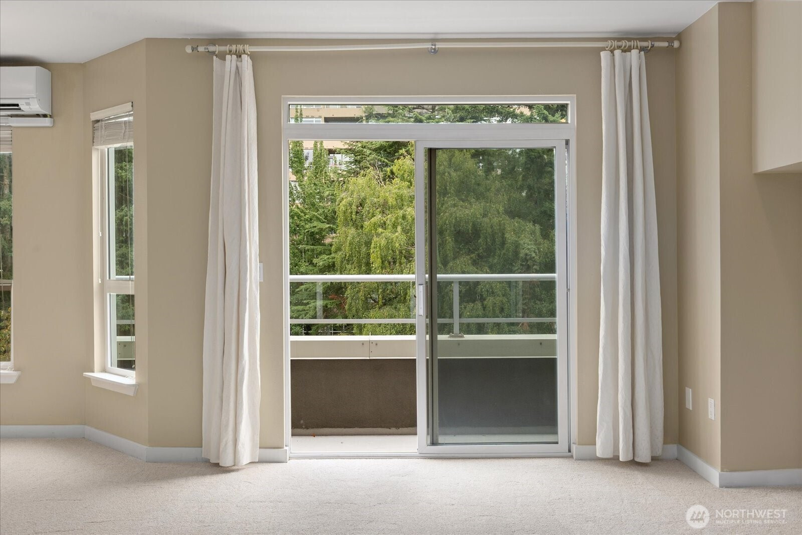 Experience elevated penthouse living at The Metropolitan in the heart of downtown Bellevue. Filled with natural light, this residence showcases 9-ft ceilings, skylights, and a west-facing deck overlooking a serene, treed outlook with stunning sunset views. The chef-inspired kitchen features granite counters, premium stainless steel appliances, and abundant cabinetry that flows effortlessly into open-concept living and dining spaces designed for both relaxing and entertaining. The living room is warm and inviting with a cozy gas fireplace, plush new carpeting, and new A/C for year-round comfort. Retreat to the spacious bedroom with a generously sized walk-in closet. Enjoy a secure, well-maintained building with elevator access, garage parking, storage, no rental cap, and no special assessments. Rarely do you find a combination of top-floor privacy, quiet surroundings, lush greenery, and city views in the heart of downtown. Just steps to premier dining, shopping, parks, and Bellevue Square—this is the best of downtown living.