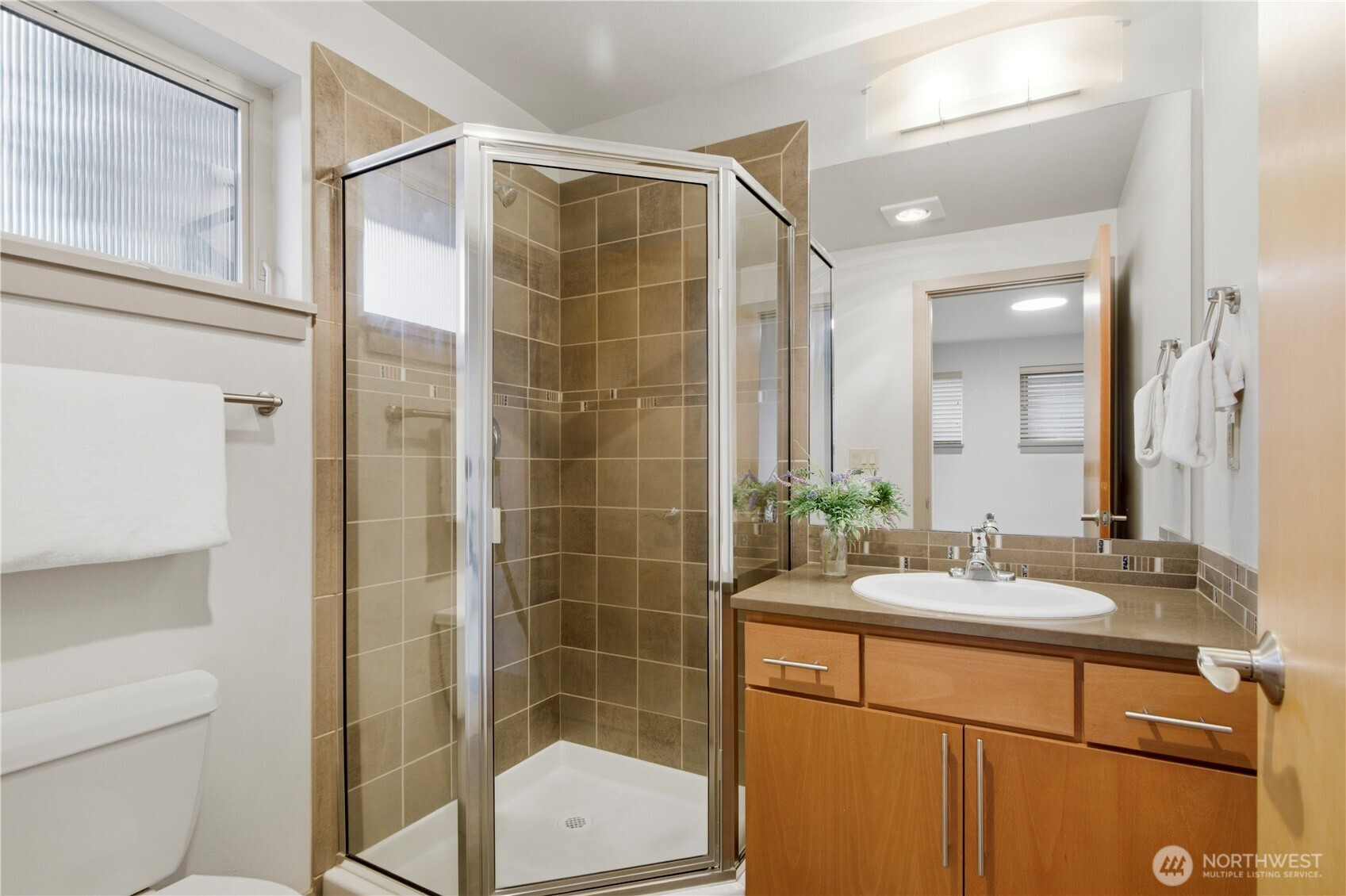 Welcome to this modern duplex-style townhome in Green Lake neighborhood, where sleek design meets effortless urban living. The well-designed floor plan features open-concept living, a functional kitchen with SS appliances, quartz countertop and gas range, opening to dining and living room. The south-facing living room is bright and inviting, opening to a deck for seamless indoor-outdoor living. The entire top floor is beautifully vaulted, the master suite has amazing views of Mt. Rainier and Green Lake. All three bedrooms feature their own bathroom, including a lower-level suite that offers ideal flexibility for guests, work-from-home, or multigenerational living. Enjoy your fully fenced generously sized backyard, as well as a garage and tankless water heater. Convenient location, with easy access to Hwy 99, I-5, and nearby neighborhoods of Greenwood, Phinney Ridge, and Green Lake. Enjoy the close proximity to many great local shops, restaurants, cafes, parks, and more nearby. A perfect blend of comfort and city living in a vibrant neighborhood.