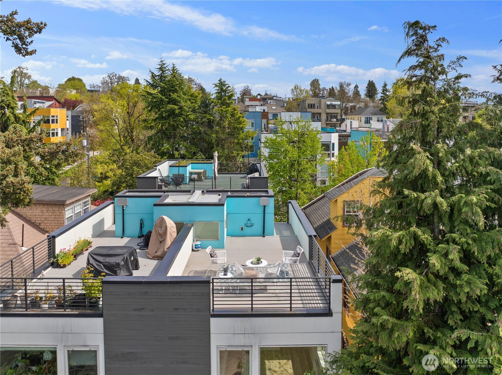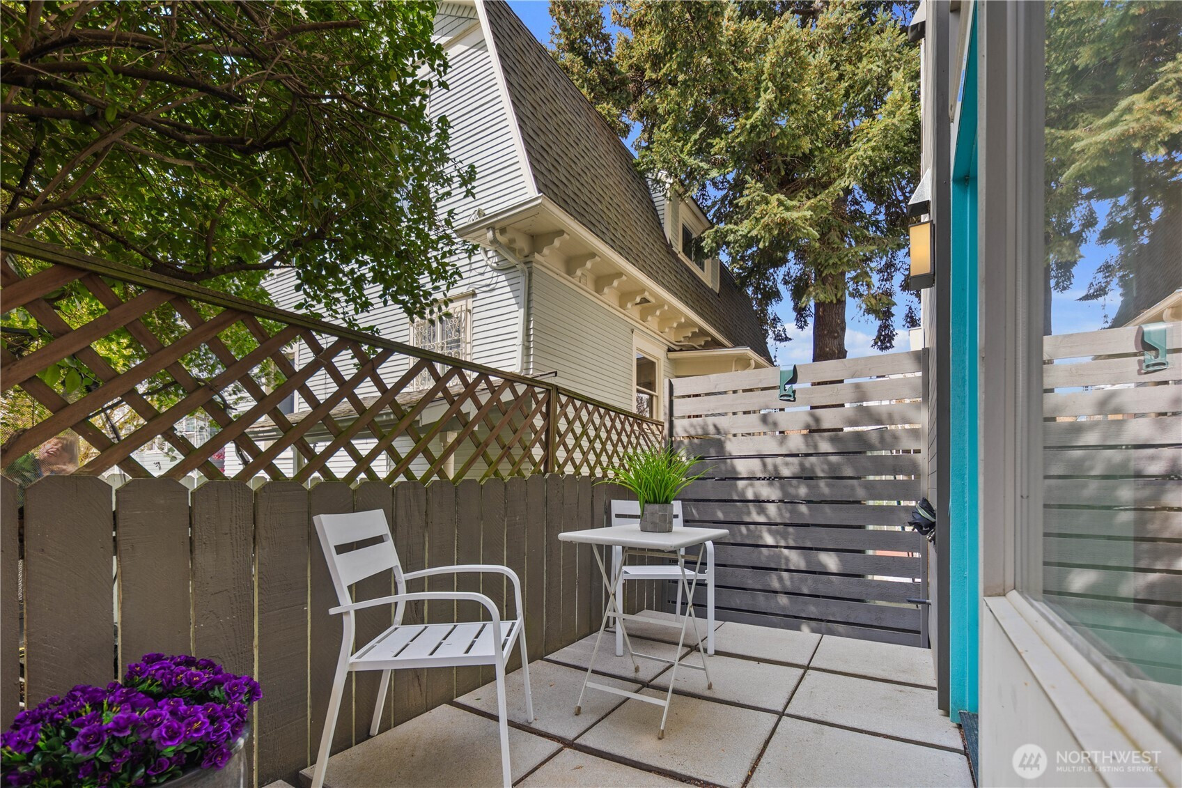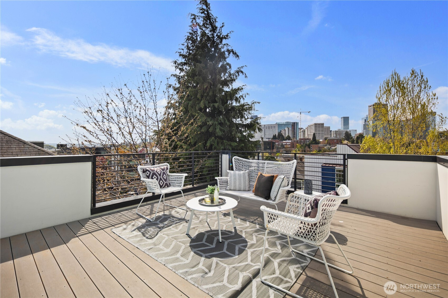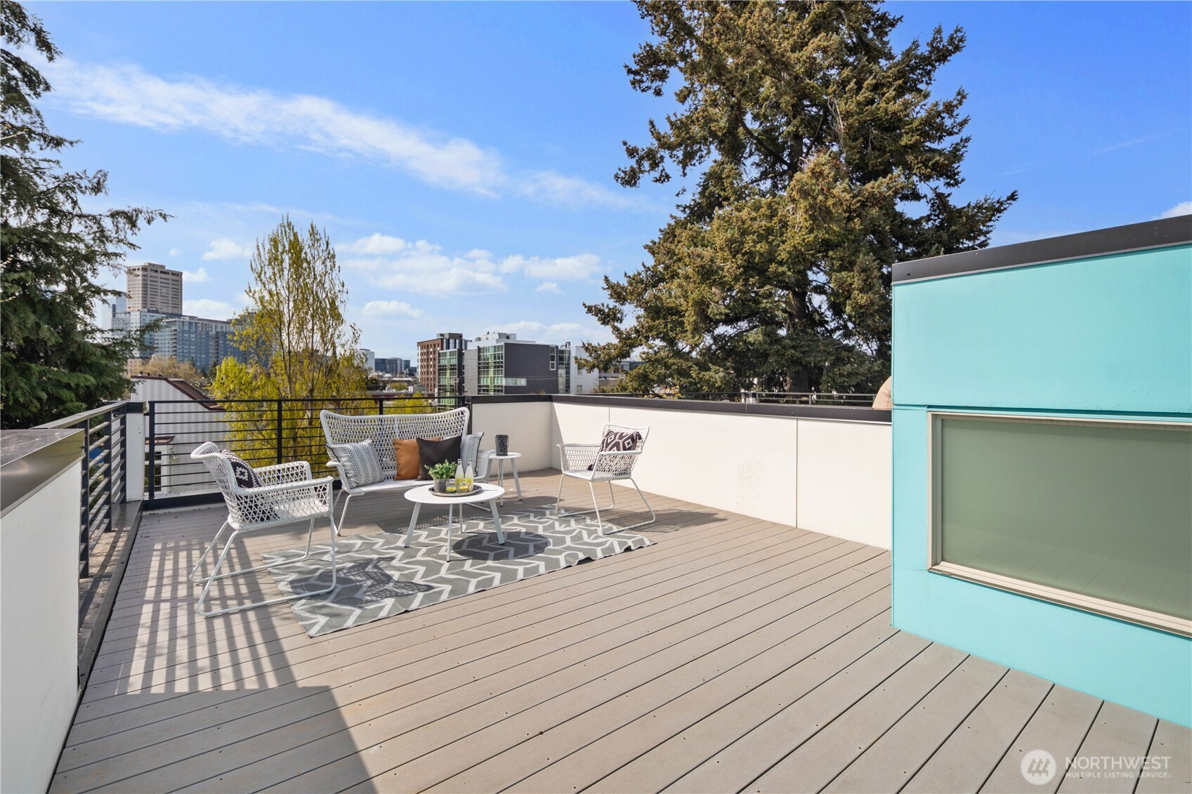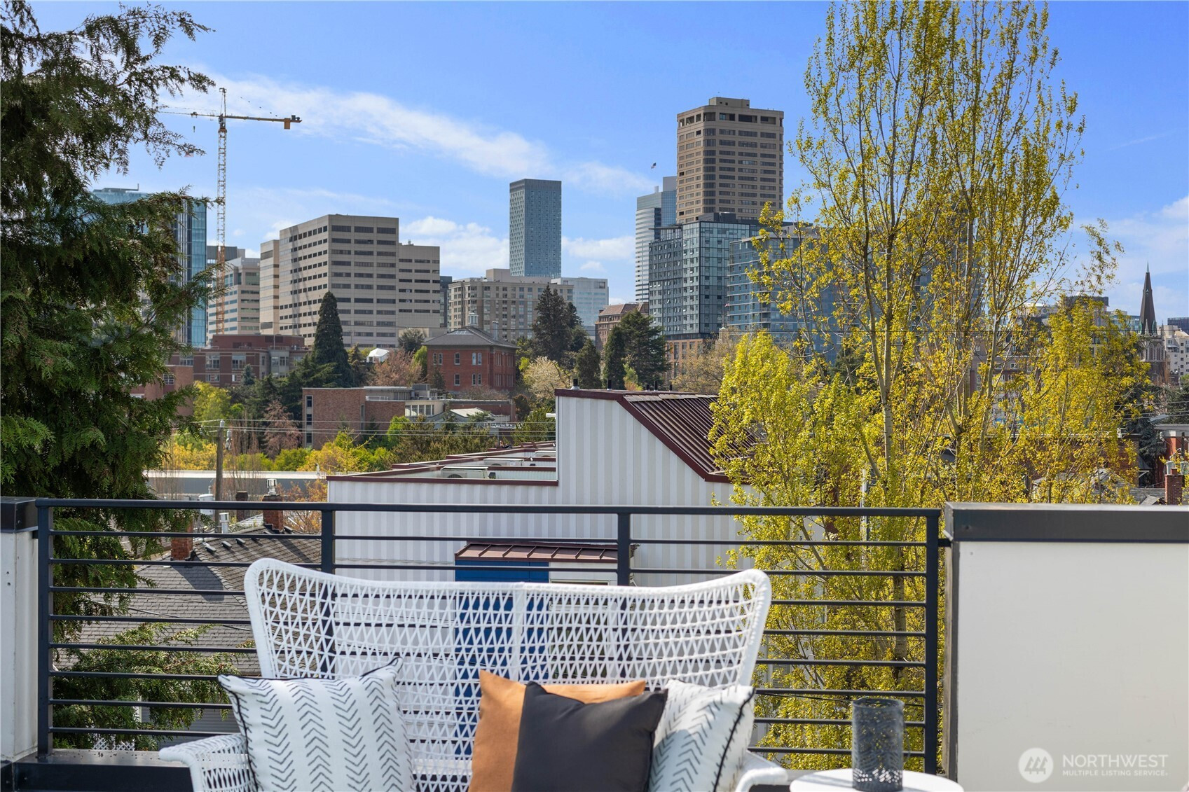 Tucked within a quiet courtyard, this thoughtfully designed 2-bedroom townhome offers a rare blend of peaceful privacy and exceptional urban access. Just moments from Seattle University and nearby restaurants, coffee shops, and boutiques, it delivers a true walkable city lifestyle with a Walk Score of 96. Built to exceed 4-Star Built Green standards, the home features a modern aesthetic with clean lines, open-concept living, and fresh interior/exterior paint for a move-in-ready finish. Expansive windows fill the space with natural light, creating a bright and welcoming atmosphere throughout. The flexible layout includes a bedroom and bathroom on each level, ideal for guests, roommates, or a dedicated home office. Comfort and efficiency are prioritized with radiant hydronic heating, HRV system, and upgraded insulation for year-round climate control and reduced energy use. The main level flows to a private patio off the kitchen—perfect for morning coffee or outdoor dining—while the rooftop deck offers city views and an inviting space for relaxing or entertaining. The primary suite provides a quiet retreat with a walk-in closet and well-appointed bath featuring a walk-in shower. Additional highlights include off-street parking, no HOA, and short-term rental potential, offering flexibility for both homeowners and investors. Pre-inspected for peace of mind, this low-maintenance home presents a rare opportunity in the heart of Seattle.
