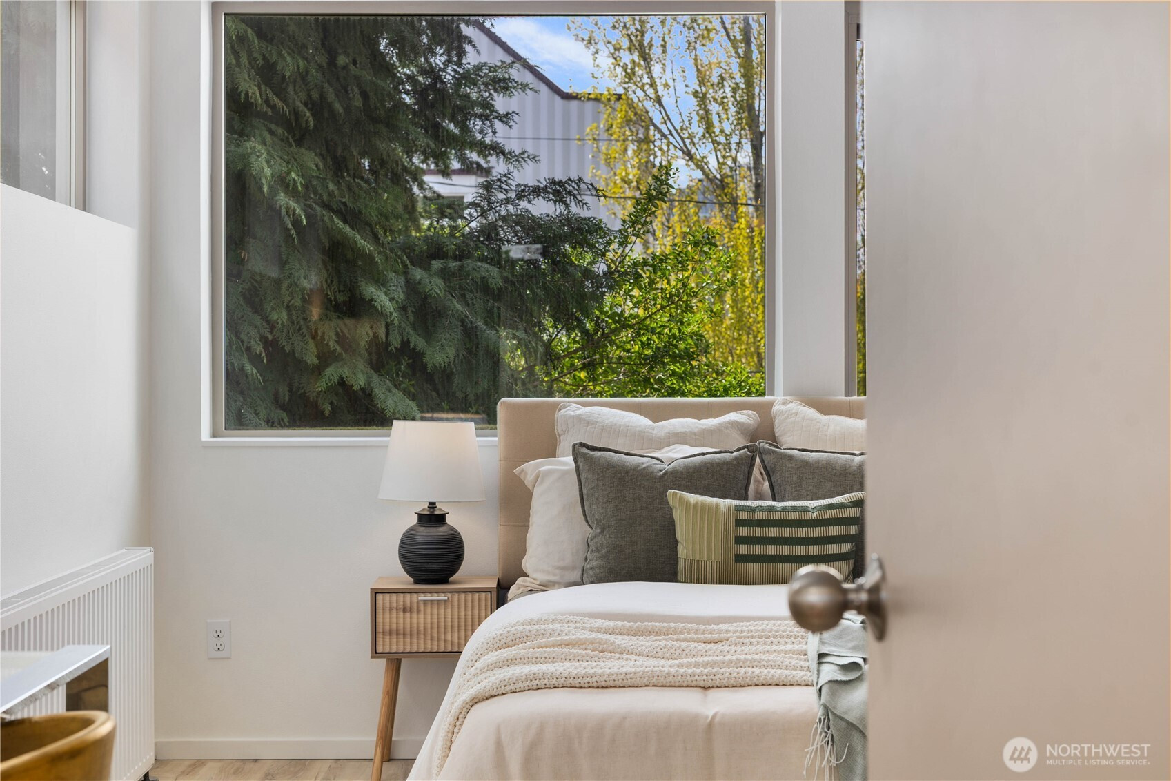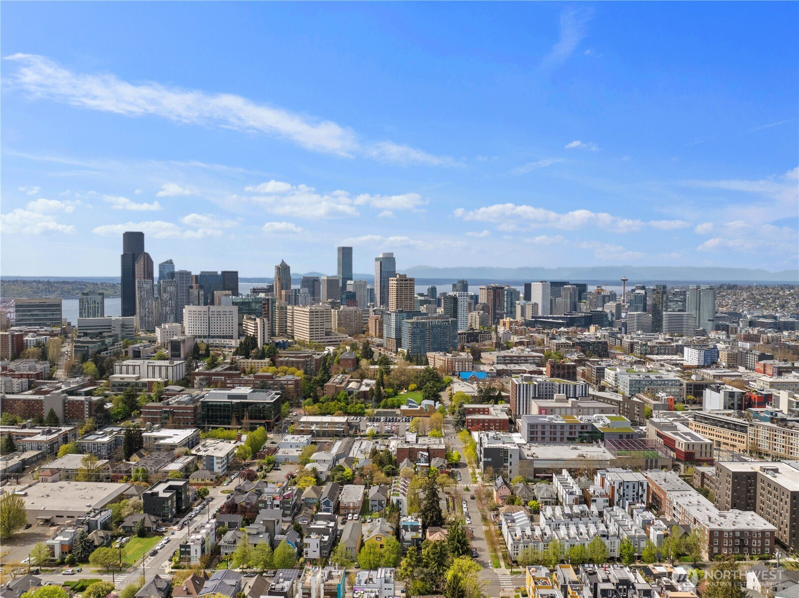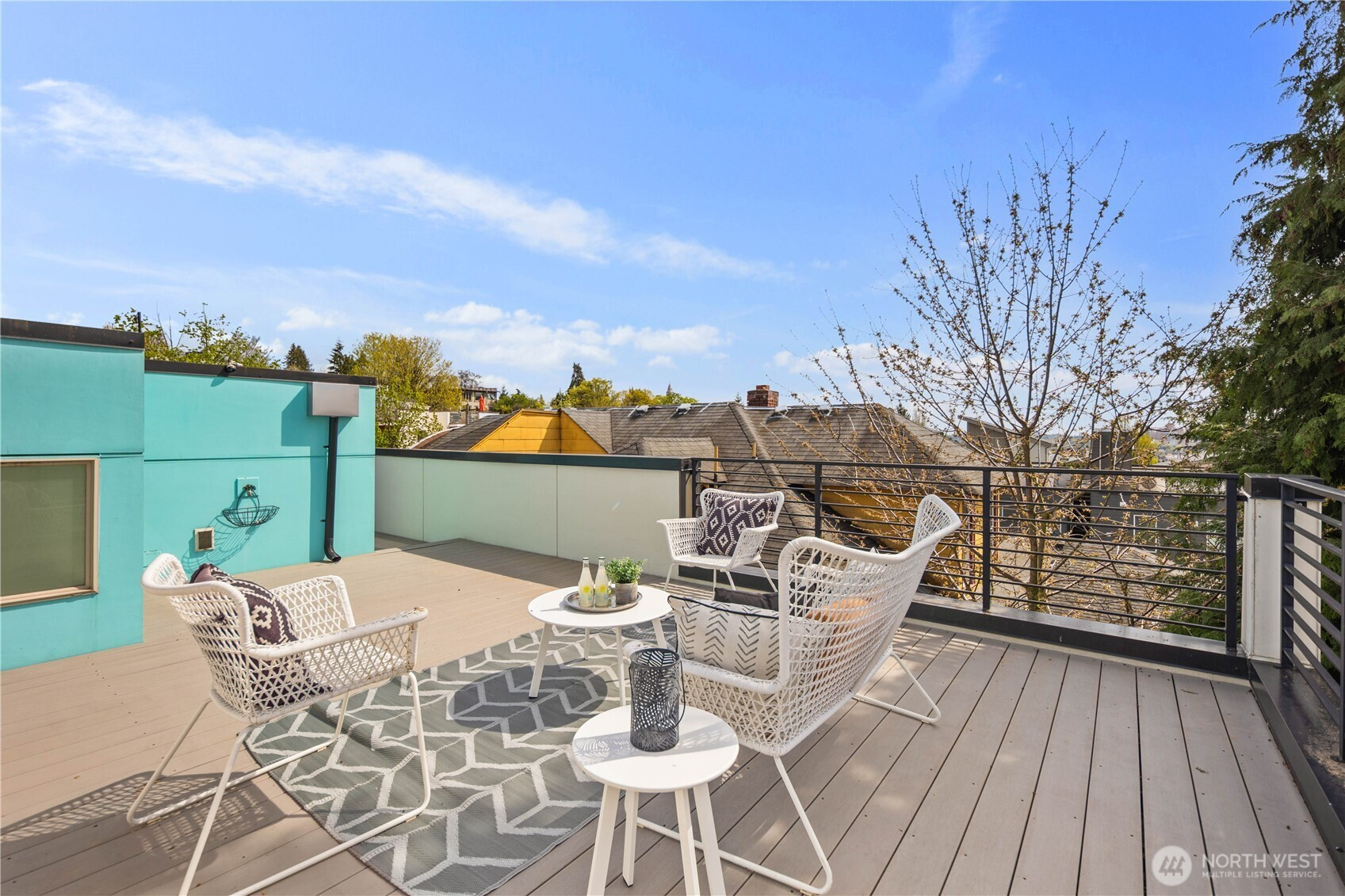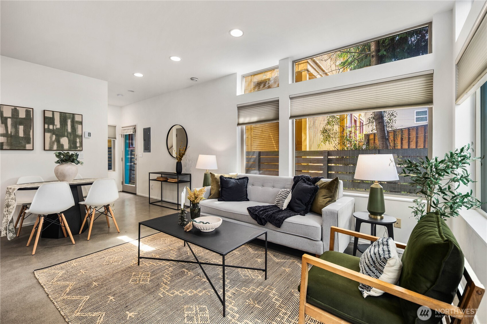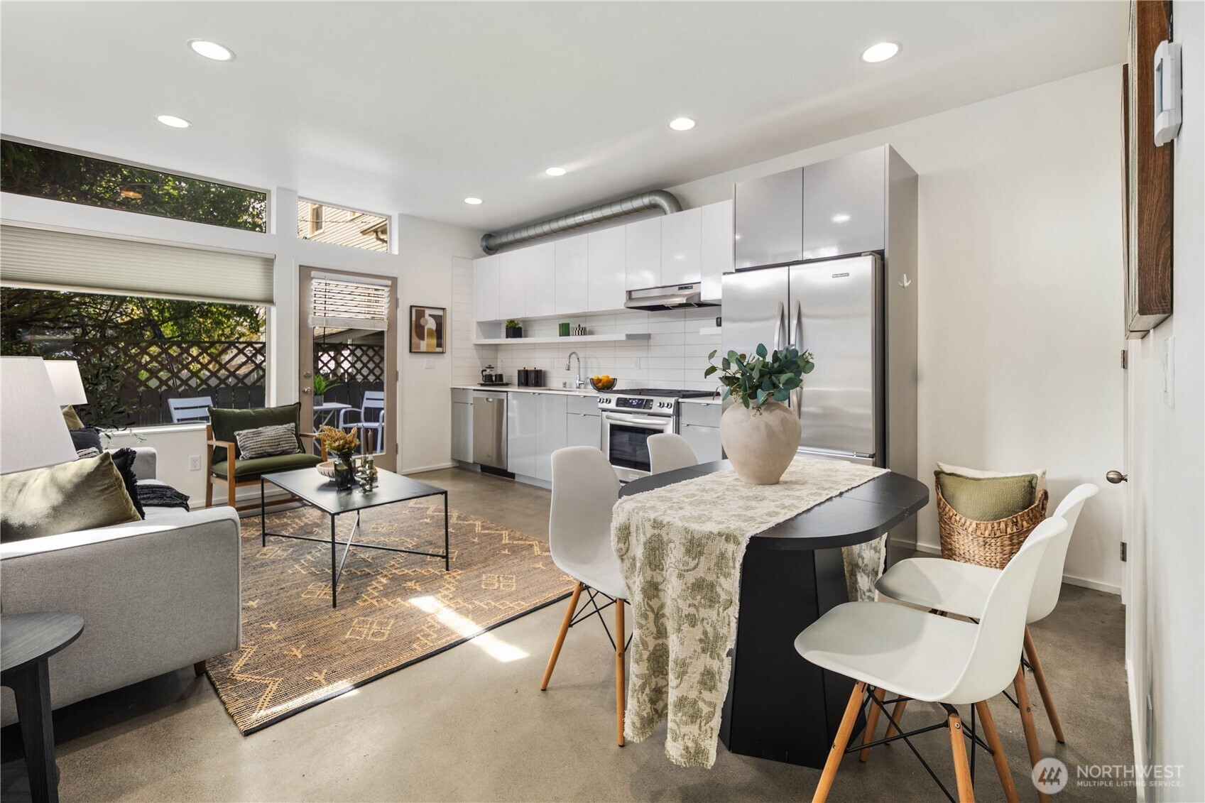 Tucked within a quiet courtyard, this thoughtfully designed 2-bedroom townhome offers a rare blend of peaceful privacy and exceptional urban access. Just moments from Seattle University and nearby restaurants, coffee shops, and boutiques, it delivers a true walkable city lifestyle with a Walk Score of 96. Built to exceed 4-Star Built Green standards, the home features a modern aesthetic with clean lines, open-concept living, and fresh interior/exterior paint for a move-in-ready finish. Expansive windows fill the space with natural light, creating a bright and welcoming atmosphere throughout. The flexible layout includes a bedroom and bathroom on each level, ideal for guests, roommates, or a dedicated home office. Comfort and efficiency are prioritized with radiant hydronic heating, HRV system, and upgraded insulation for year-round climate control and reduced energy use. The main level flows to a private patio off the kitchen—perfect for morning coffee or outdoor dining—while the rooftop deck offers city views and an inviting space for relaxing or entertaining. The primary suite provides a quiet retreat with a walk-in closet and well-appointed bath featuring a walk-in shower. Additional highlights include off-street parking, no HOA, and short-term rental potential, offering flexibility for both homeowners and investors. Pre-inspected for peace of mind, this low-maintenance home presents a rare opportunity in the heart of Seattle.