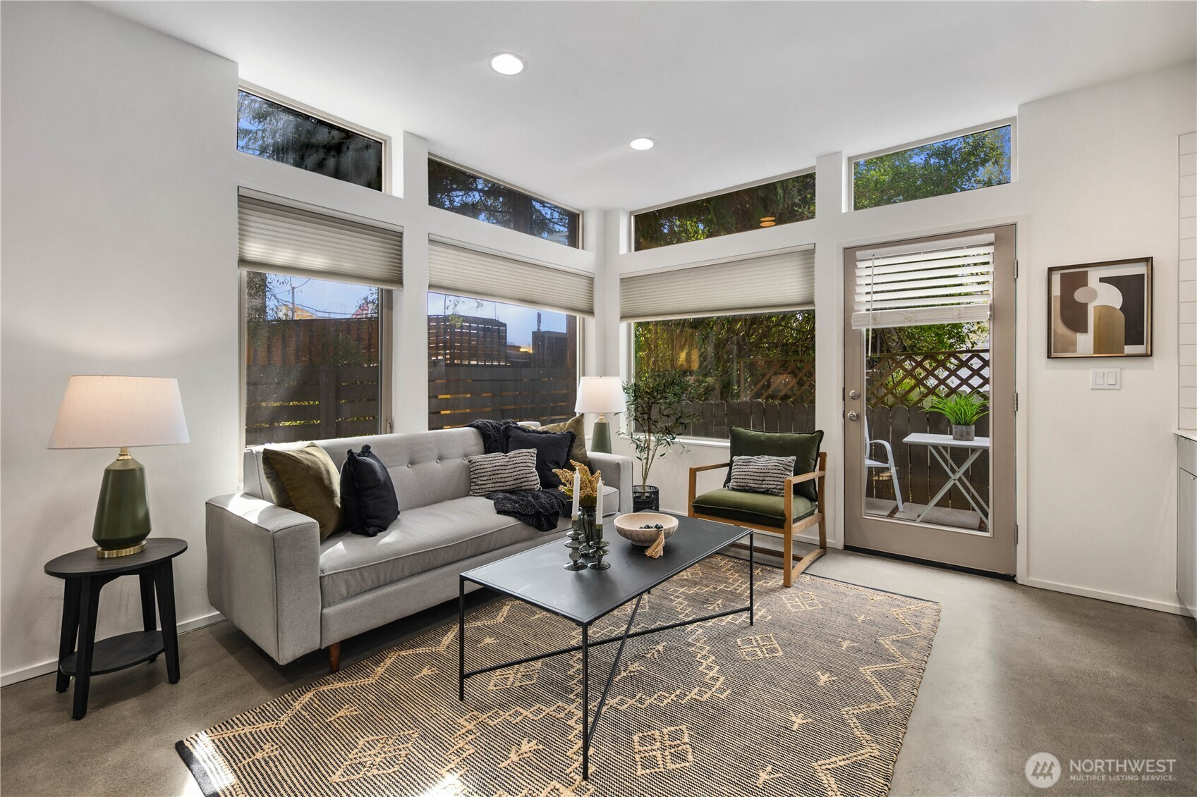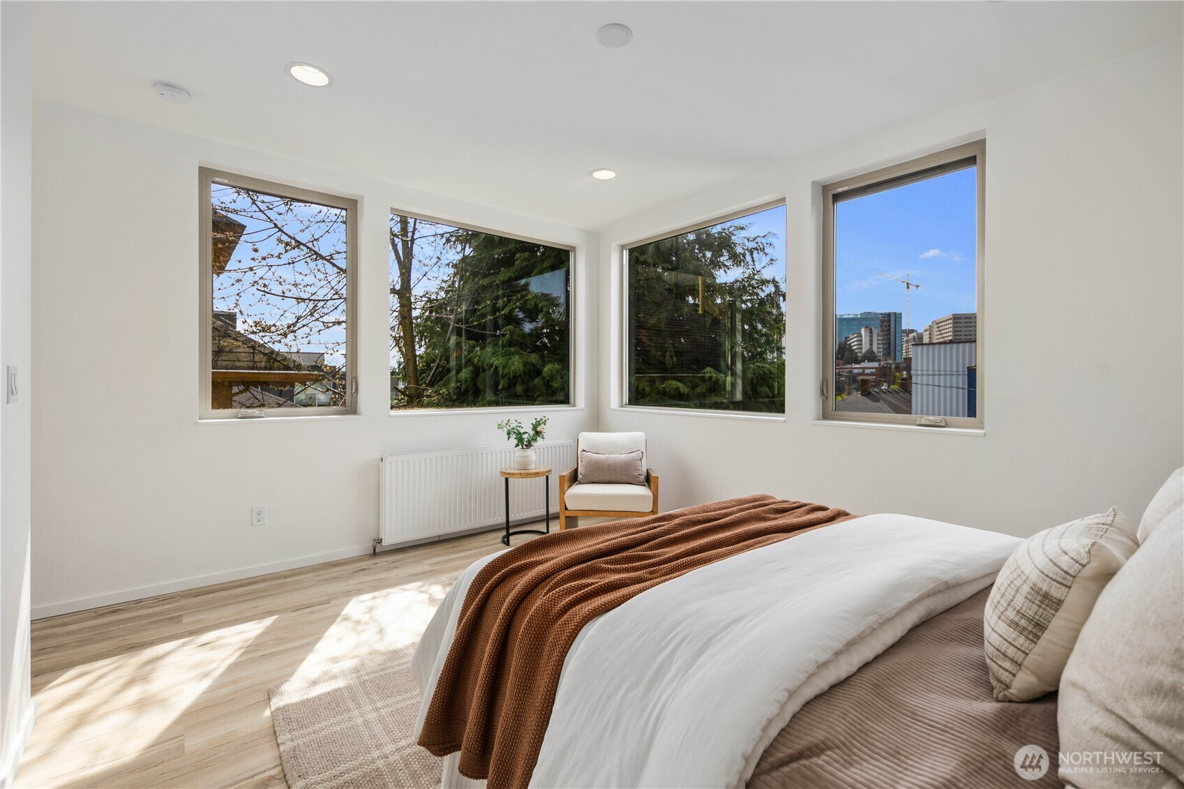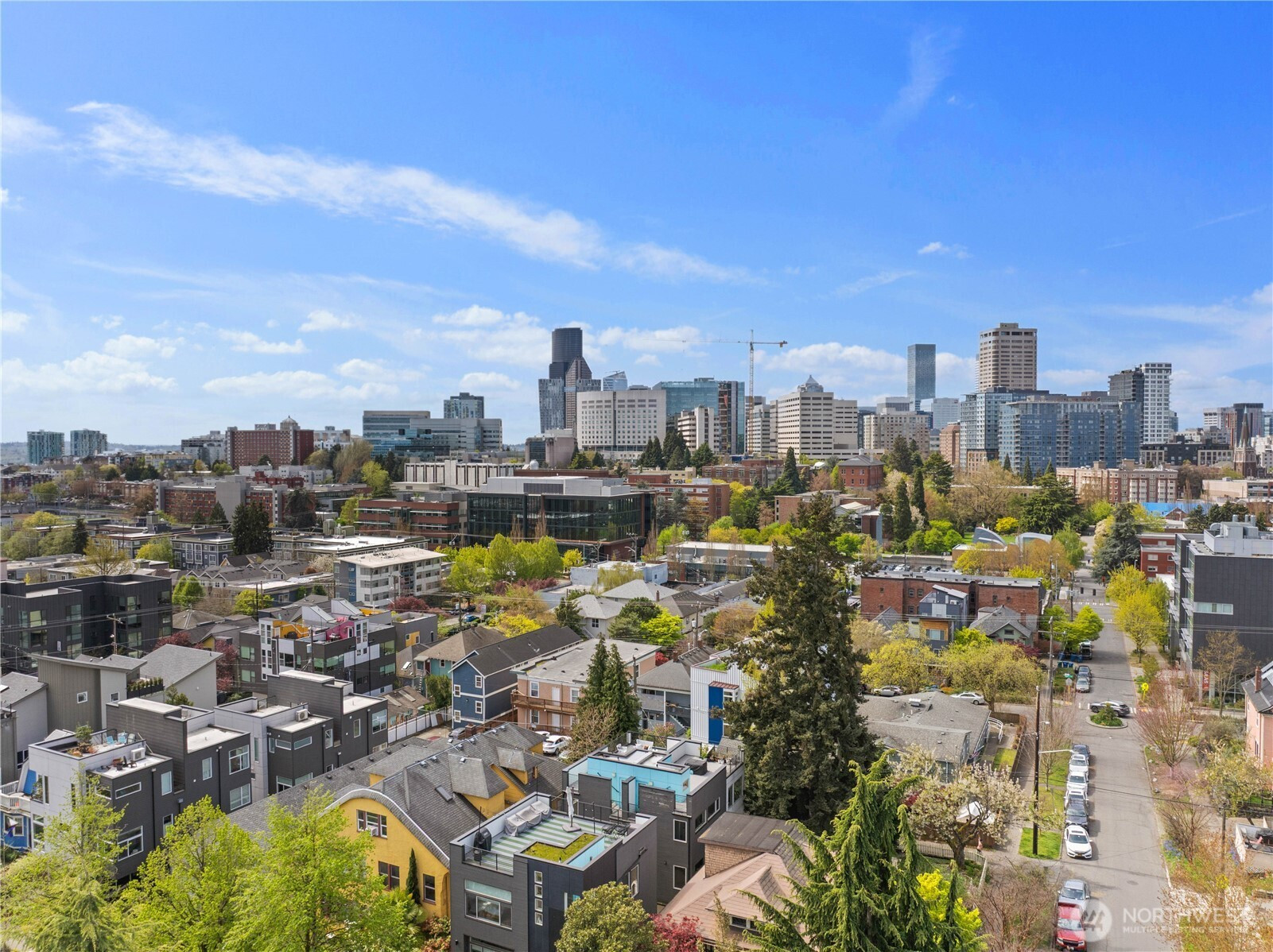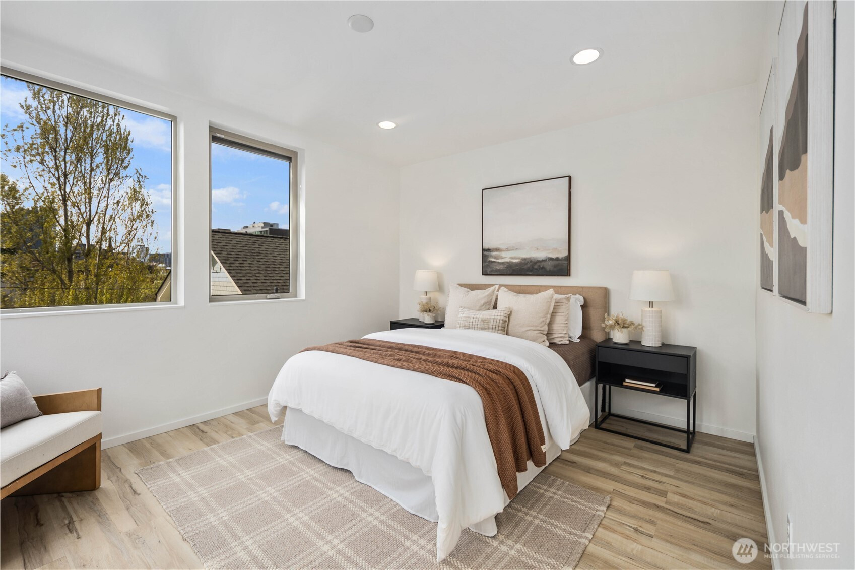 Tucked within a quiet courtyard, this thoughtfully designed 2-bedroom townhome offers a rare blend of peaceful privacy and exceptional urban access. Just moments from Seattle University and nearby restaurants, coffee shops, and boutiques, it delivers a true walkable city lifestyle with a Walk Score of 96. Built to exceed 4-Star Built Green standards, the home features a modern aesthetic with clean lines, open-concept living, and fresh interior/exterior paint for a move-in-ready finish. Expansive windows fill the space with natural light, creating a bright and welcoming atmosphere throughout. The flexible layout includes a bedroom and bathroom on each level, ideal for guests, roommates, or a dedicated home office. Comfort and efficiency are prioritized with radiant hydronic heating, HRV system, and upgraded insulation for year-round climate control and reduced energy use. The main level flows to a private patio off the kitchen—perfect for morning coffee or outdoor dining—while the rooftop deck offers city views and an inviting space for relaxing or entertaining. The primary suite provides a quiet retreat with a walk-in closet and well-appointed bath featuring a walk-in shower. Additional highlights include off-street parking, no HOA, and short-term rental potential, offering flexibility for both homeowners and investors. Pre-inspected for peace of mind, this low-maintenance home presents a rare opportunity in the heart of Seattle.