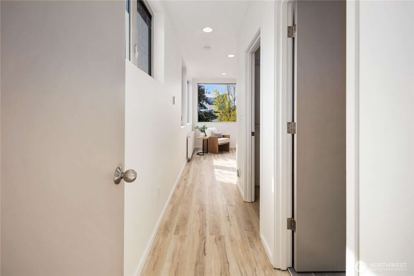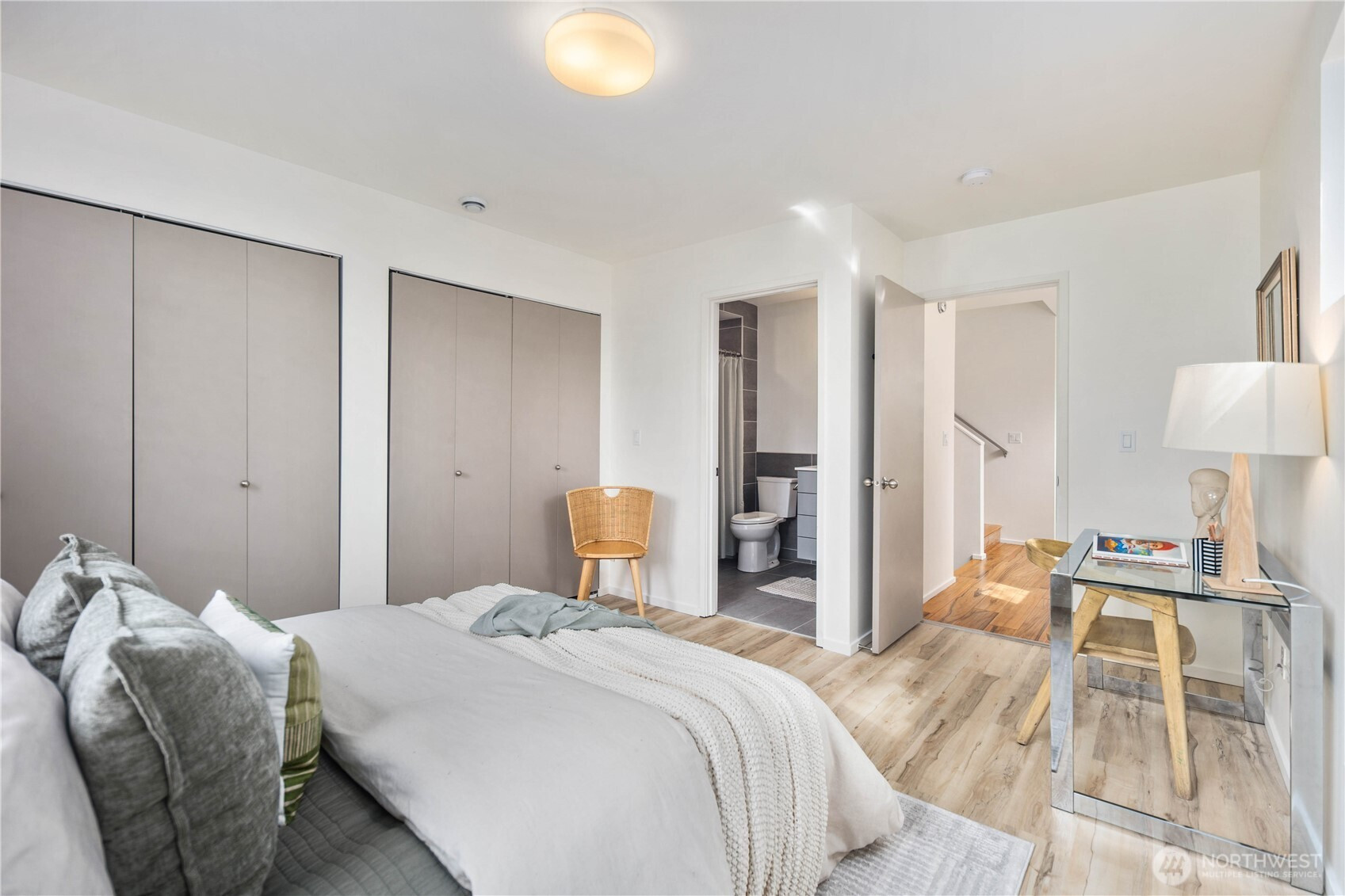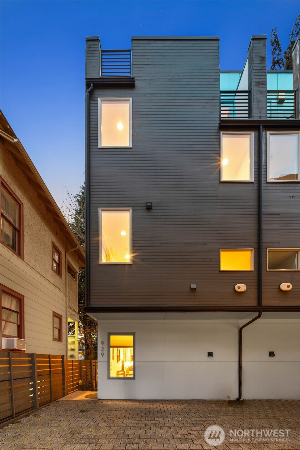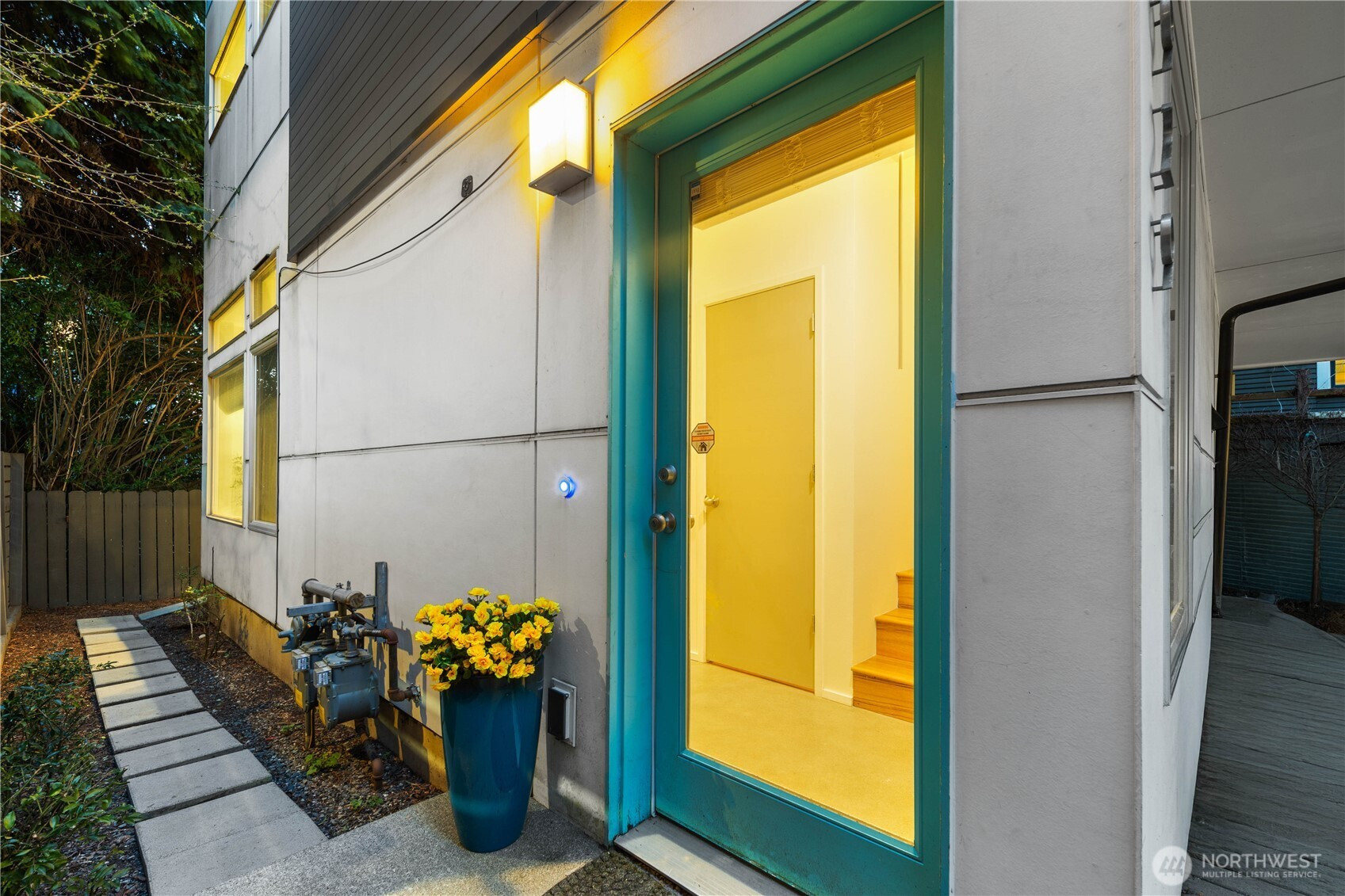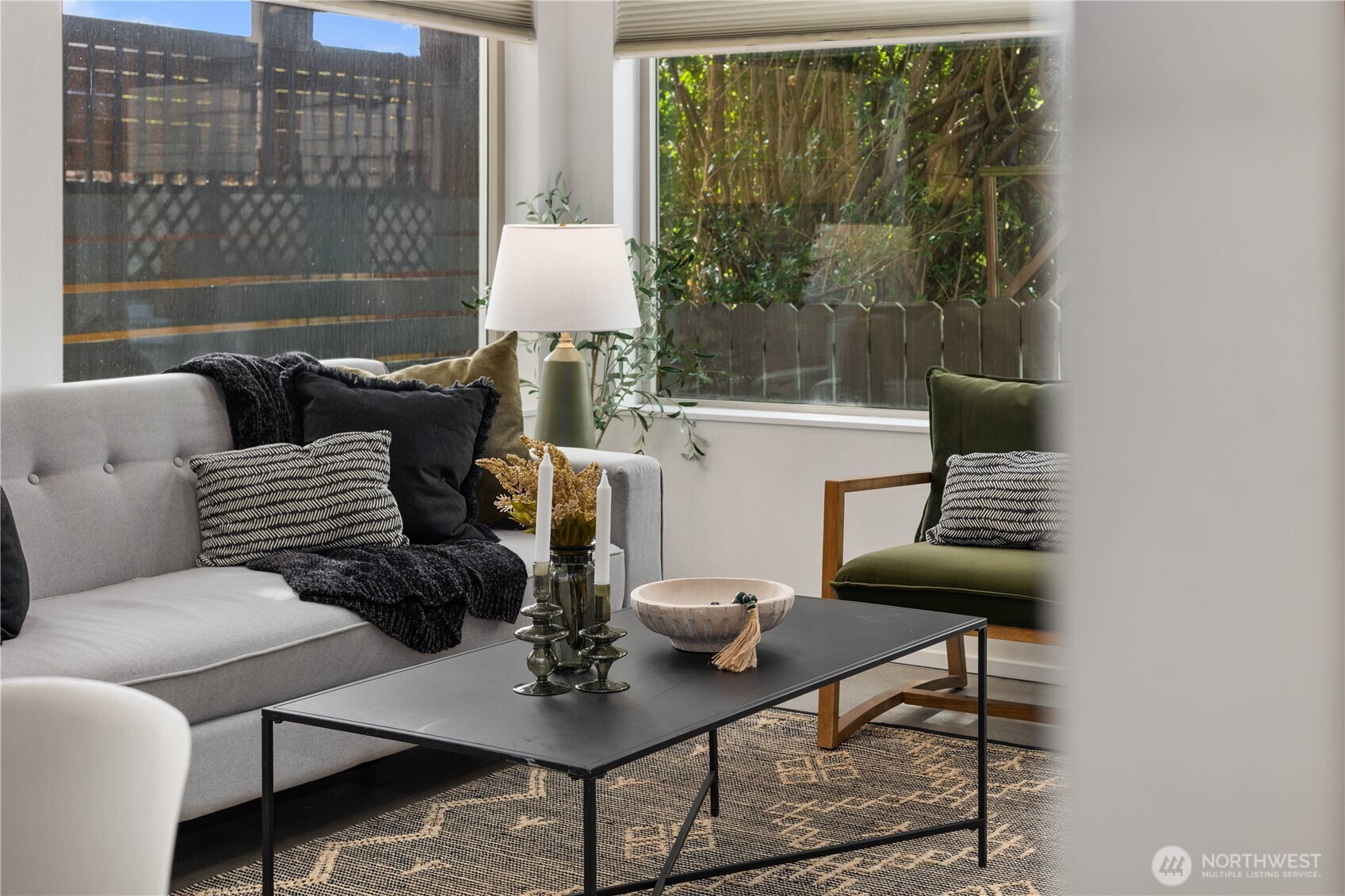 Tucked within a quiet courtyard, this thoughtfully designed 2-bedroom townhome offers a rare blend of peaceful privacy and exceptional urban access. Just moments from Seattle University and nearby restaurants, coffee shops, and boutiques, it delivers a true walkable city lifestyle with a Walk Score of 96. Built to exceed 4-Star Built Green standards, the home features a modern aesthetic with clean lines, open-concept living, and fresh interior/exterior paint for a move-in-ready finish. Expansive windows fill the space with natural light, creating a bright and welcoming atmosphere throughout. The flexible layout includes a bedroom and bathroom on each level, ideal for guests, roommates, or a dedicated home office. Comfort and efficiency are prioritized with radiant hydronic heating, HRV system, and upgraded insulation for year-round climate control and reduced energy use. The main level flows to a private patio off the kitchen—perfect for morning coffee or outdoor dining—while the rooftop deck offers city views and an inviting space for relaxing or entertaining. The primary suite provides a quiet retreat with a walk-in closet and well-appointed bath featuring a walk-in shower. Additional highlights include off-street parking, no HOA, and short-term rental potential, offering flexibility for both homeowners and investors. Pre-inspected for peace of mind, this low-maintenance home presents a rare opportunity in the heart of Seattle.