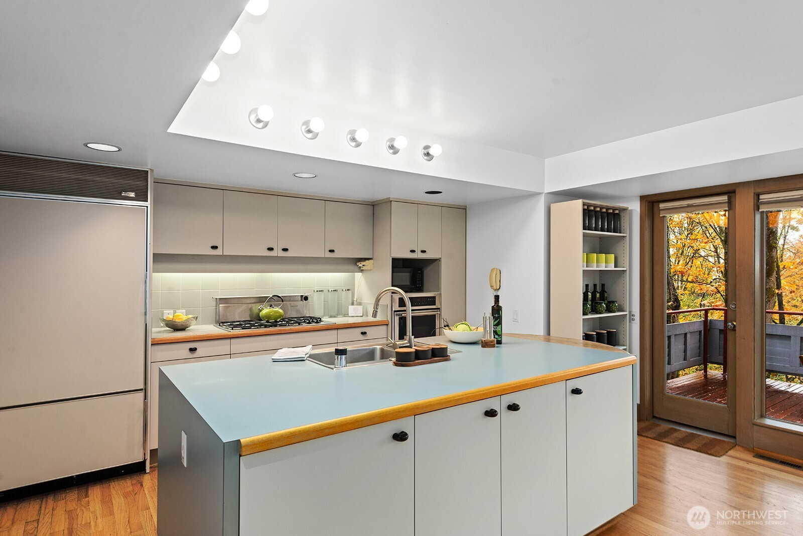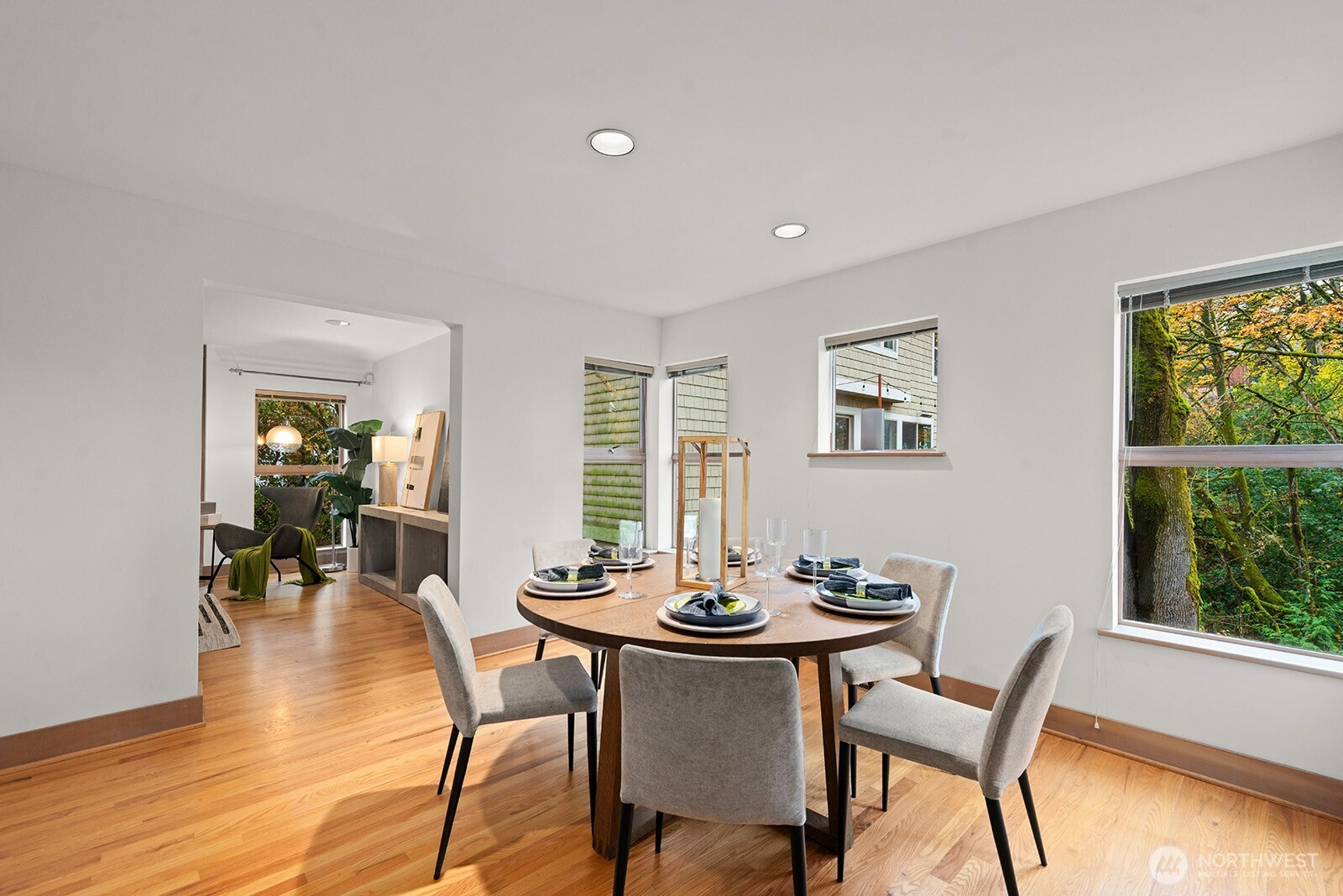 Special NW contemporary home designed by prominent Seattle architect Carolyn Geise to embrace nature. Home is on a corner lot with large windows that bring in natural light and expansive views of Madrona Woods & Ravine. Dramatic entry w/ tiled floors and an open staircase to the upper floor. Lovely living spaces with hardwood floors, a gas fireplace in the living room, and the kitchen with a large eating area. Upstairs has two spacious bedrooms w/ walk-in closets, a full bathroom between the bedrooms - jetted tub and a separate shower, and the laundry room. Lower level w/ a large bonus room (office, studio, exercise), a third bedroom and a 3/4 bathroom. Decks off the lower and main levels. 1-car garage with work space. Fabulous location!