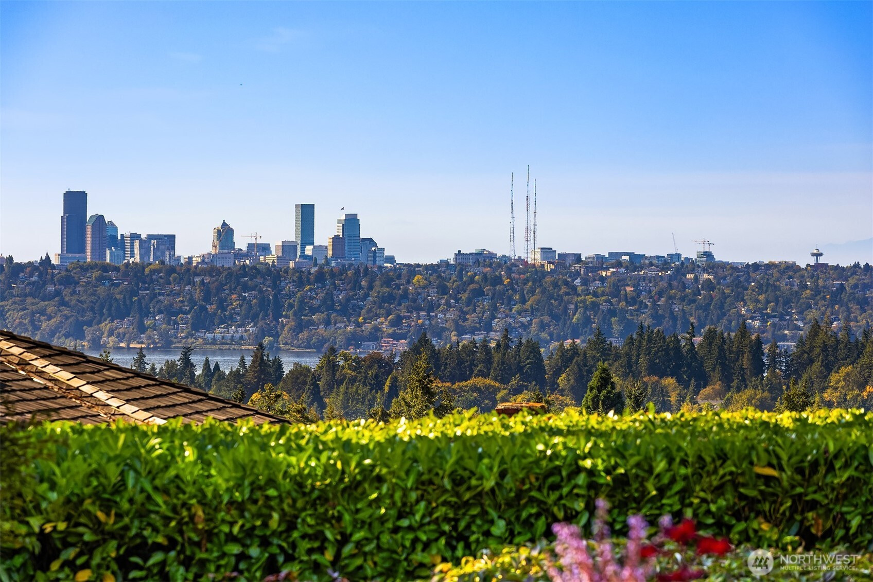 Northwest Modern Meets Panoramic Grandeur. First time to market architectural treasure in Clyde Hill, crafted by renowned Ralph Anderson, exemplifying modernist Northwest style. Situated in Clyde Hill's most private cul-de-sac, the home rests on a flat, oversized, secluded lot of 19,498 square feet, surrounded by mature landscaping. This custom-built residence offers 3,437 square feet of harmonious living with its extensive use of wood, exposed framing, and broad windows celebrating the natural beauty, framing captivating views of the Seattle skyline, Bellevue, Mount Rainier, and the Olympic Mountains. Enjoy seamless indoor-outdoor living, while taking in breathtaking grand sunset views…the perfect blend of sophistication and tranquility.