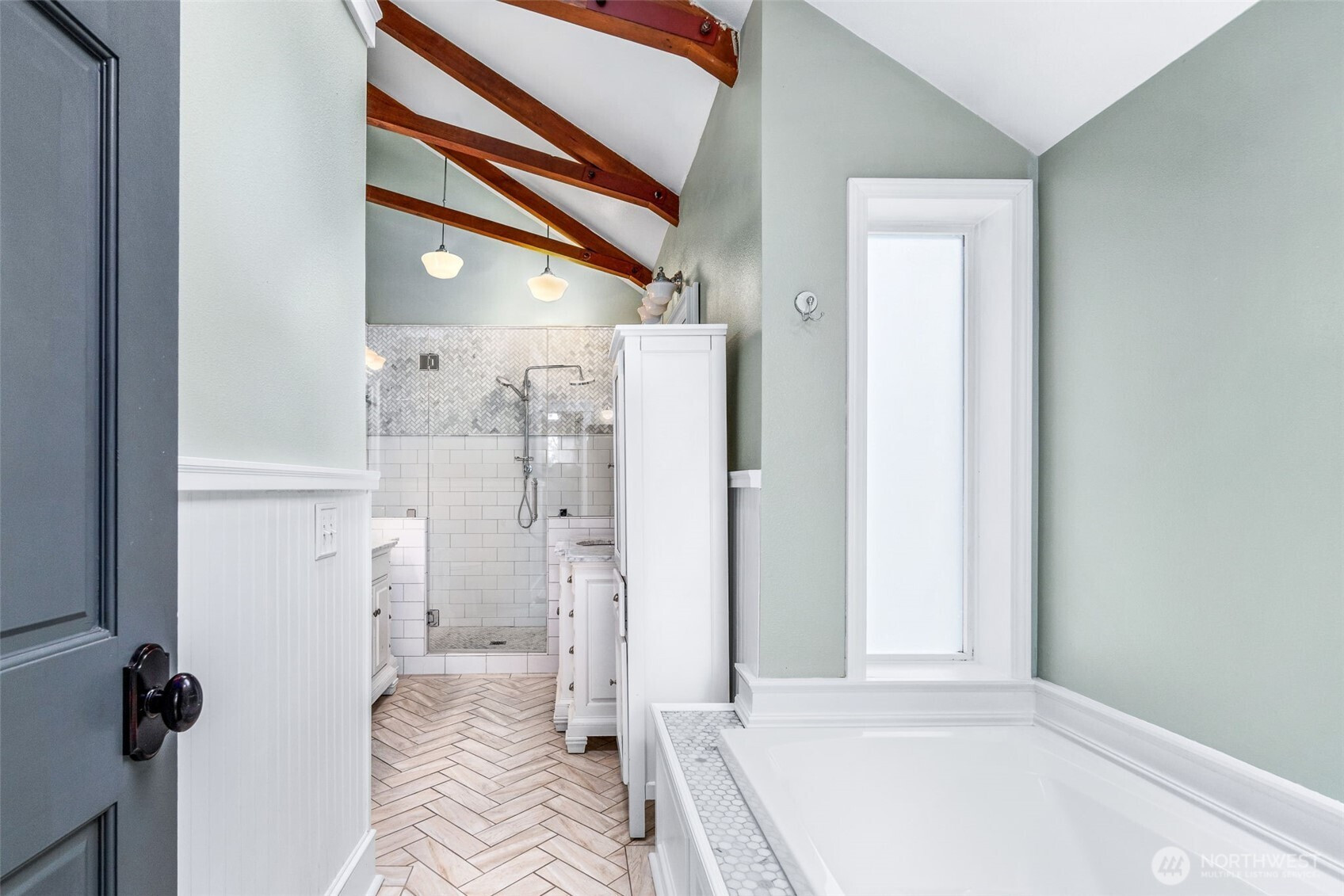 (503) 893-8874Upper condo in beautifully renovated two-unit Craftsman located in Crown Hill. This light-filled home features vaulted, exposed wood-beam ceilings and hardwood floors. Thoughtfully designed chef’s kitchen includes a wine fridge, pantry, farmhouse sink, and opens seamlessly to living and dining areas, and a sun-filled deck—ideal for entertaining. Serene primary offers soaring ceilings and a luxury bath with jetted tub. With 5 bedrooms & 3.5 baths, there is exceptional space and flexibility. Additional highlights include 2 gas fireplaces, mudroom with built-ins, and central A/C. Detached 2-car garage, plus off-street parking. Enjoy access to shared gated pool, all just minutes from Met Market, Trader Joe’s, QFC, parks, and top-rated schools.