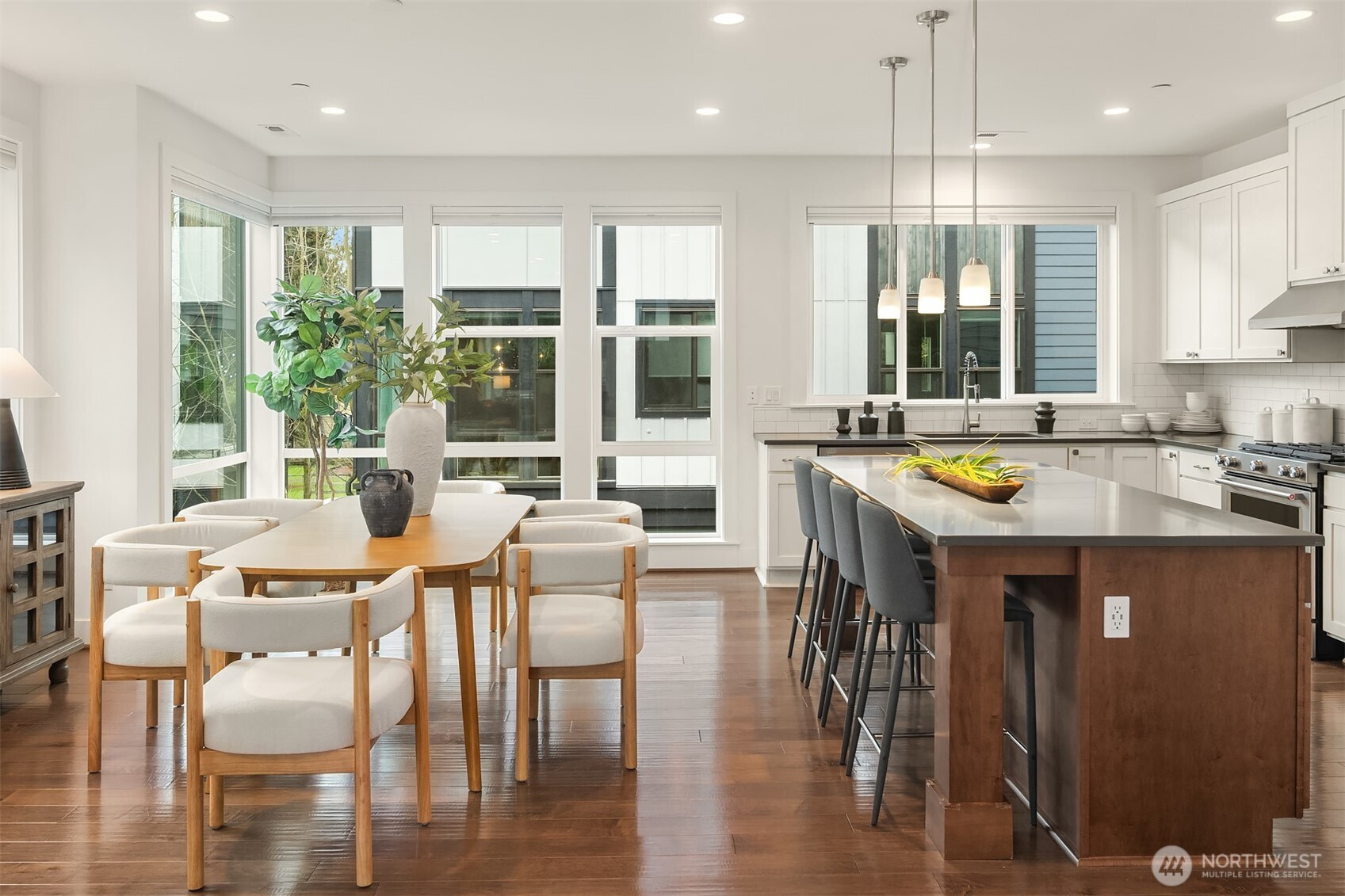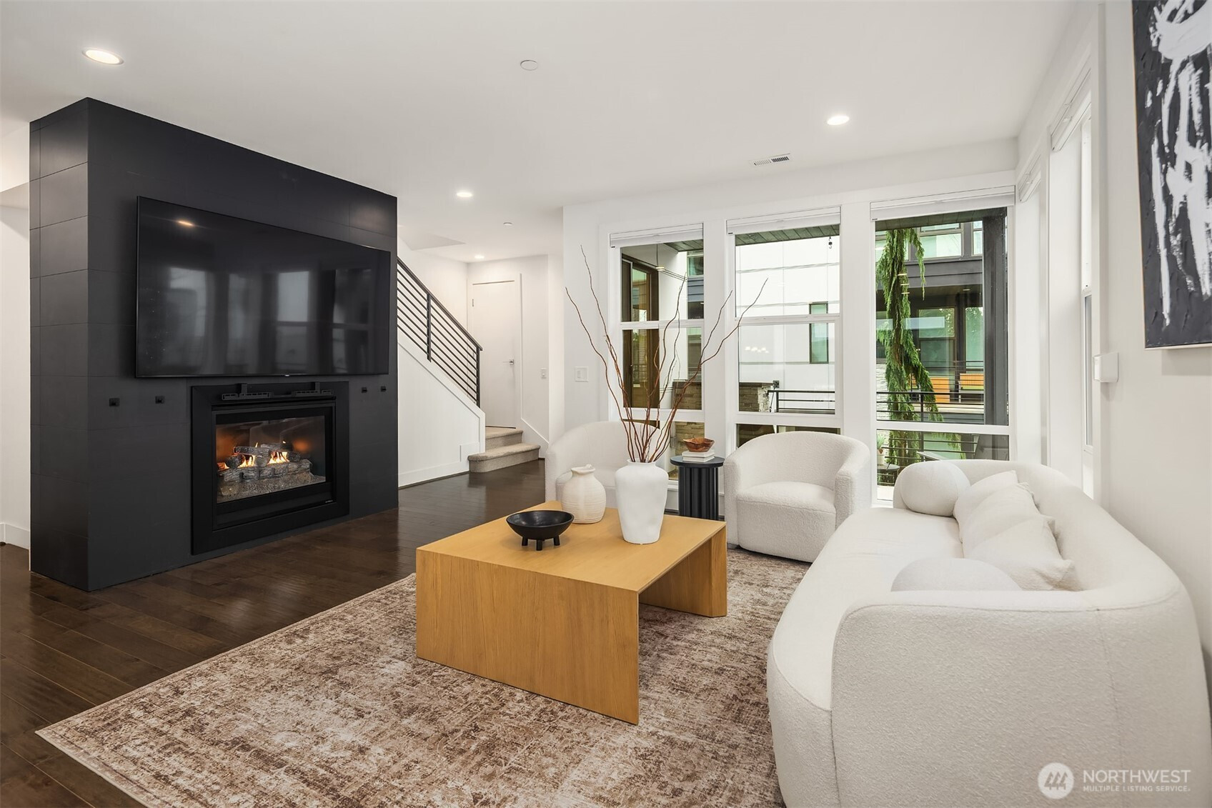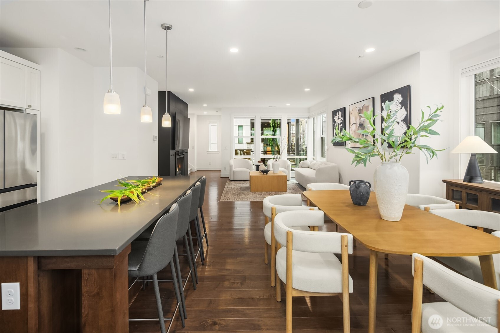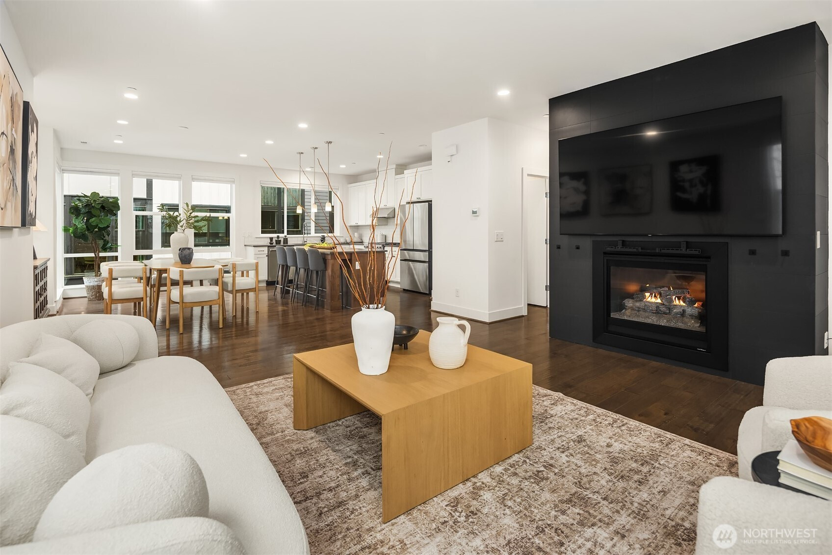 Contemporary corner unit urban townhome w/luxury finishes in vibrant Downtown Bothell. Expansive floor-to-ceiling windows & Toll Brothers signature 9-ft ceilings flood the home w/natural light. Open-concept main floor showcases a chef's kitchen w/abundant cabinetry, a large island & SS appliances, a sleek tiled gas fireplace & a covered balcony. Spacious primary suite offers a spa-like bath & walk-in closet. A versatile flex office/guest bedroom w/en-suite bath on lower level. Additional highlights include laundry room & 2nd W/D set on top level, central A/C, custom Elfa closet system throughout, smart Lutron shades & fresh paint. Coveted Northshore SD. Minutes to I-405 & UW Bothell. Steps away to restaurants, shops, parks & trails.