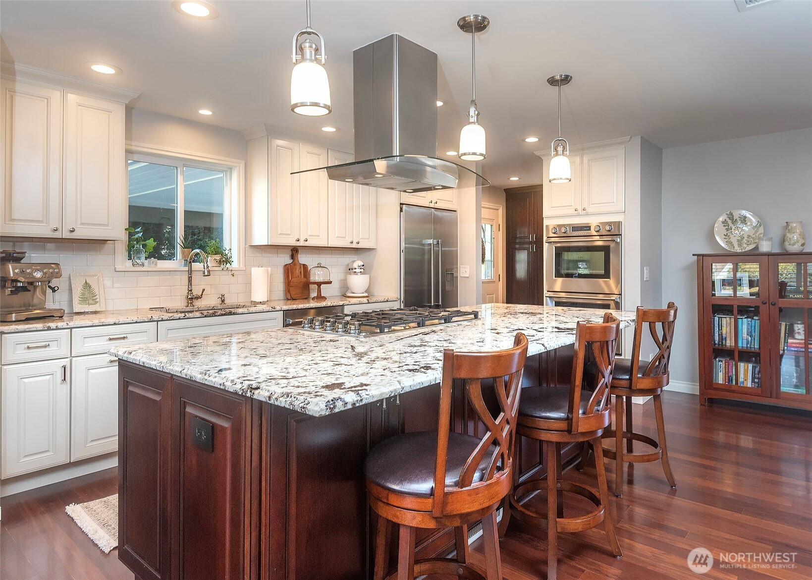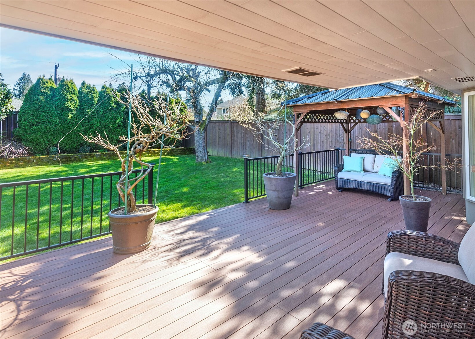 Beautifully remodeled Crown Hill Rambler. Open floor plan w/ 2-sided fireplace. One side Gas. One side Wood. Eucalyptus hardwood floors and cozy carpeted bedrooms. A Chef’s kitchen with high-end appliances and an extra-large granite counter top island. Windows stretch across the front of the house for maximum sunshine. Super nice Shutter Style Wood Slat Blinds through out the house. Full-sized dining and living room, with a family room tucked behind the fireplace. Full bath has beautiful heated Italian floor tiles. Partially-covered deck and structurally supported hot tub area with power hooked up. Plus Gas Grill hook up. A pass-through carport, perfect for unloading groceries through the side door on a rainy day. There is also a oversized 2-car garage. The extra big garage would make a nice DADU, if desired. The yard is partially fenced. Really nice semi-circular driveway for additional parking and drive through. Mature landscaping adds to privacy.