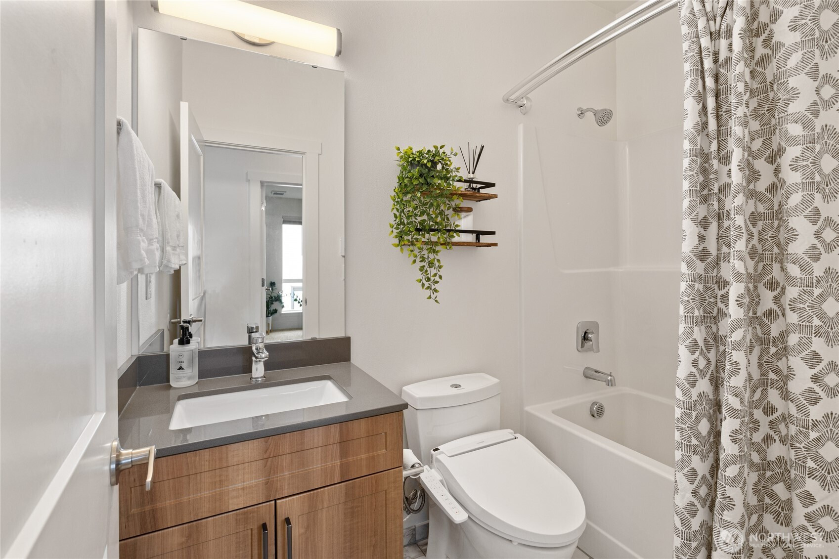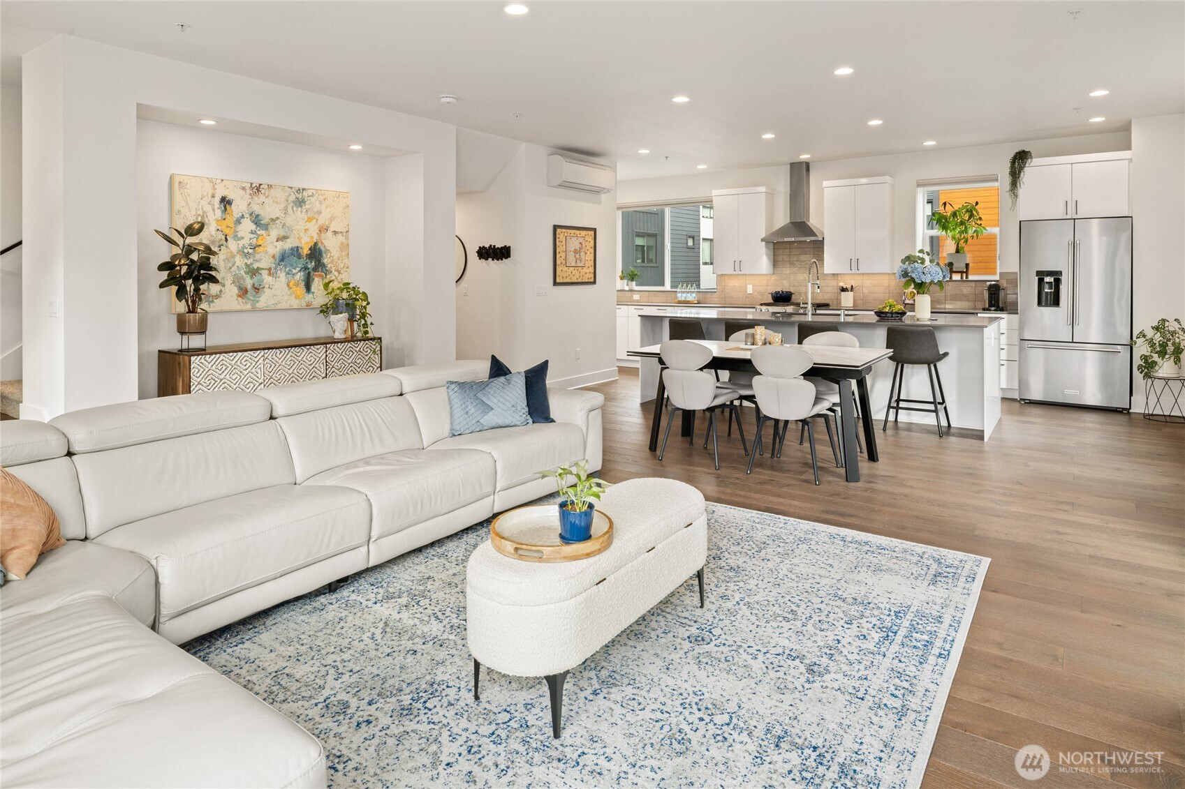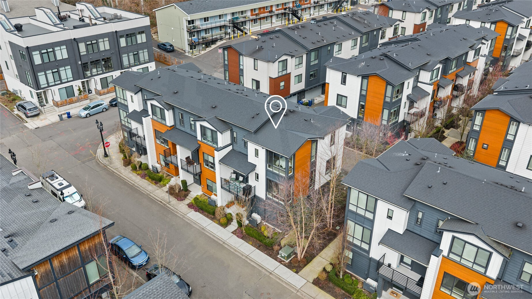 A home warranty and buyer credits are offered with this modern four-bedroom corner townhome at The Landing in downtown Bothell. Privately situated on a quiet street within a vibrant, walkable community, this impeccably maintained residence is cohesively designed and completely turnkey. A welcoming entry on the first floor offers access to a private guest bedroom suite complete with a large closet/storage and full bath. The second-level open-concept main floor is filled with natural light through dramatic floor-to-ceiling windows and features a gourmet chef’s kitchen with oversized quartz island, built-in beverage cooler, gas range, ample counter space, and stainless steel KitchenAid appliances. Step out to the covered deck for year-round BBQs or to simply relax and unwind. The third floor retreat features three spacious and bright bedrooms, including a luxurious primary with generous walk-in closet and spa-inspired ensuite with motion sensor under-cabinet lighting and private water closet. Smart-home features include a tech panel, whole-home network cabling, smart locks and two-car smart garage with EV charging. Custom top-down/bottom-up blinds throughout, soft-close cabinets, hypoallergenic carpet and 9ft ceilings make for comfortable living. Several guest parking spaces are reserved for the community in addition to street parking. Steps to Downtown Bothell restaurants, shopping, parks and transit. Northshore School District.